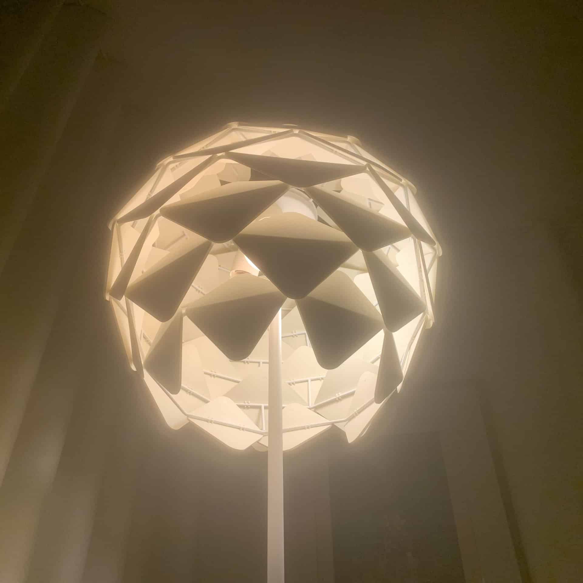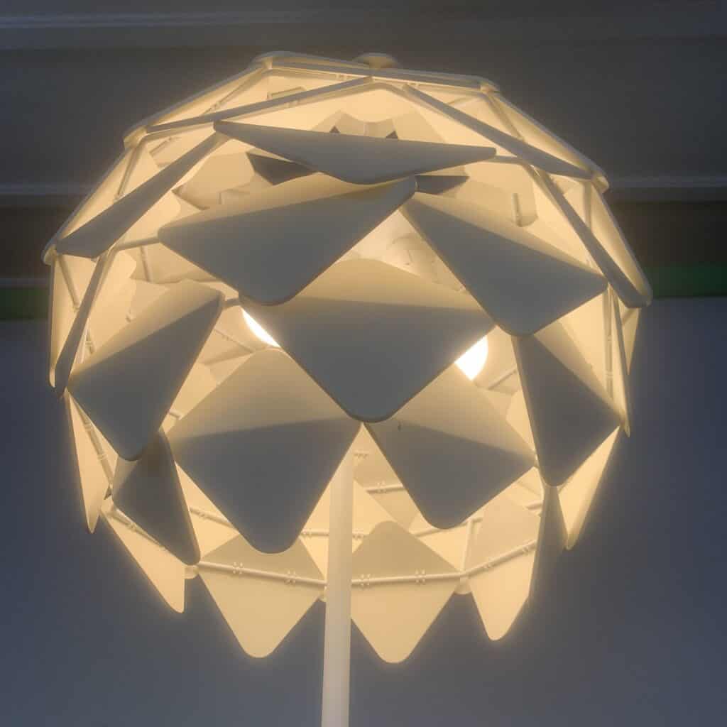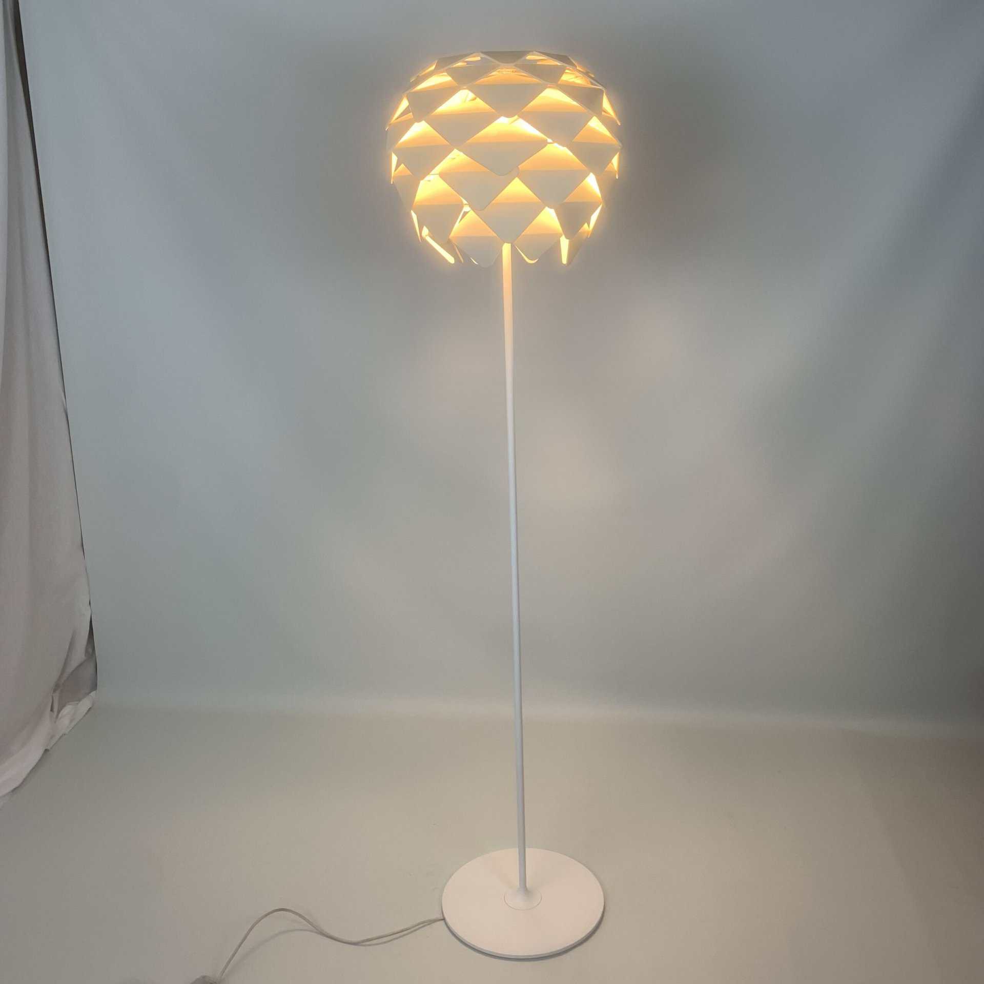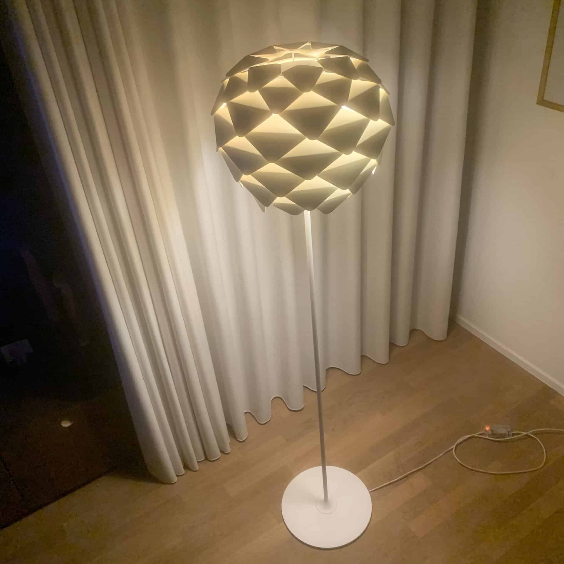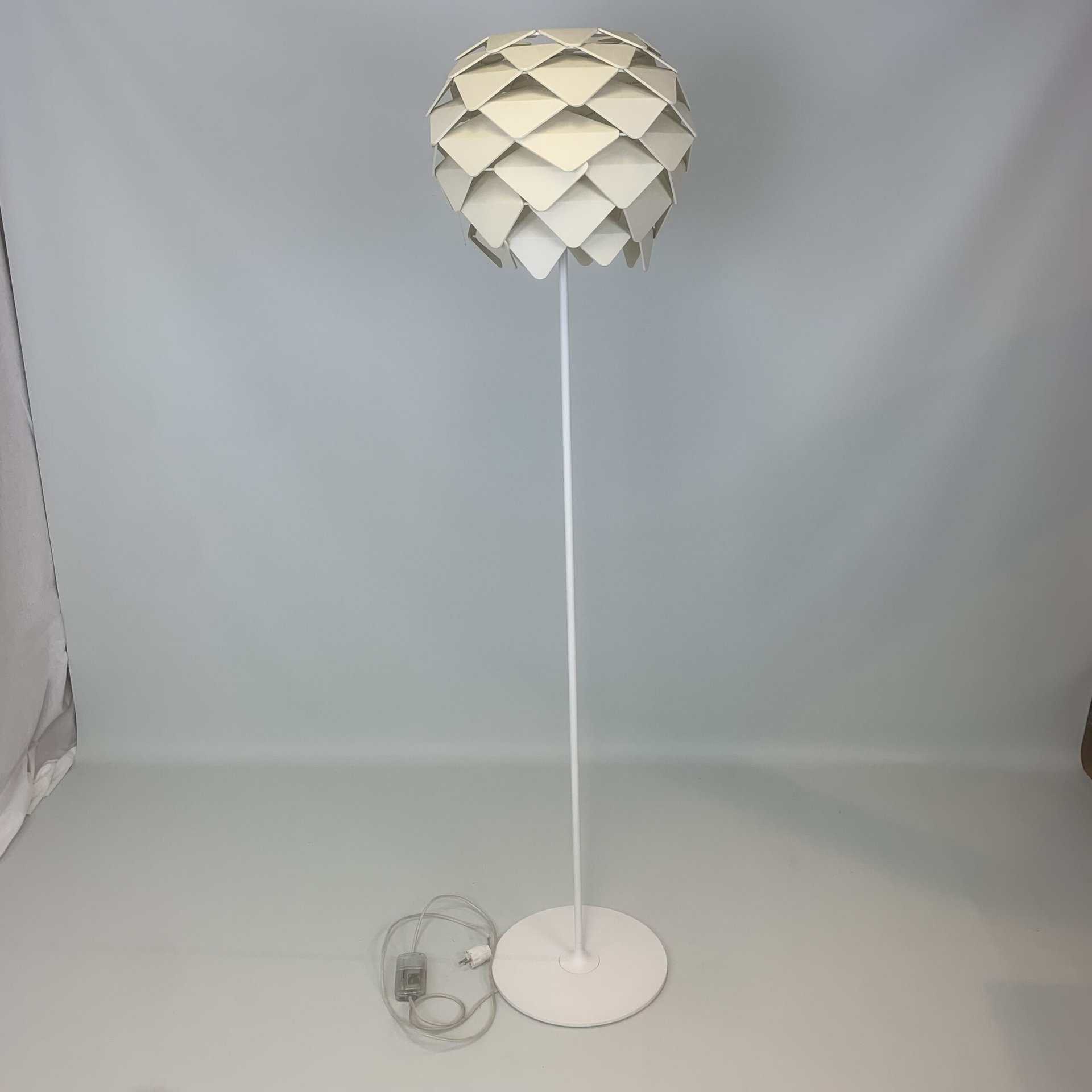 This floor lamp with dimmer has white lacquered metal base and a lampshade composed of removable grey plastic diamond-shaped slats in ABS