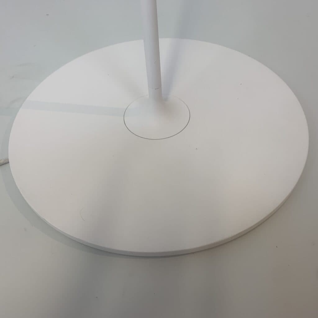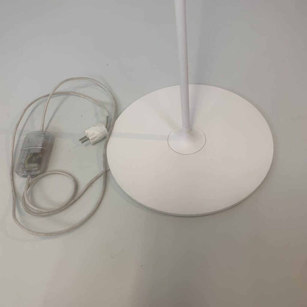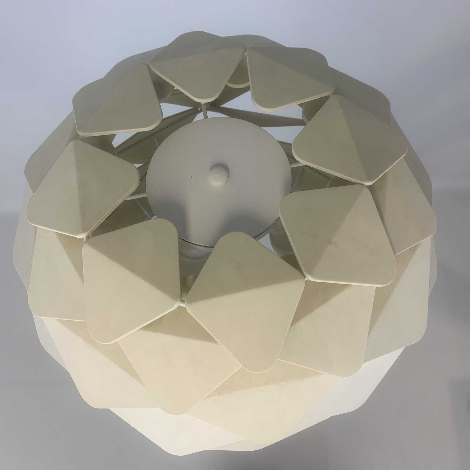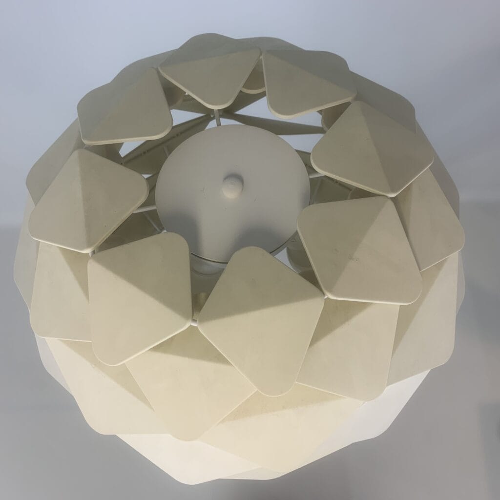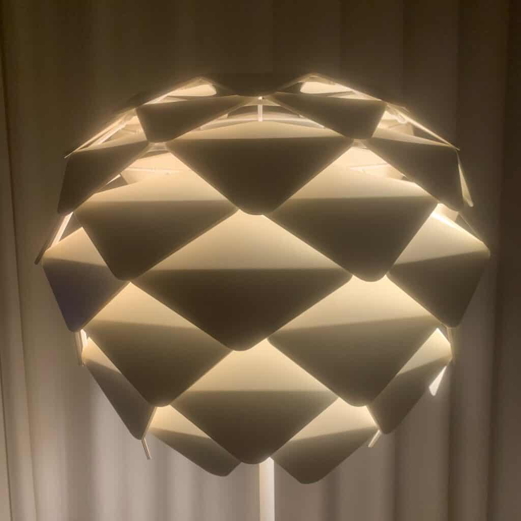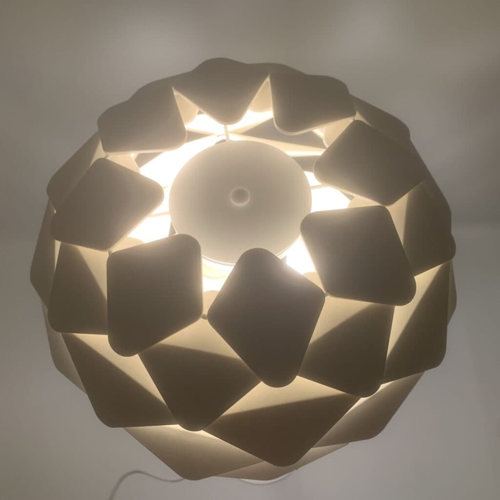 This floor lamp with dimmer has white lacquered metal base and a lampshade composed of removable grey plastic diamond-shaped slats in ABS
