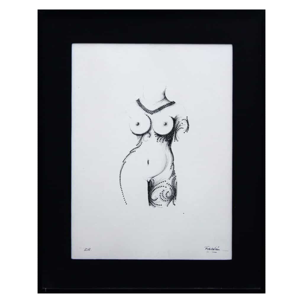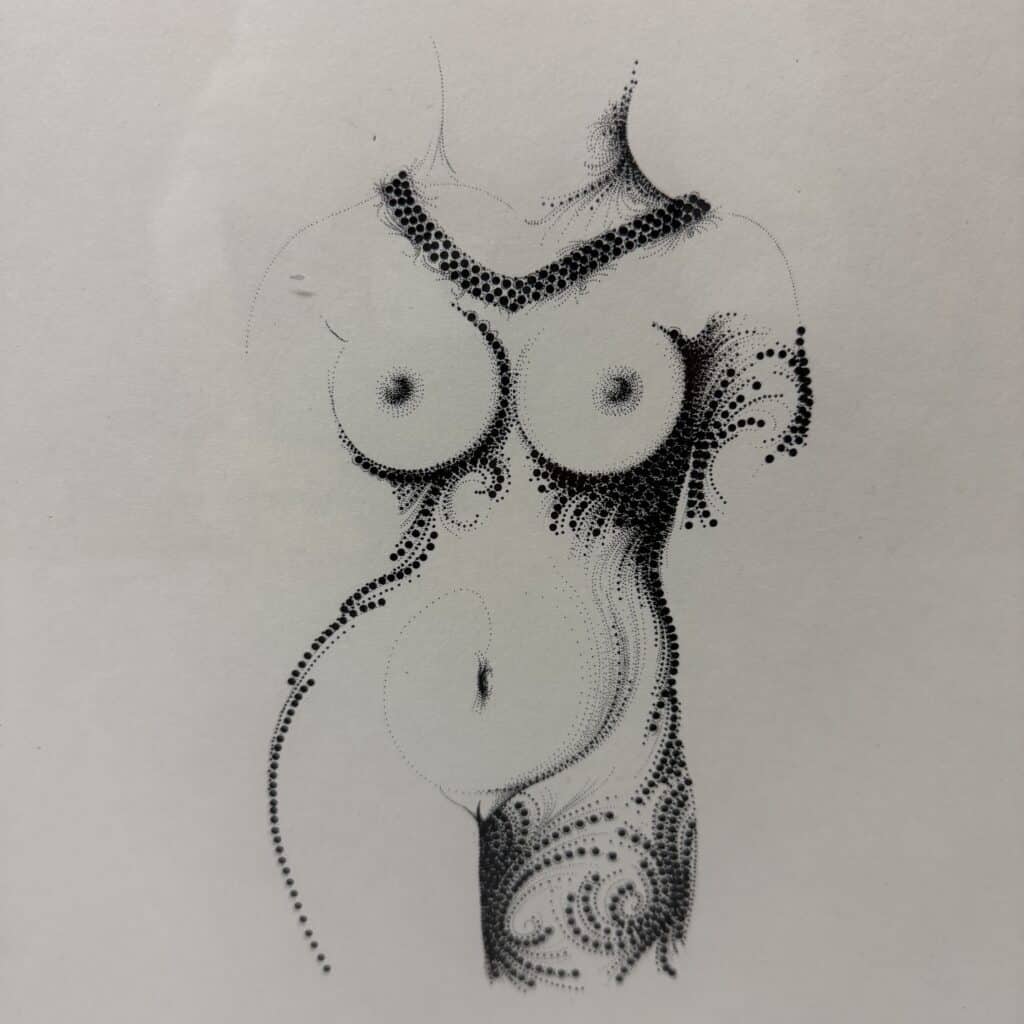 The work depicts a woman’s body from the neck to the thighs. It is striking that the silhouette has no arms. The work is composed of dots of varying thicknesses.