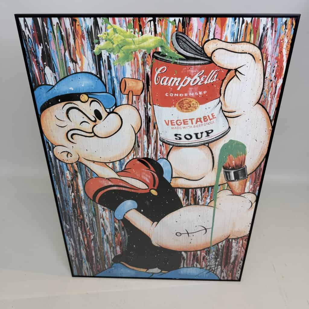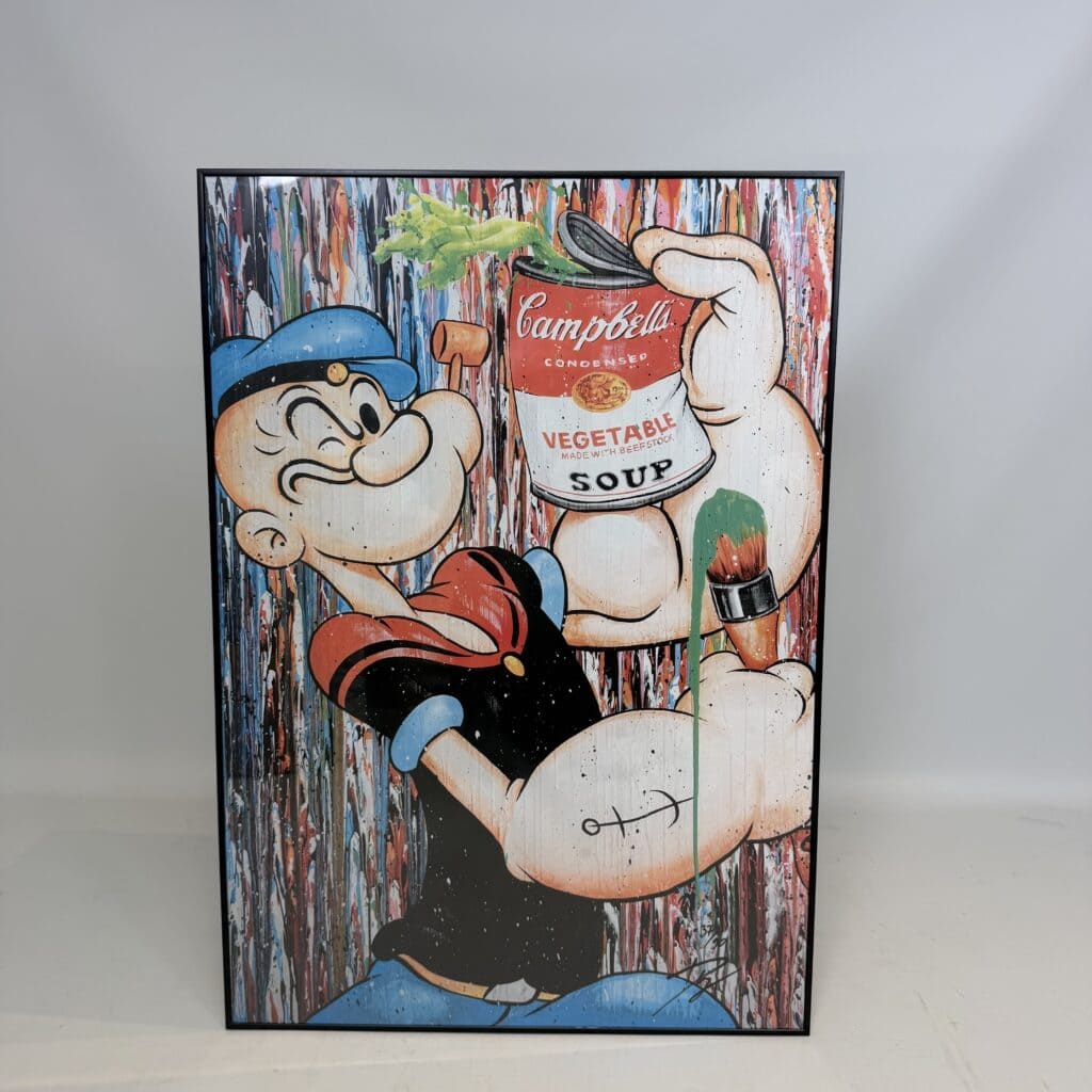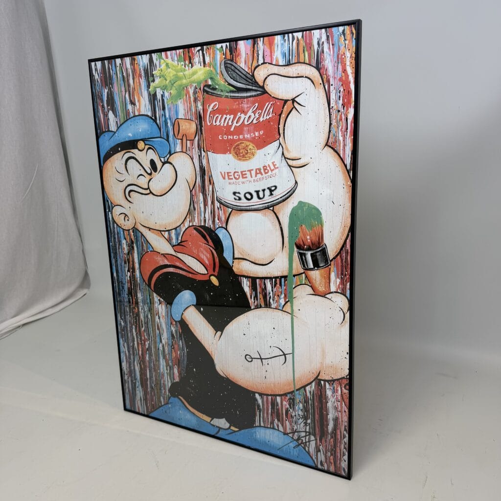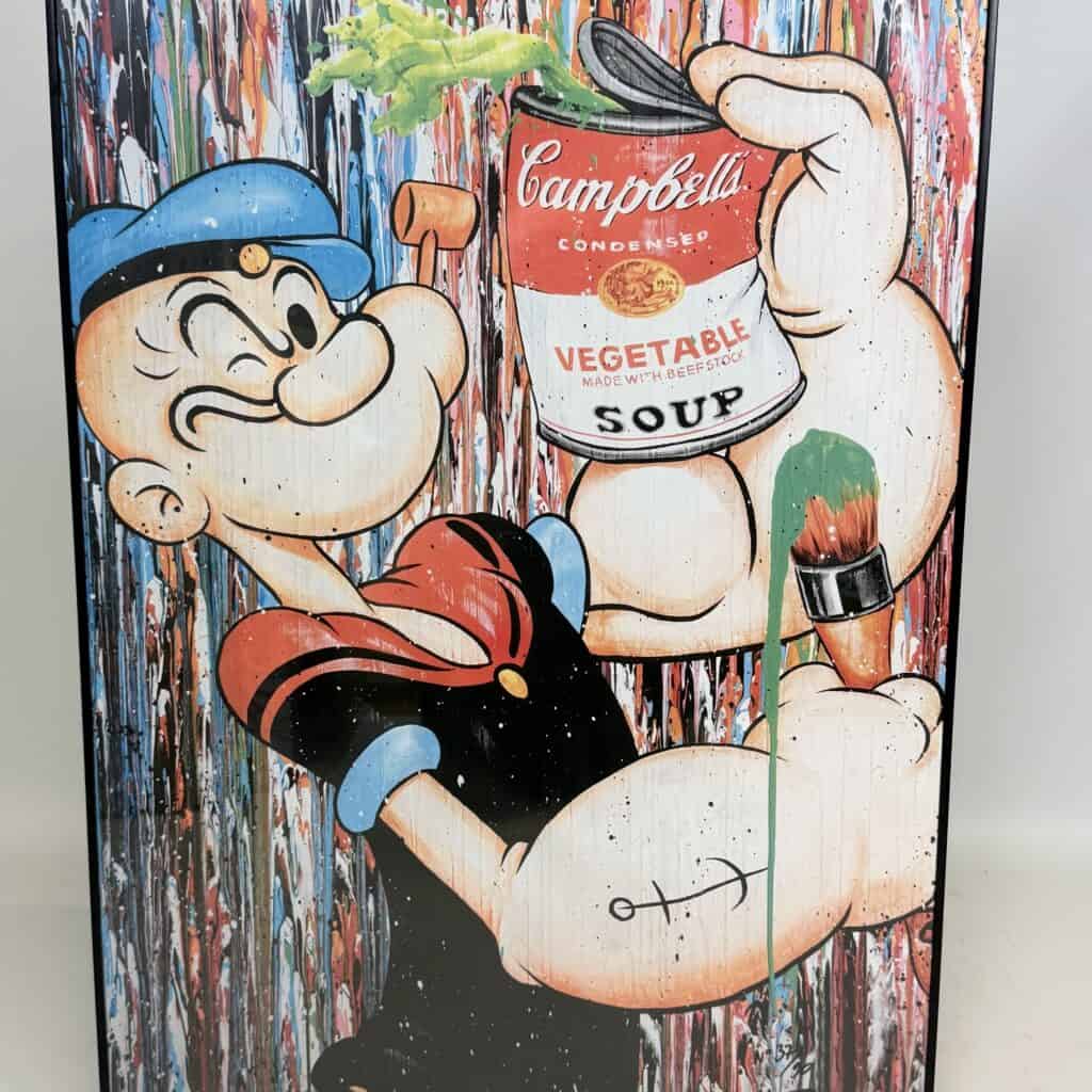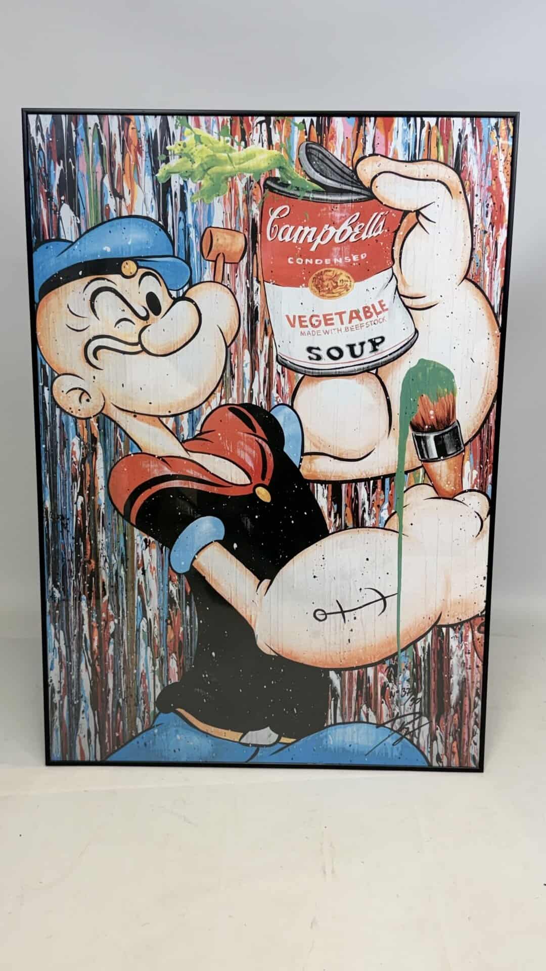 The artwork combines two iconic elements of American pop culture: the cartoon character Popeye and the famous Campbell’s soup cans