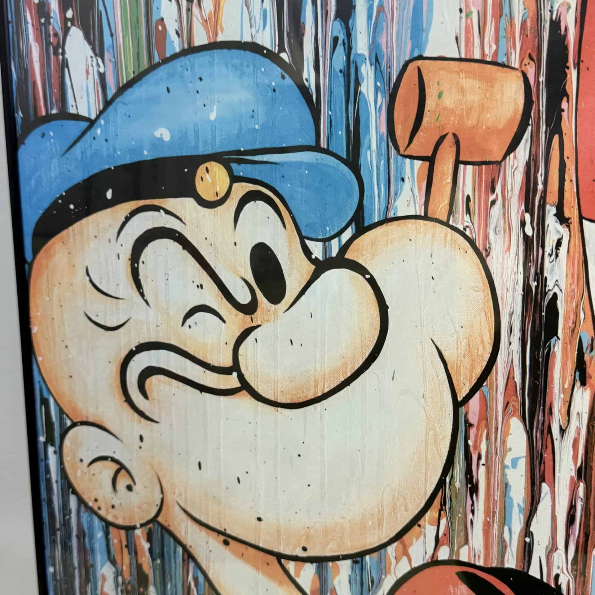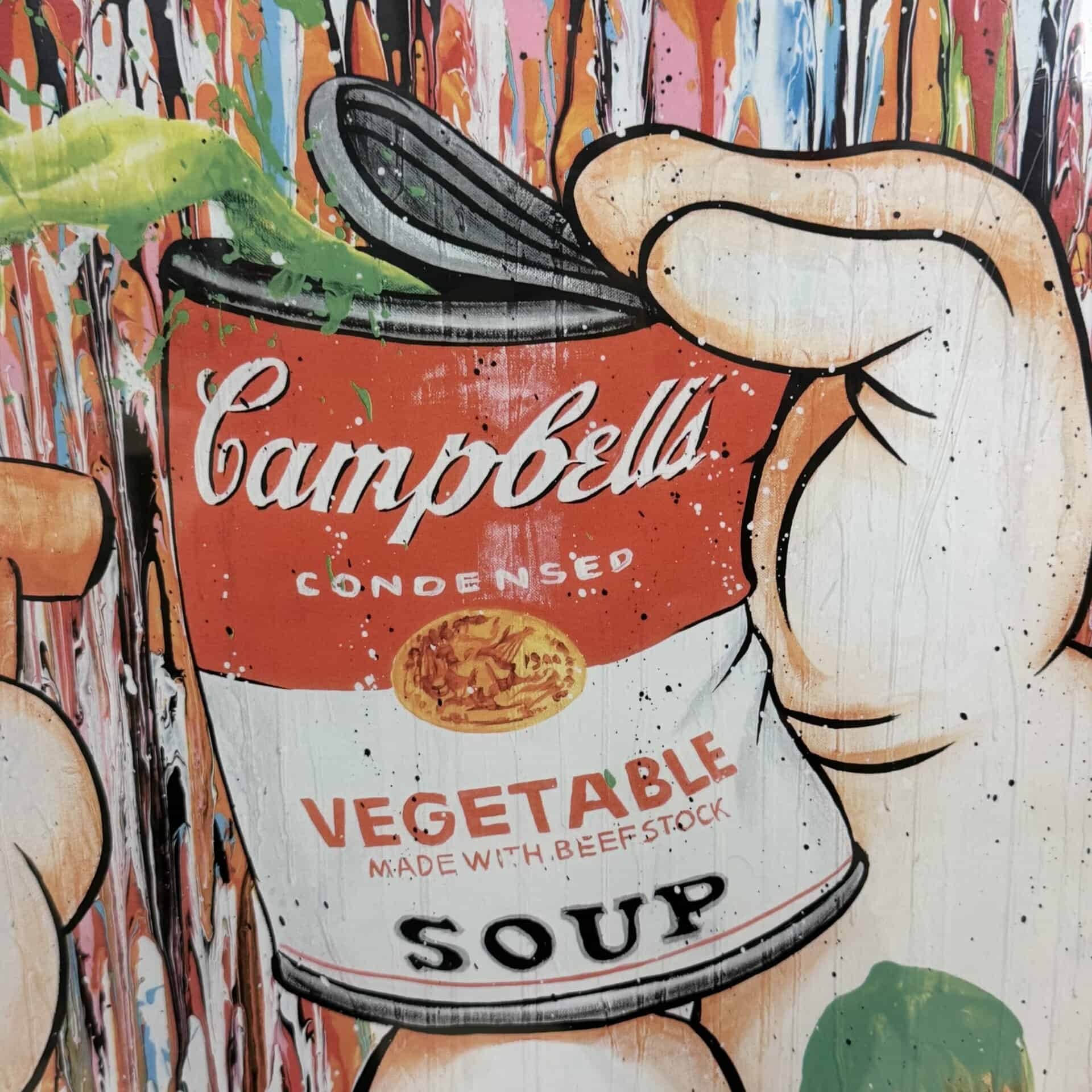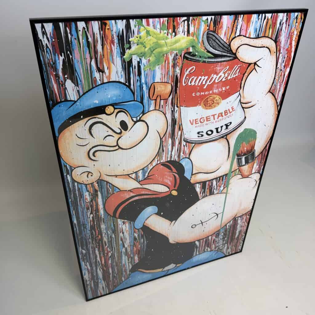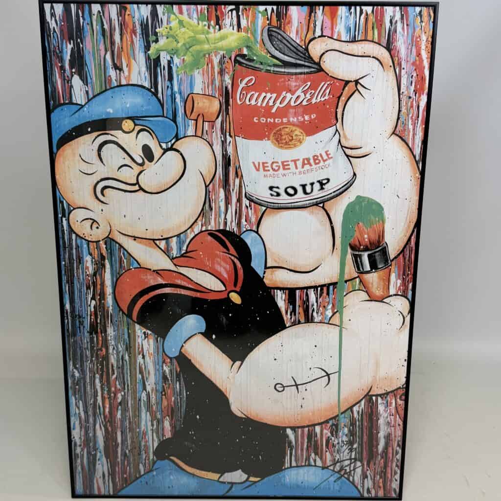 The artwork combines two iconic elements of American pop culture: the cartoon character Popeye and the famous Campbell’s soup cans