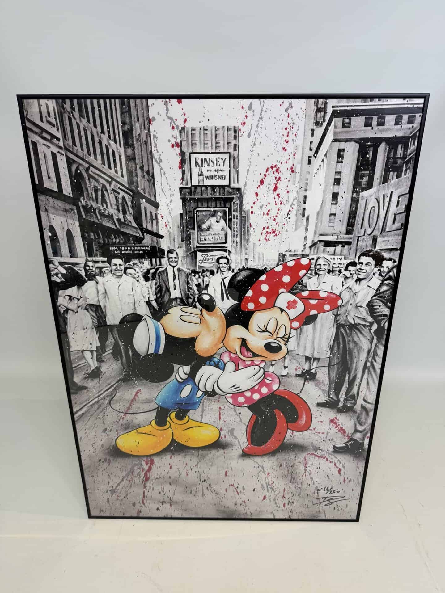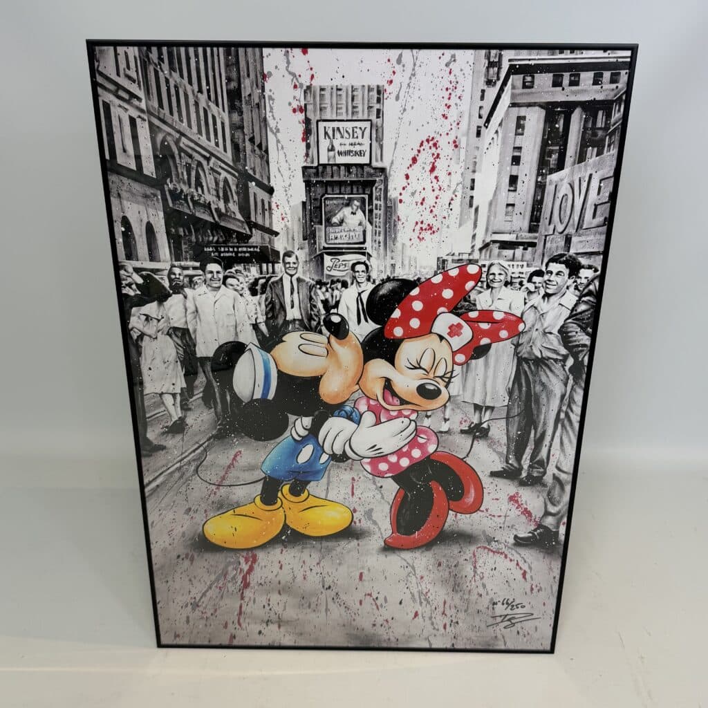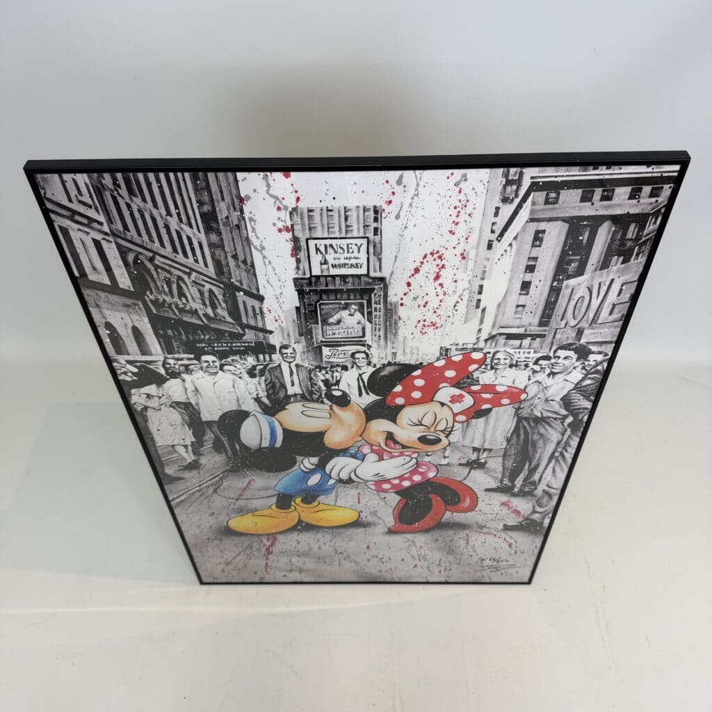 This artwork shows the black-and-white New York City backdrop featuring Mickey and Minnie Mouse