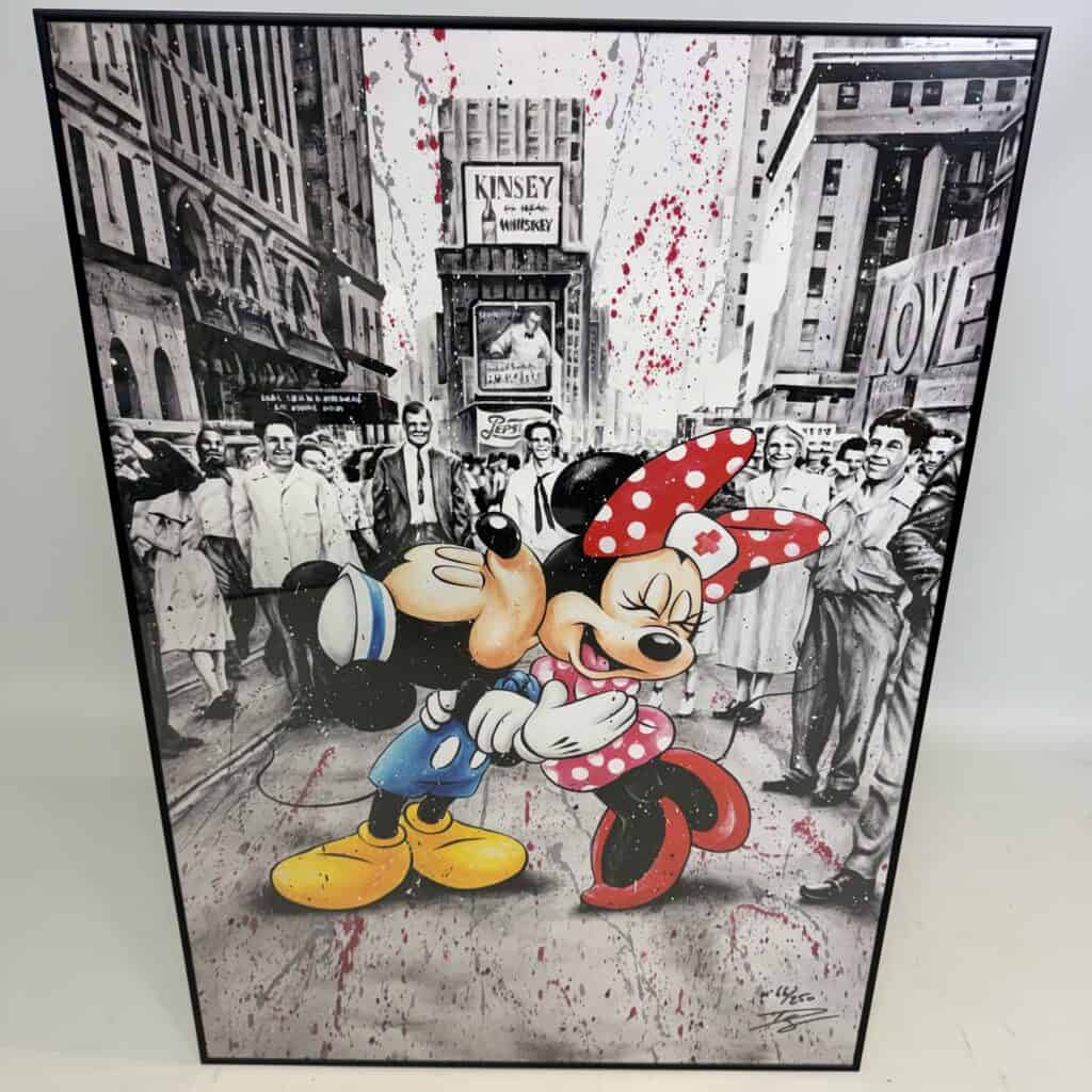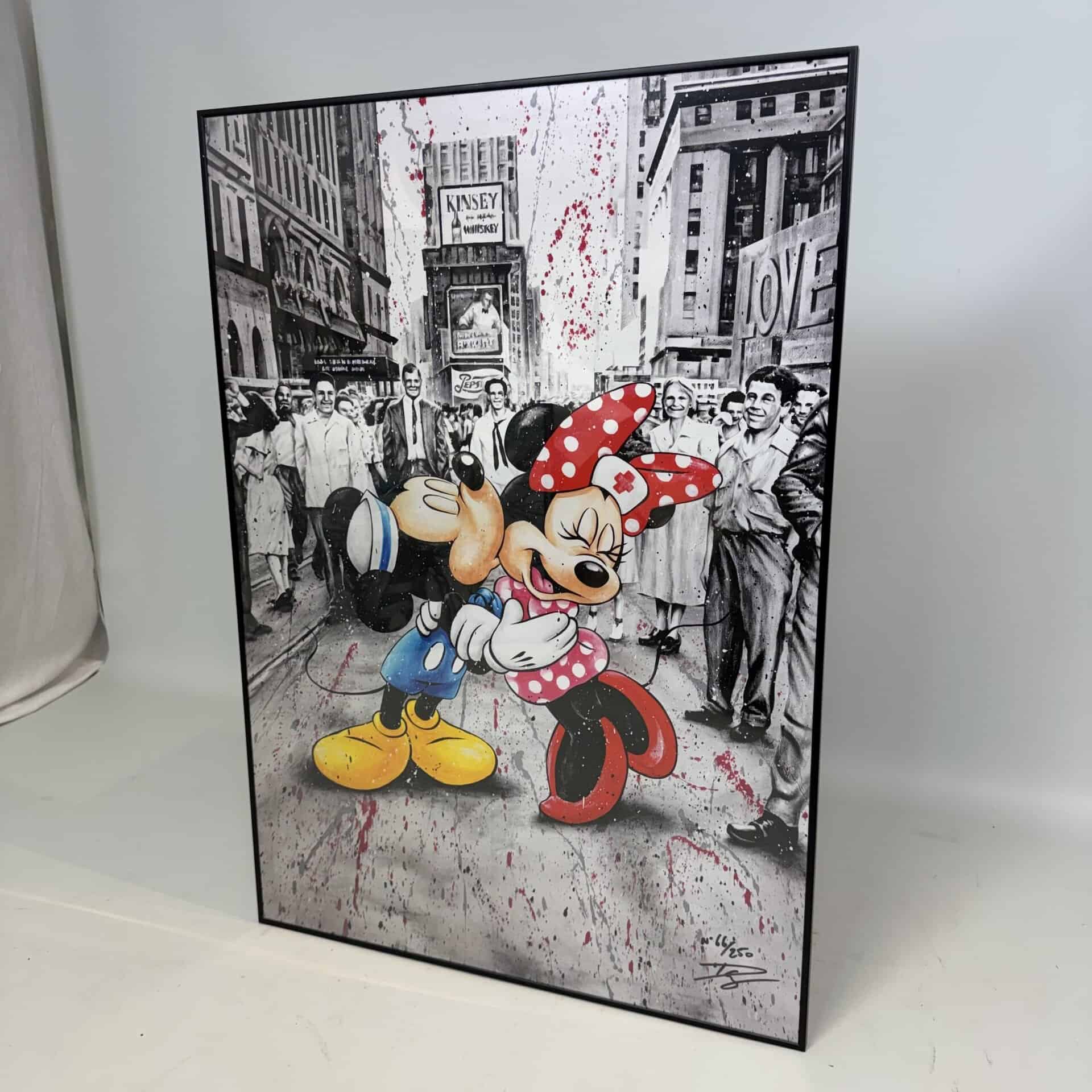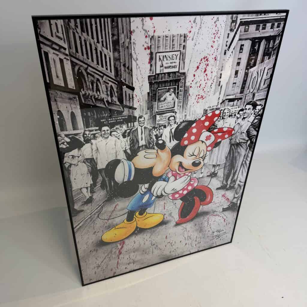 This artwork shows the black-and-white New York City backdrop featuring Mickey and Minnie Mouse