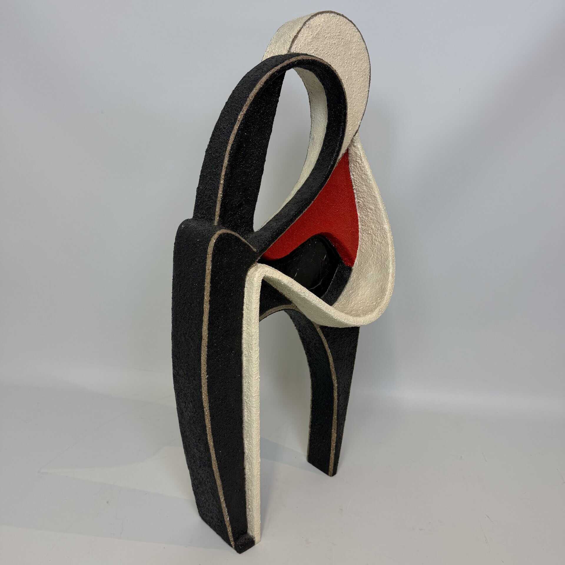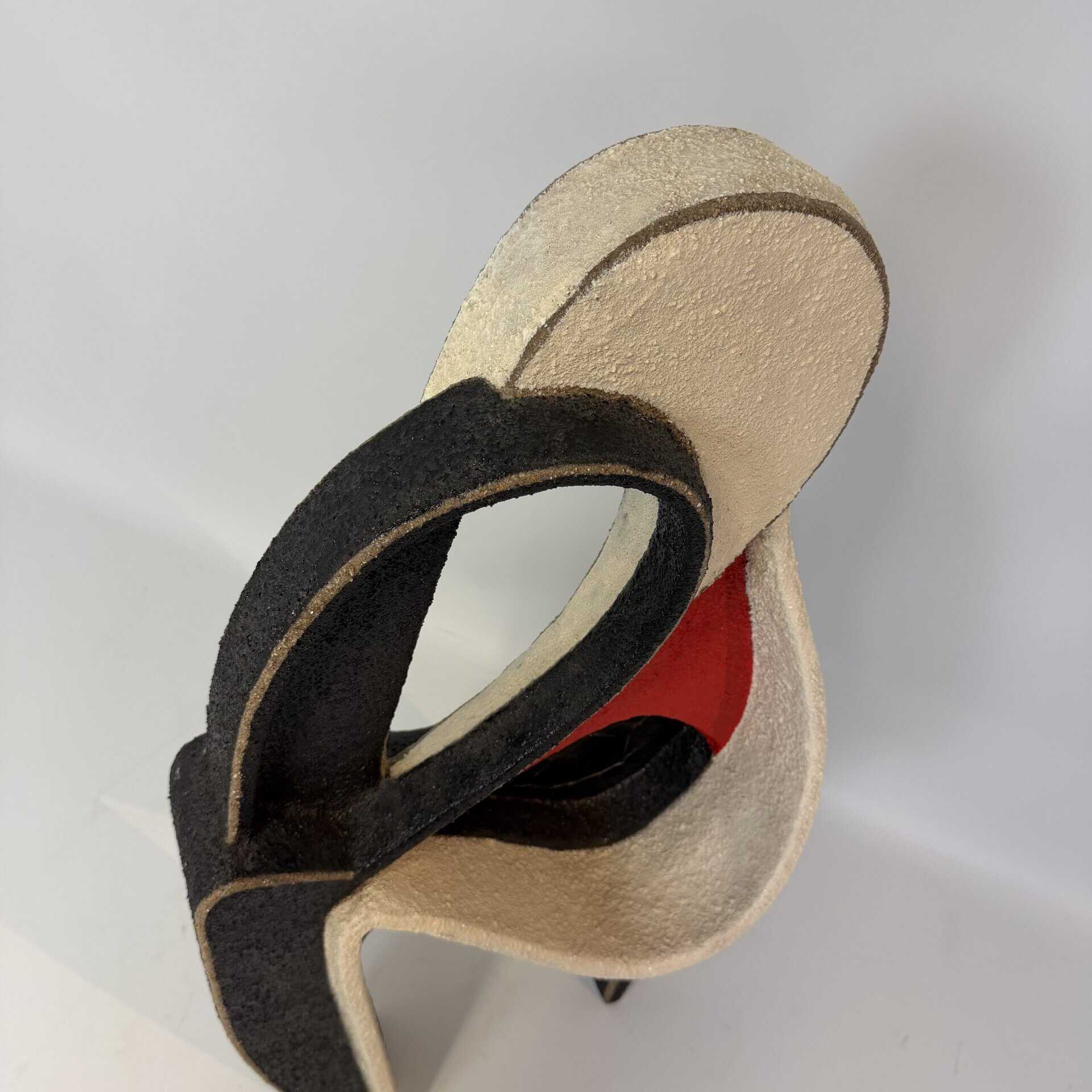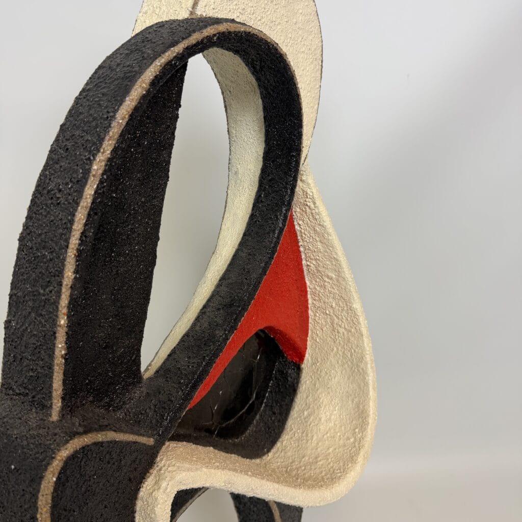 Abstract, free-standing sculpture with fluid organic shapes, curving lines that create an intertwined form, suggestive of two figures embracing shape with internal voids evoke modern, minimalist aesthetics