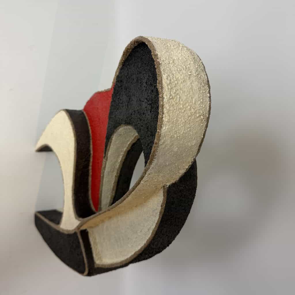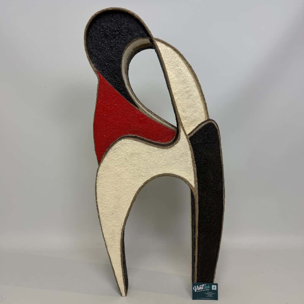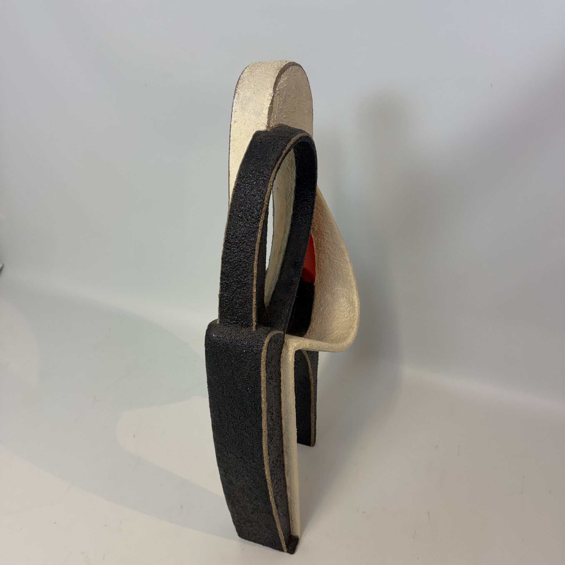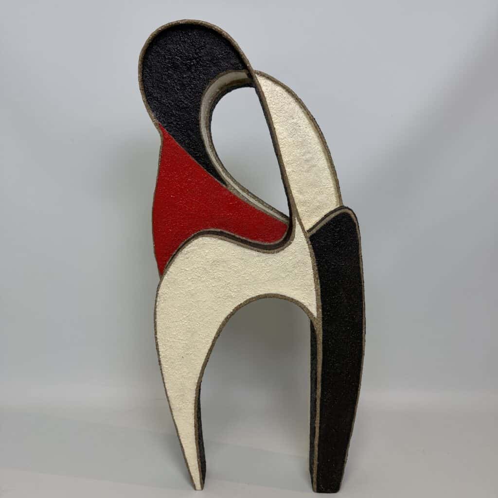 Abstract, free-standing sculpture with fluid organic shapes, curving lines that create an intertwined form, suggestive of two figures embracing shape with internal voids evoke modern, minimalist aesthetics