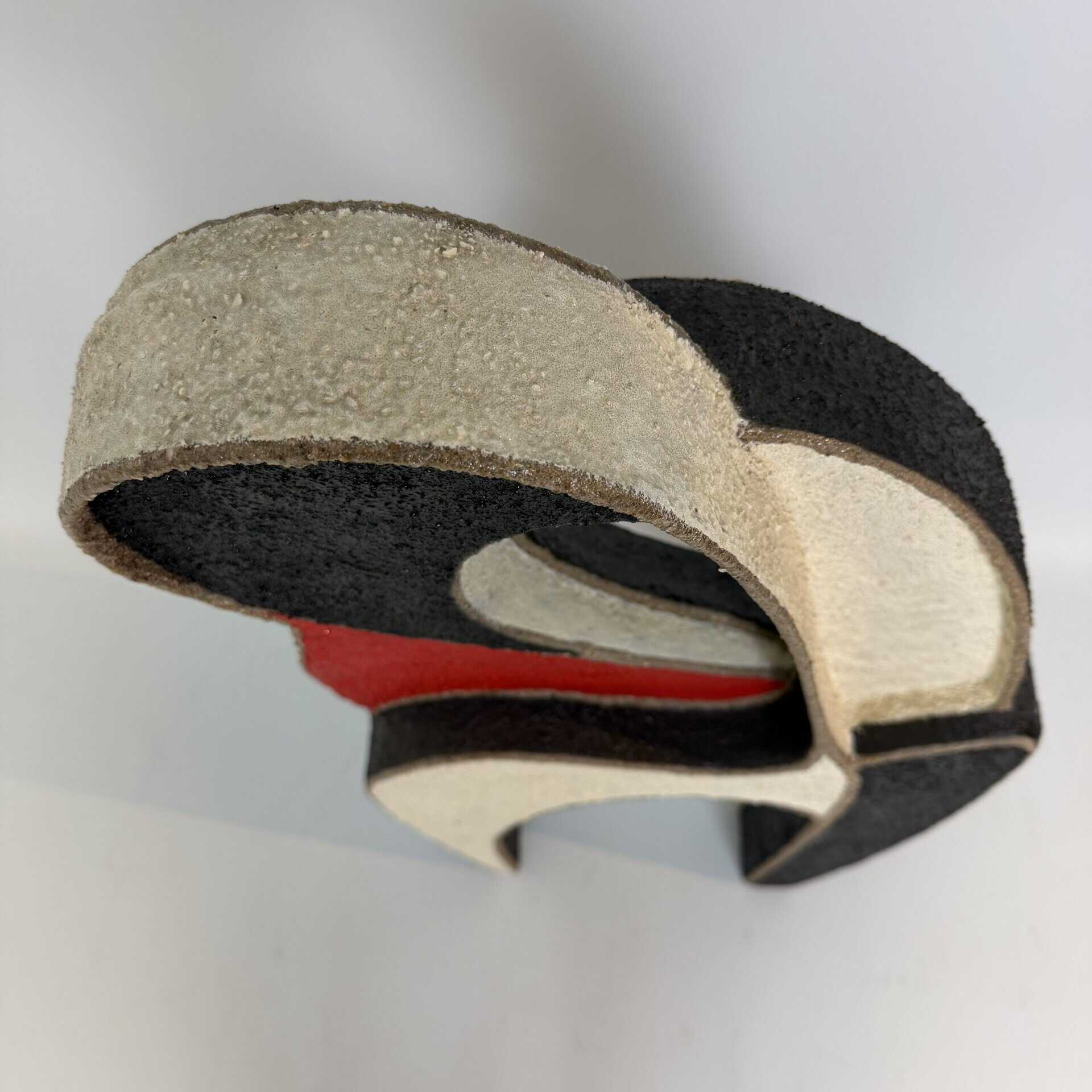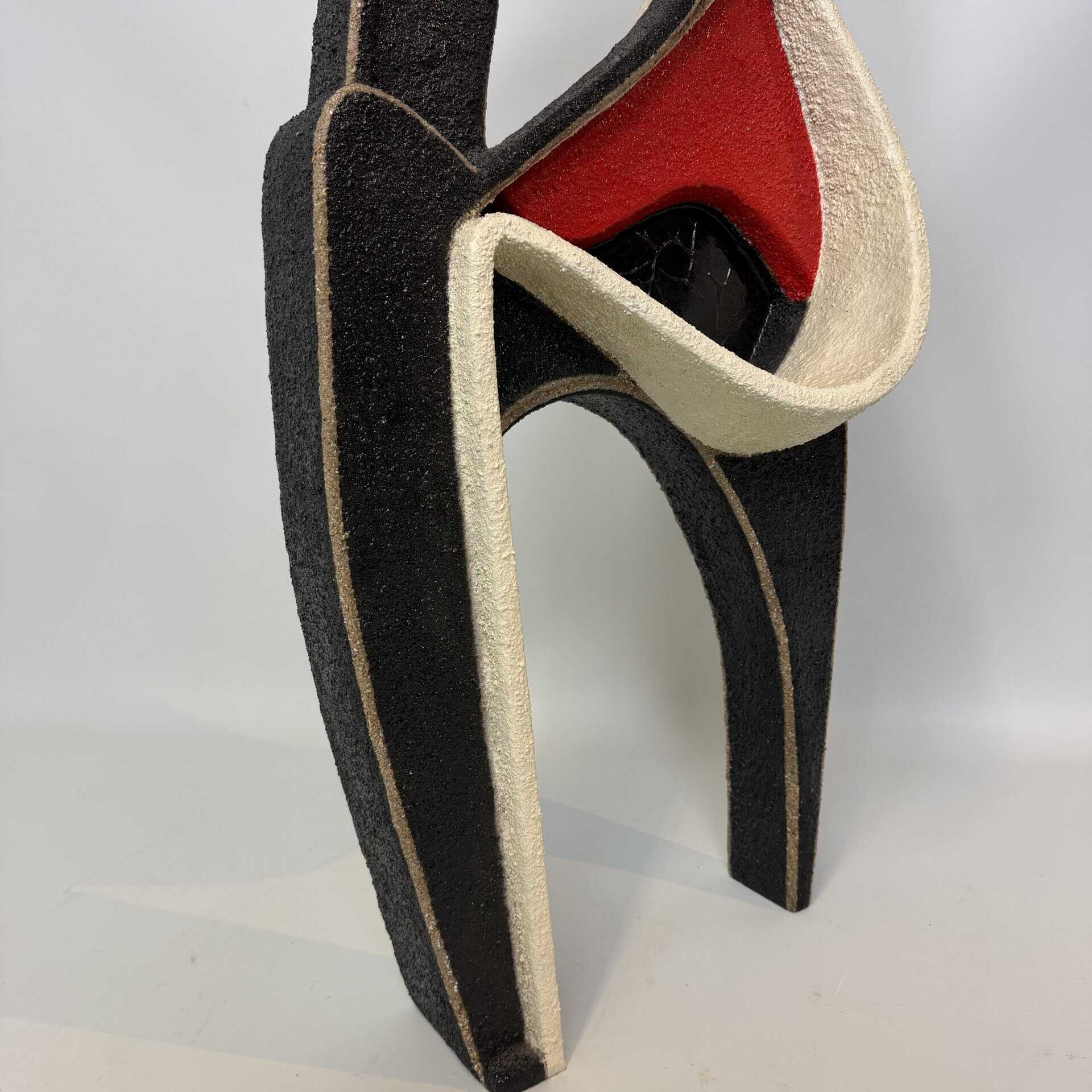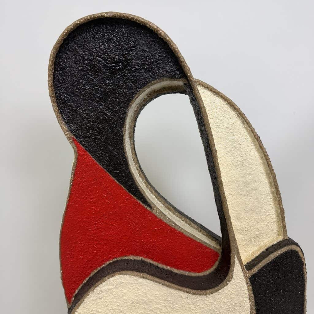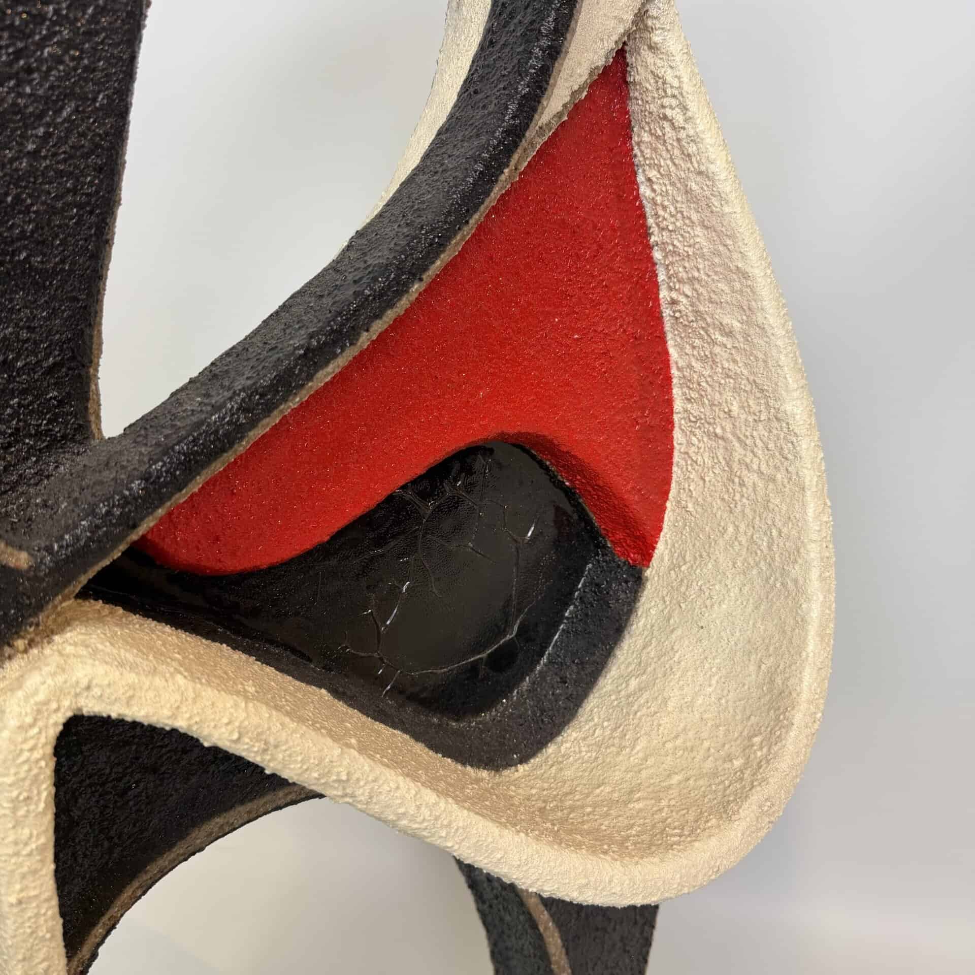 Granular black and cream or off-white texture and a smooth, vibrant red section that cuts diagonally across the center-left