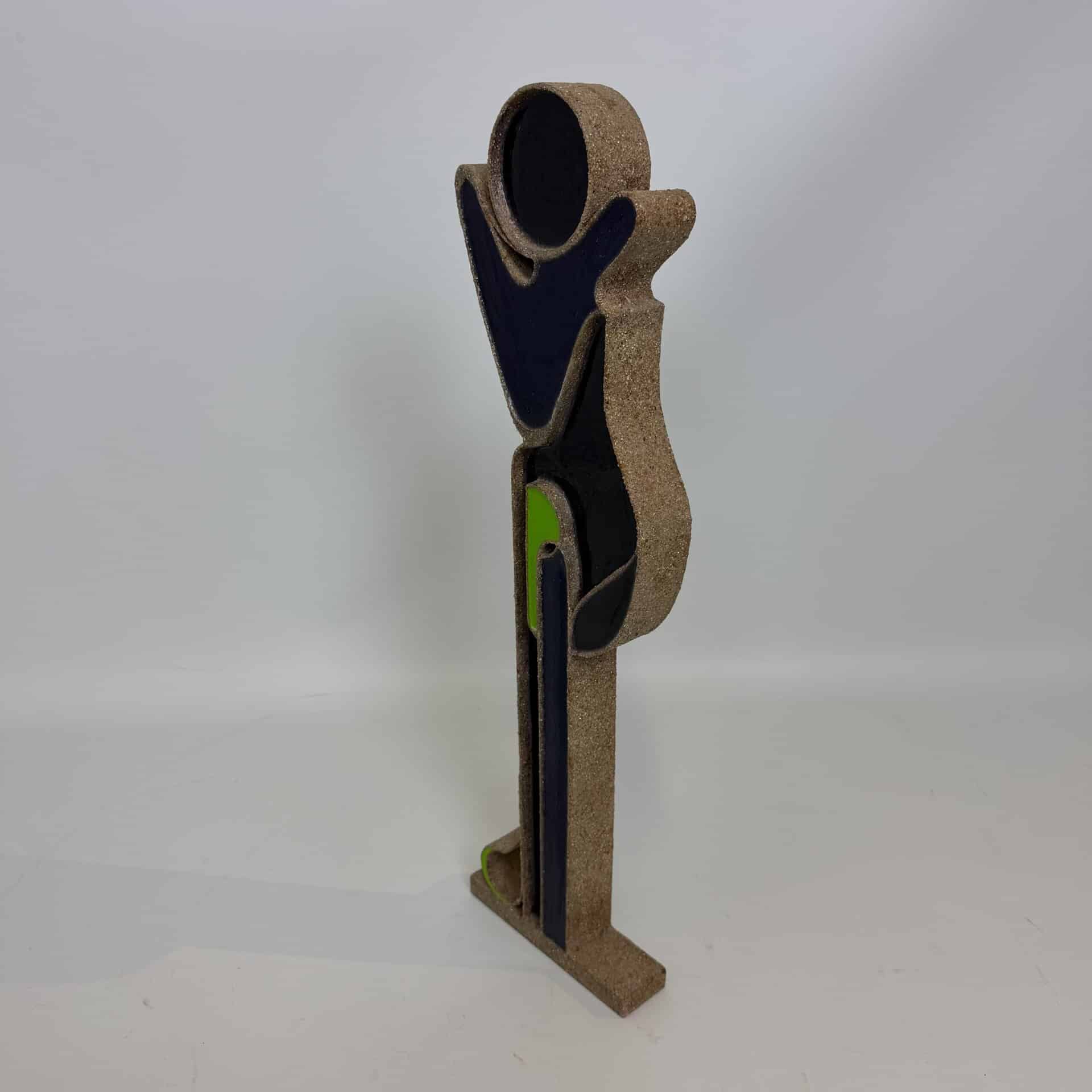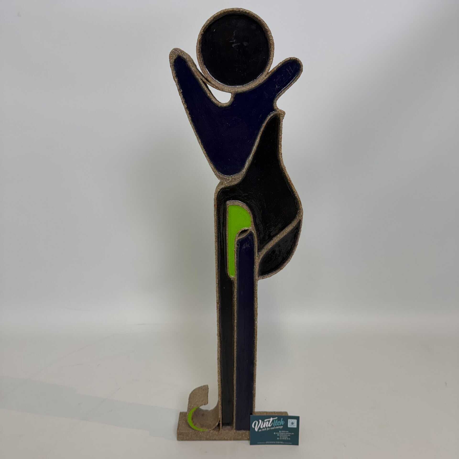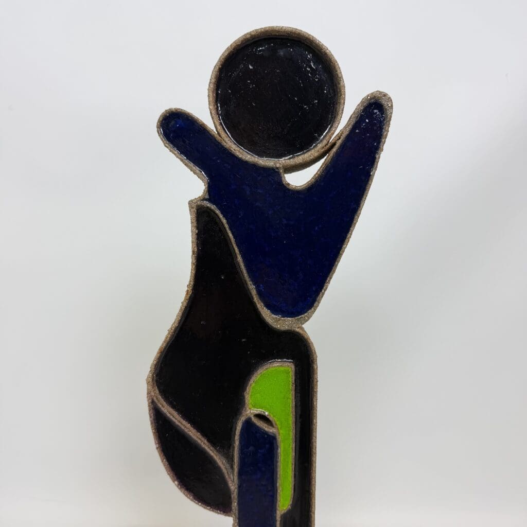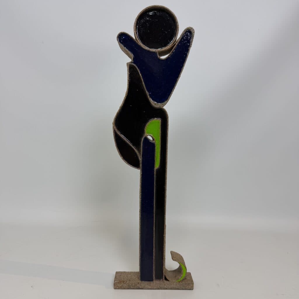The sculpture is a figurative piece featuring bold, flowing lines. It appears to depict a standing figure, with a distinct circular head, raised arms, and a curved body