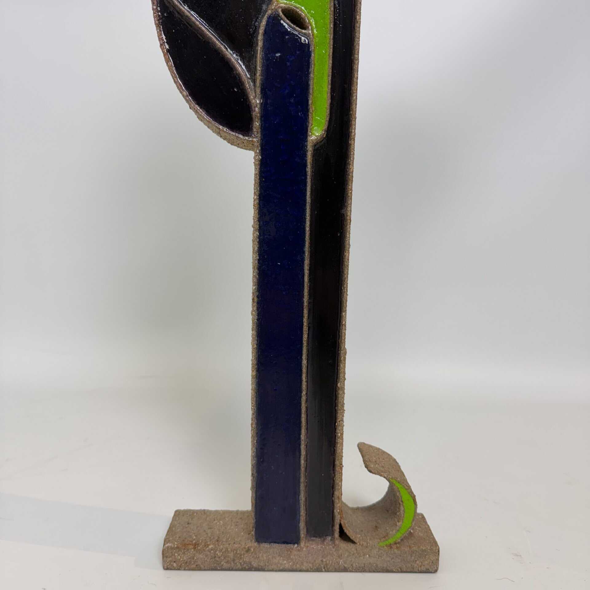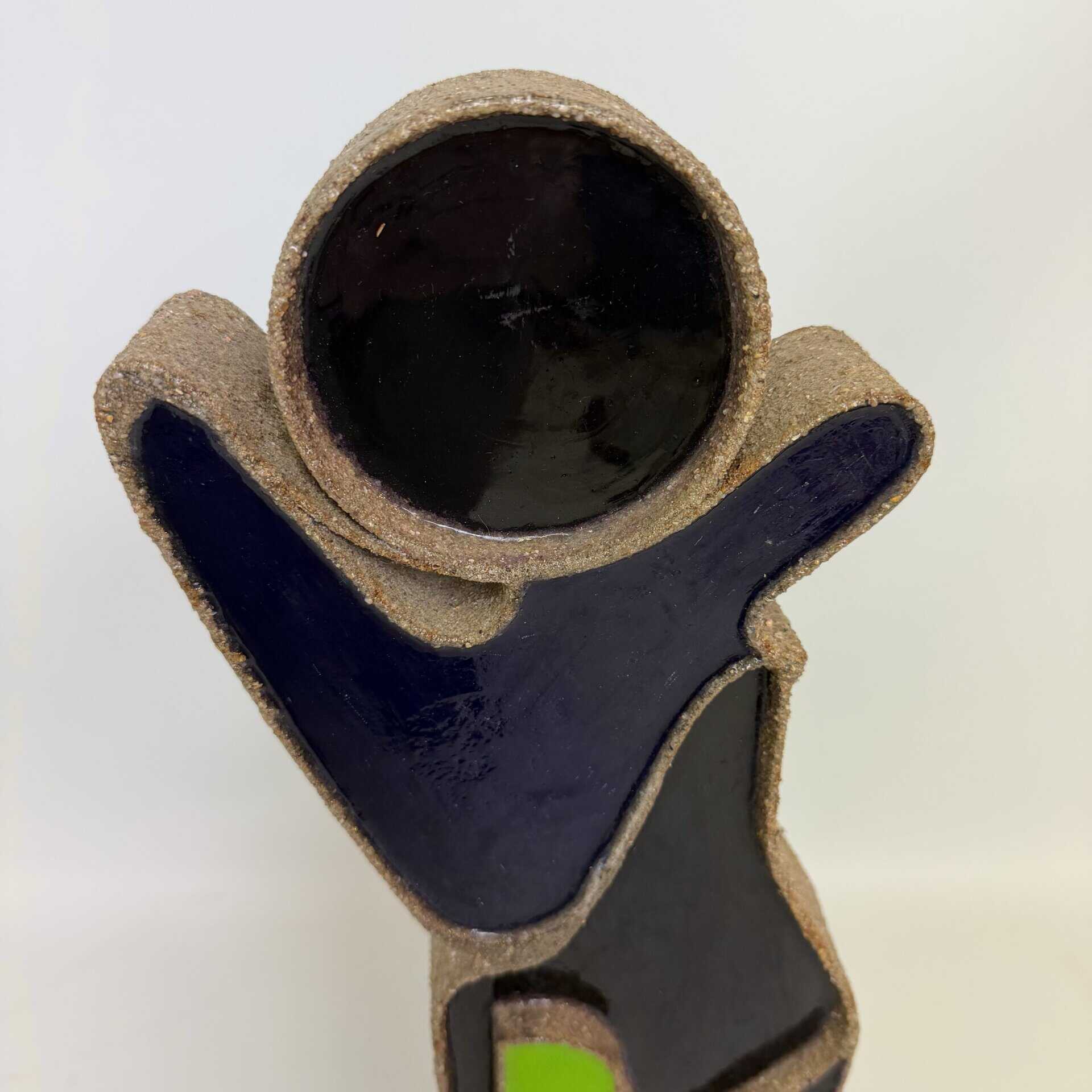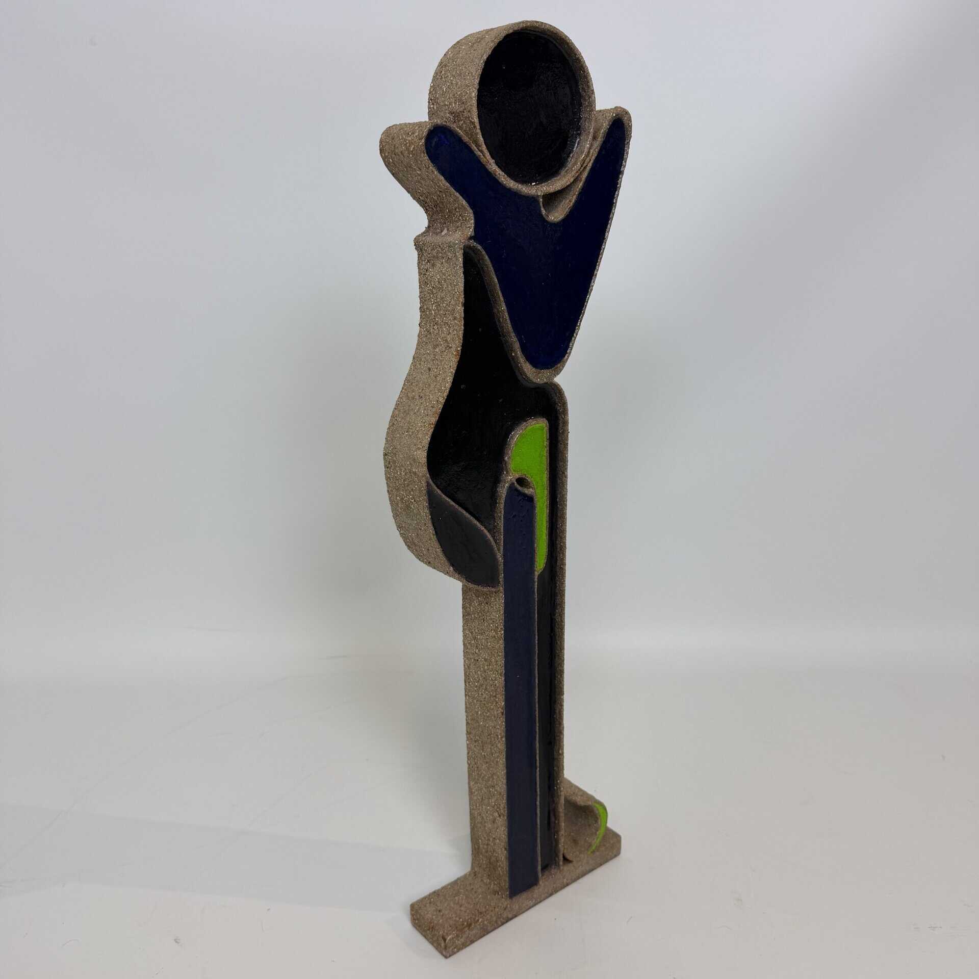 The sculpture is a figurative piece featuring bold, flowing lines. It appears to depict a standing figure, with a distinct circular head, raised arms, and a curved body