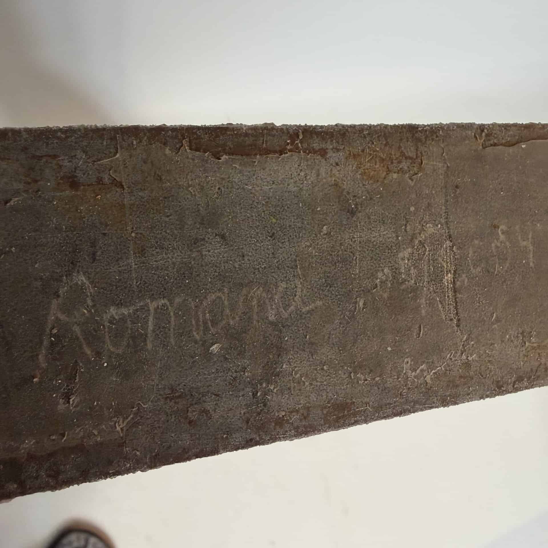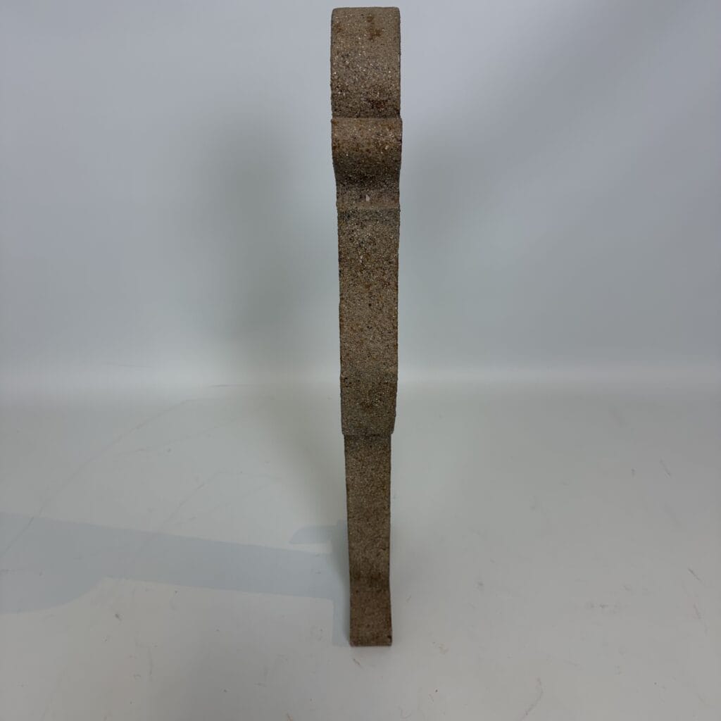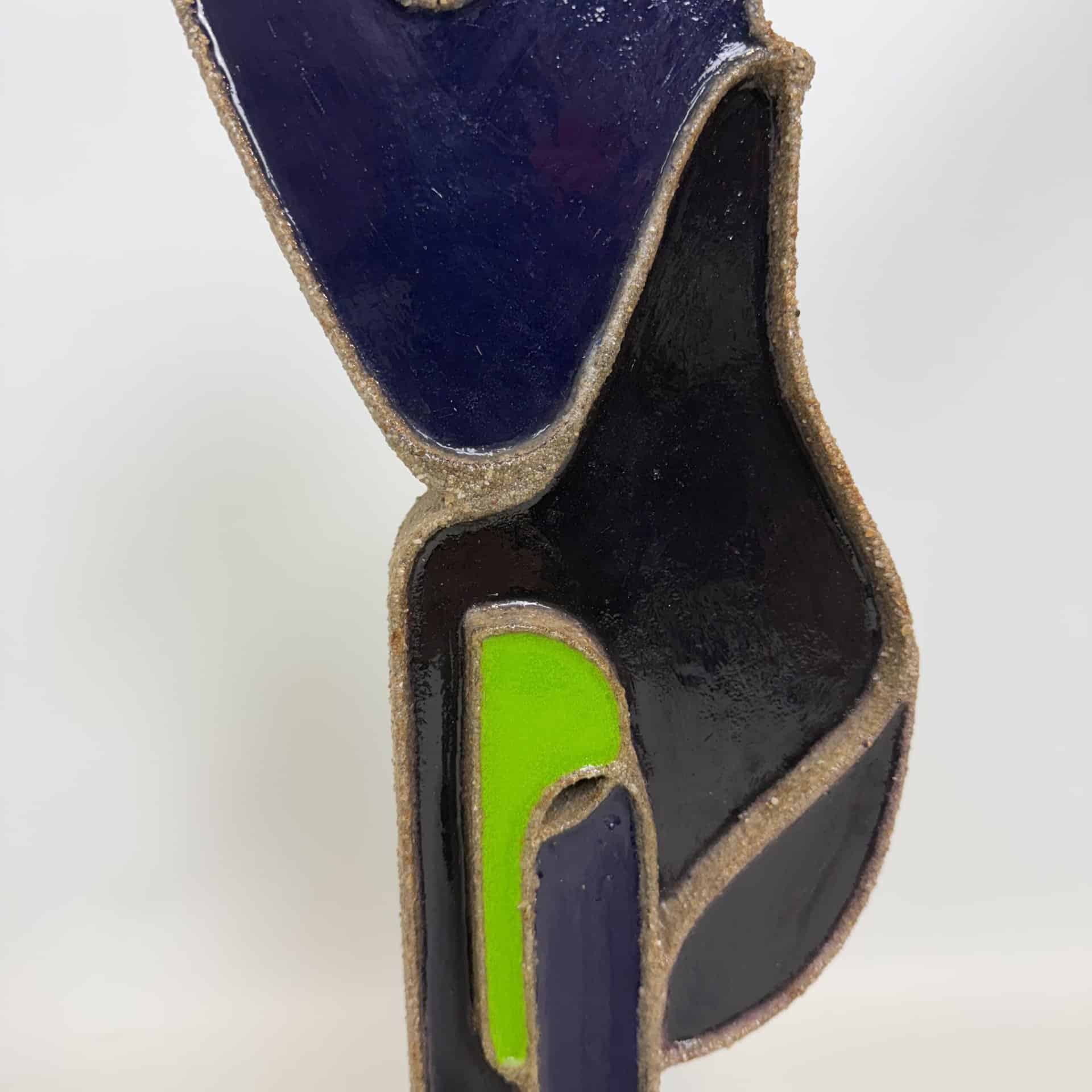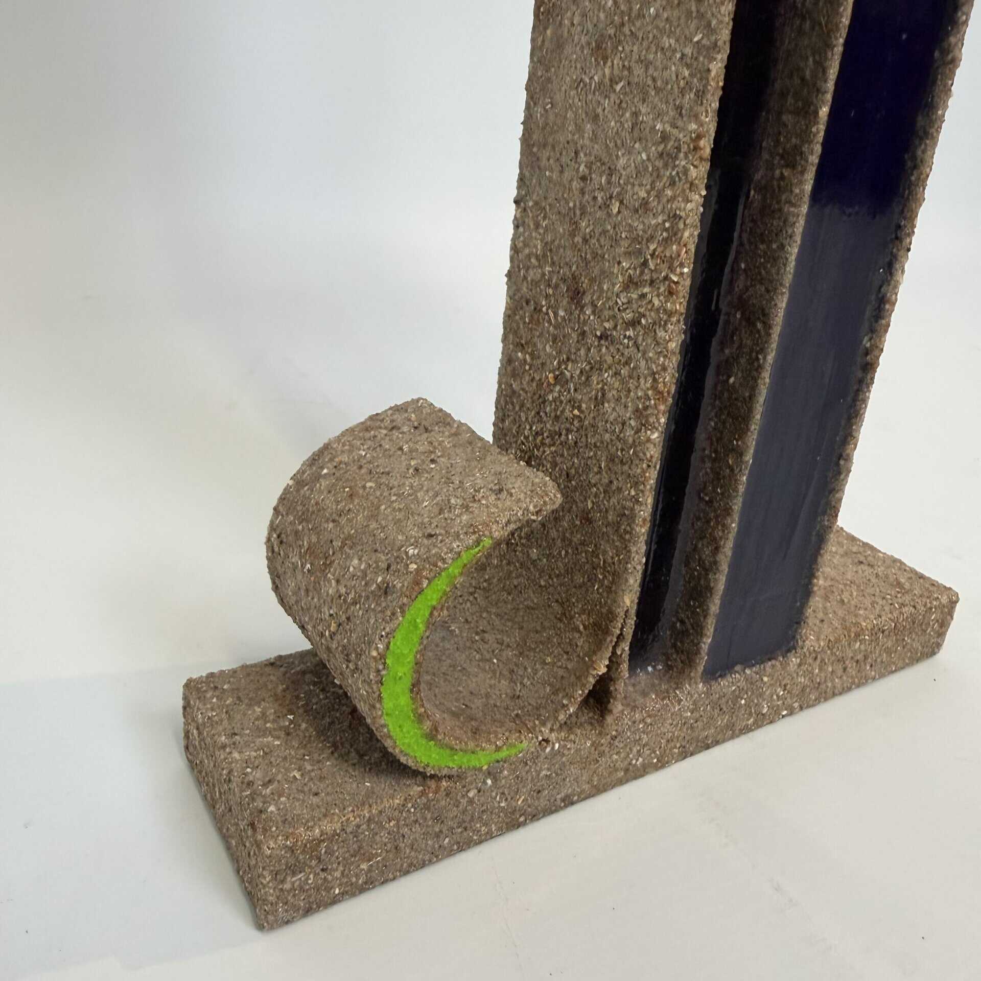 The sculpture is a figurative piece featuring bold, flowing lines. It appears to depict a standing figure, with a distinct circular head, raised arms, and a curved body