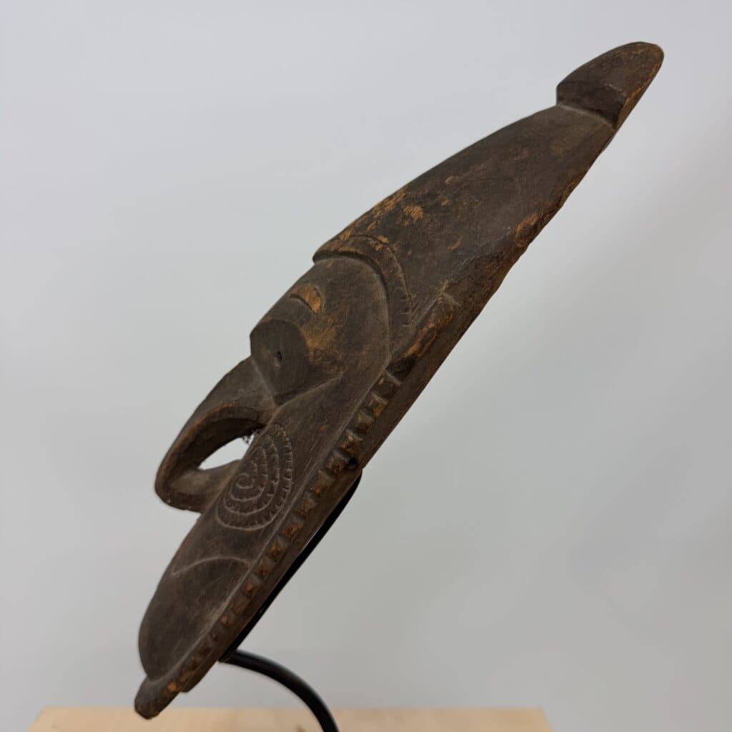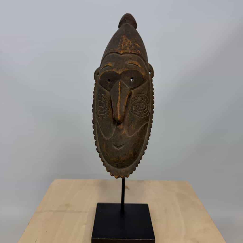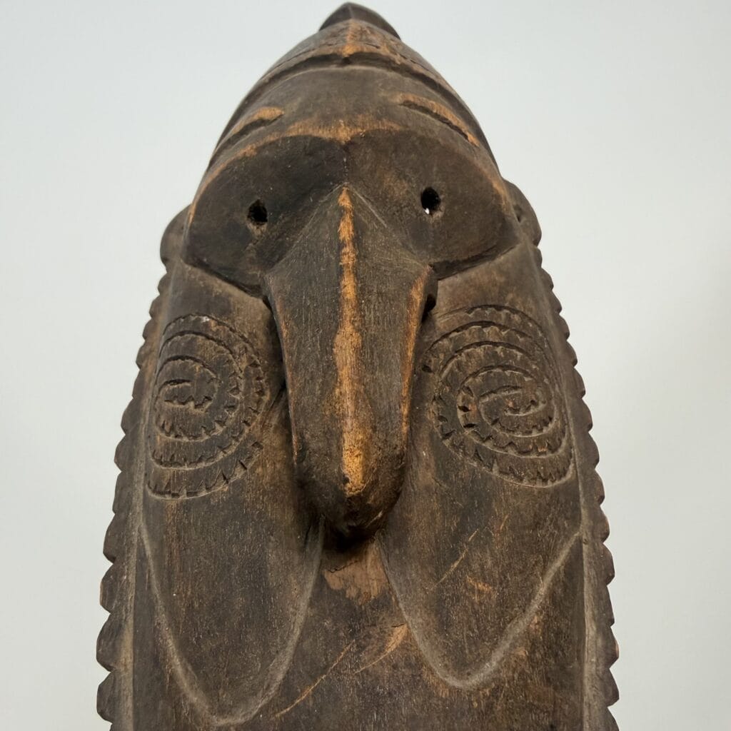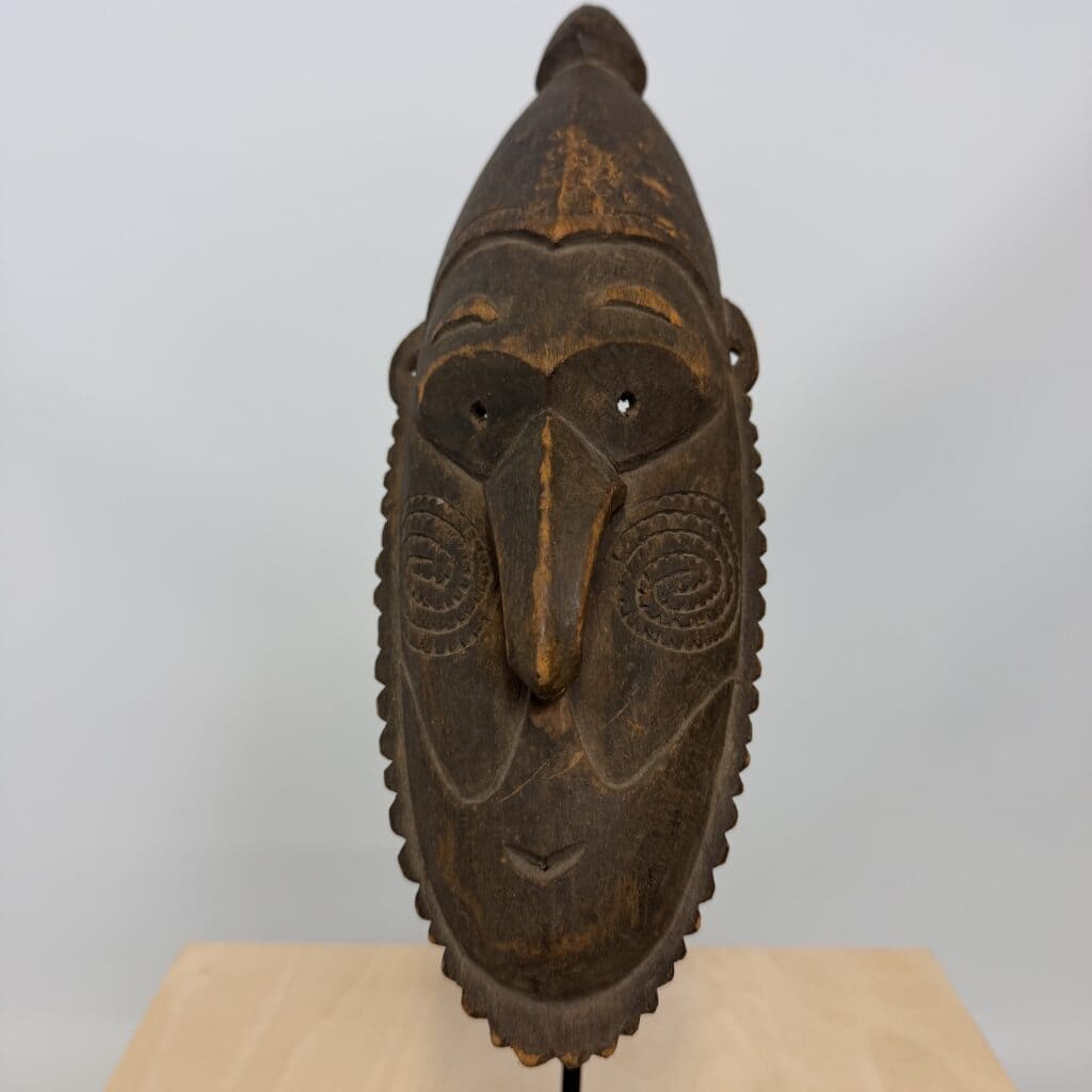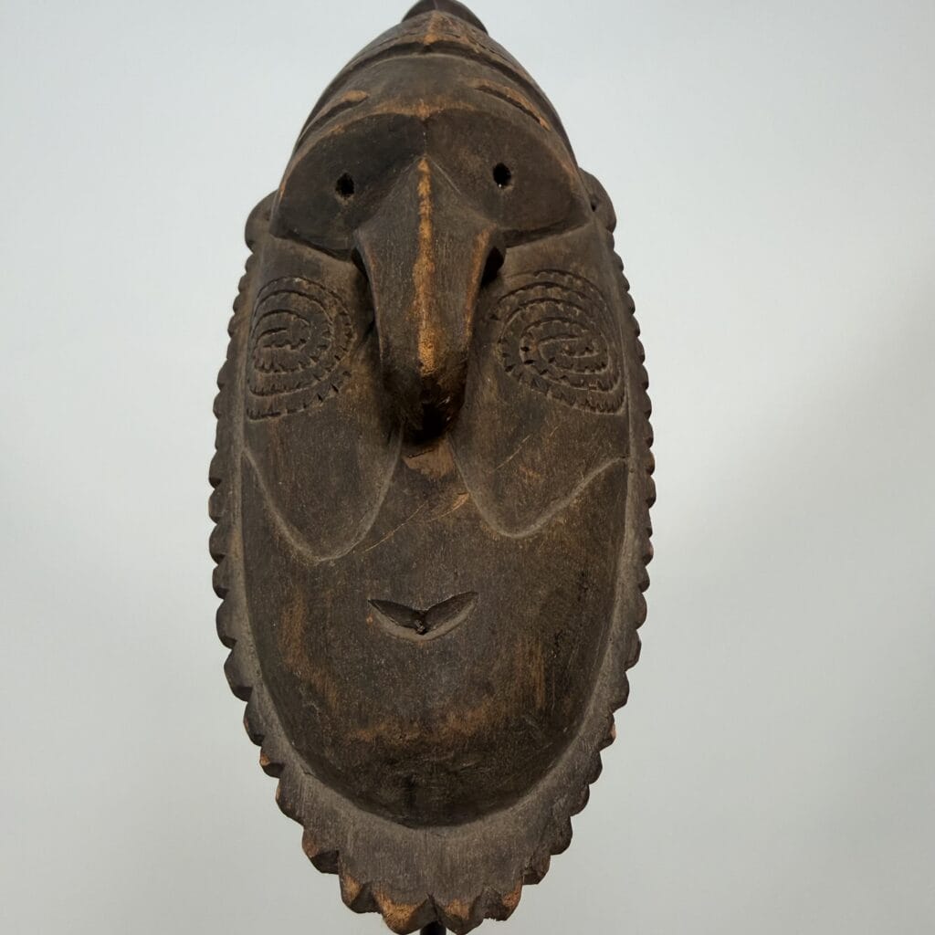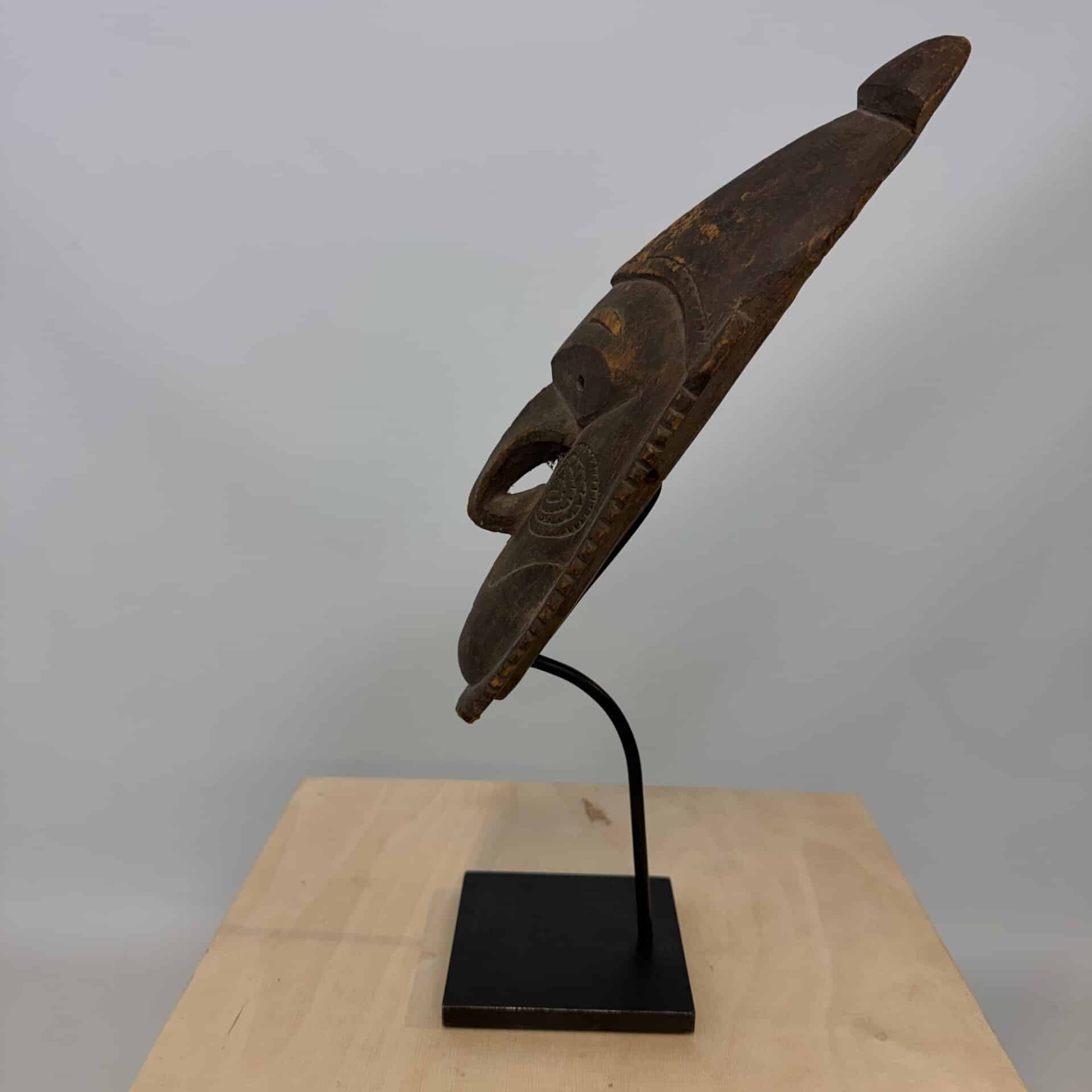 This mask an essential part of male religious life and initiation rites among the peoples along the Sepik River in New Guinea. They represent powerful spirits or ancestral figures, and are sometimes worn during ceremonies or displayed in a ‘Haus Tambaran’ (men’s house) to attract these spirits.