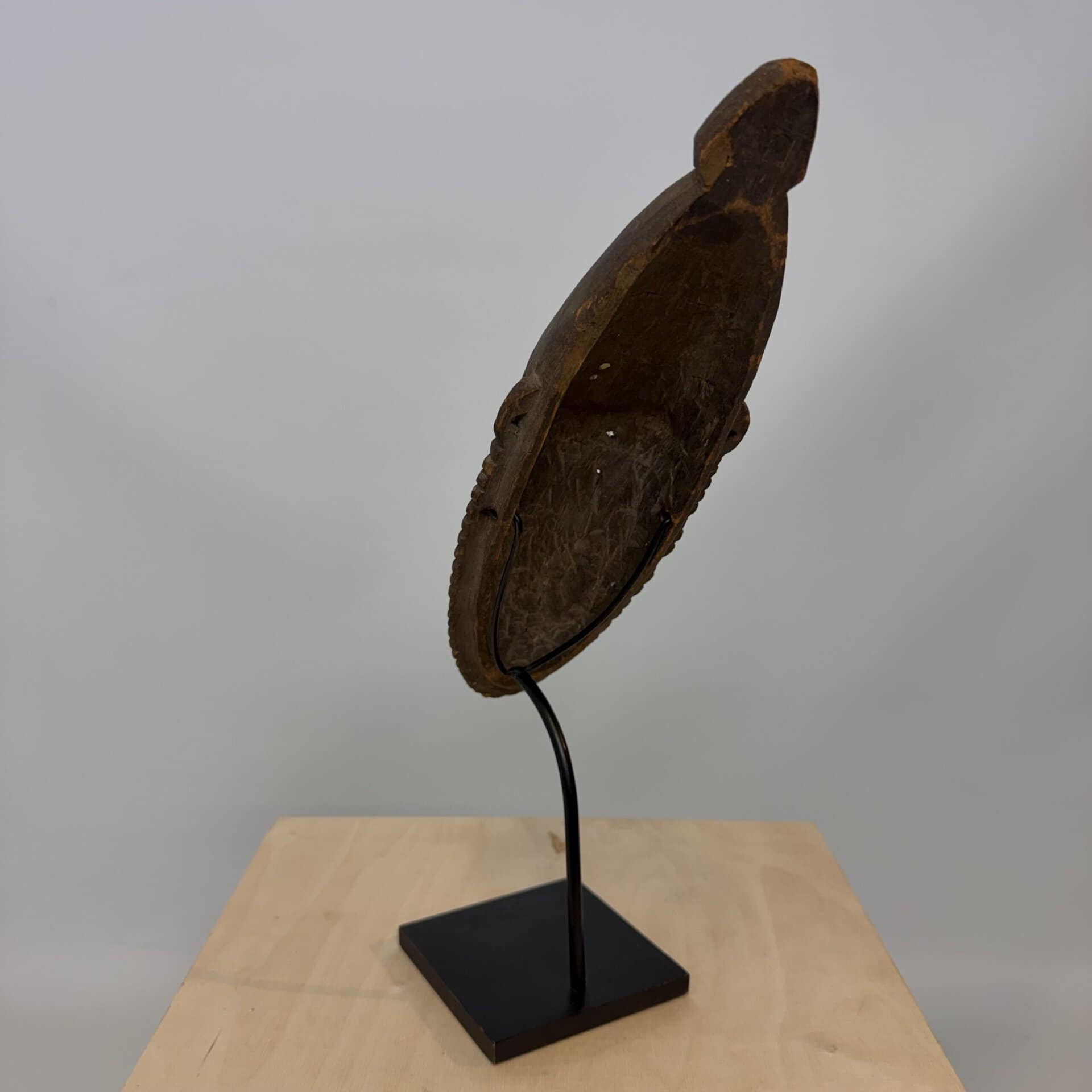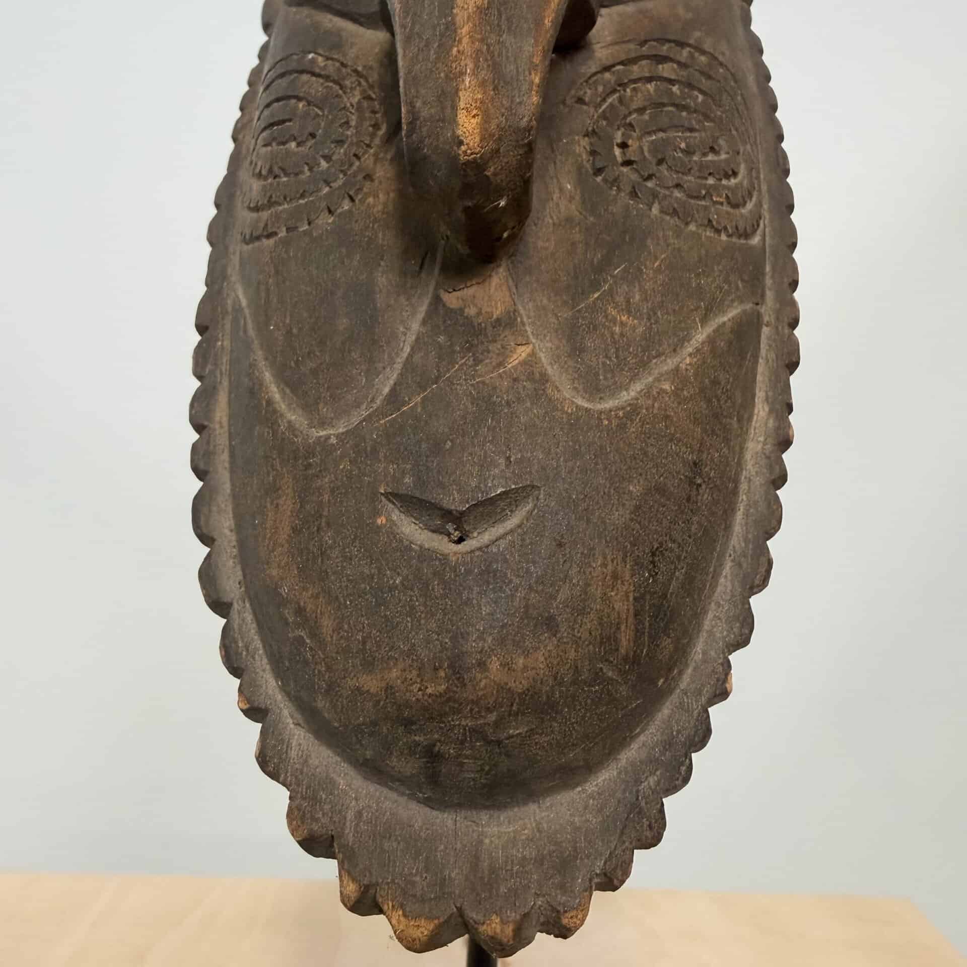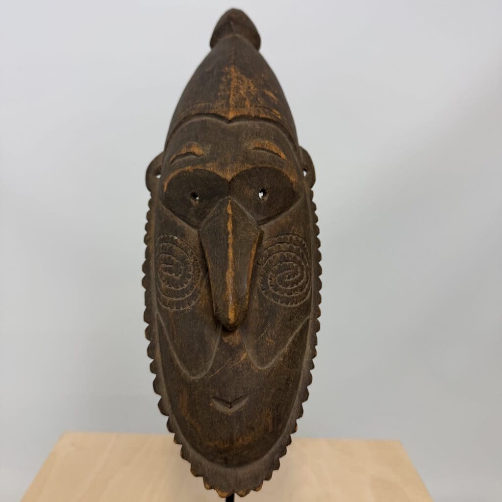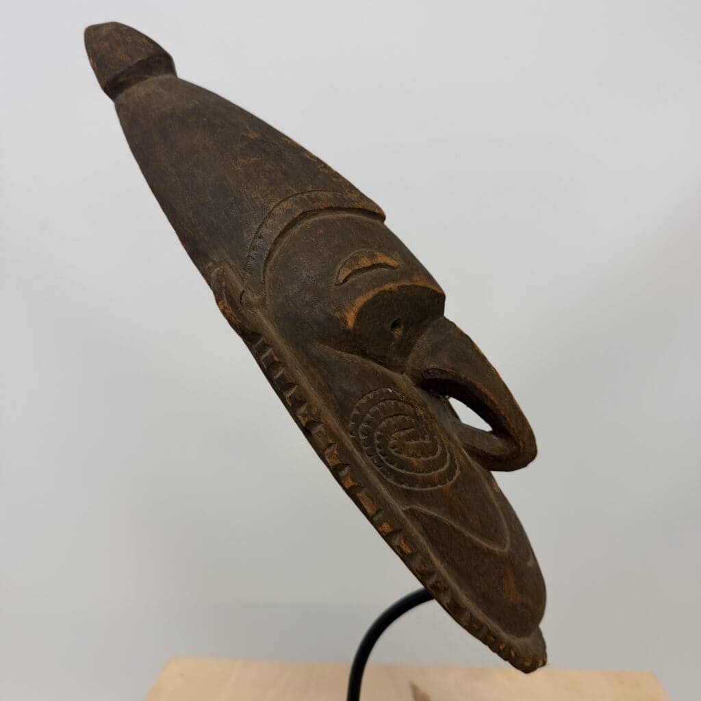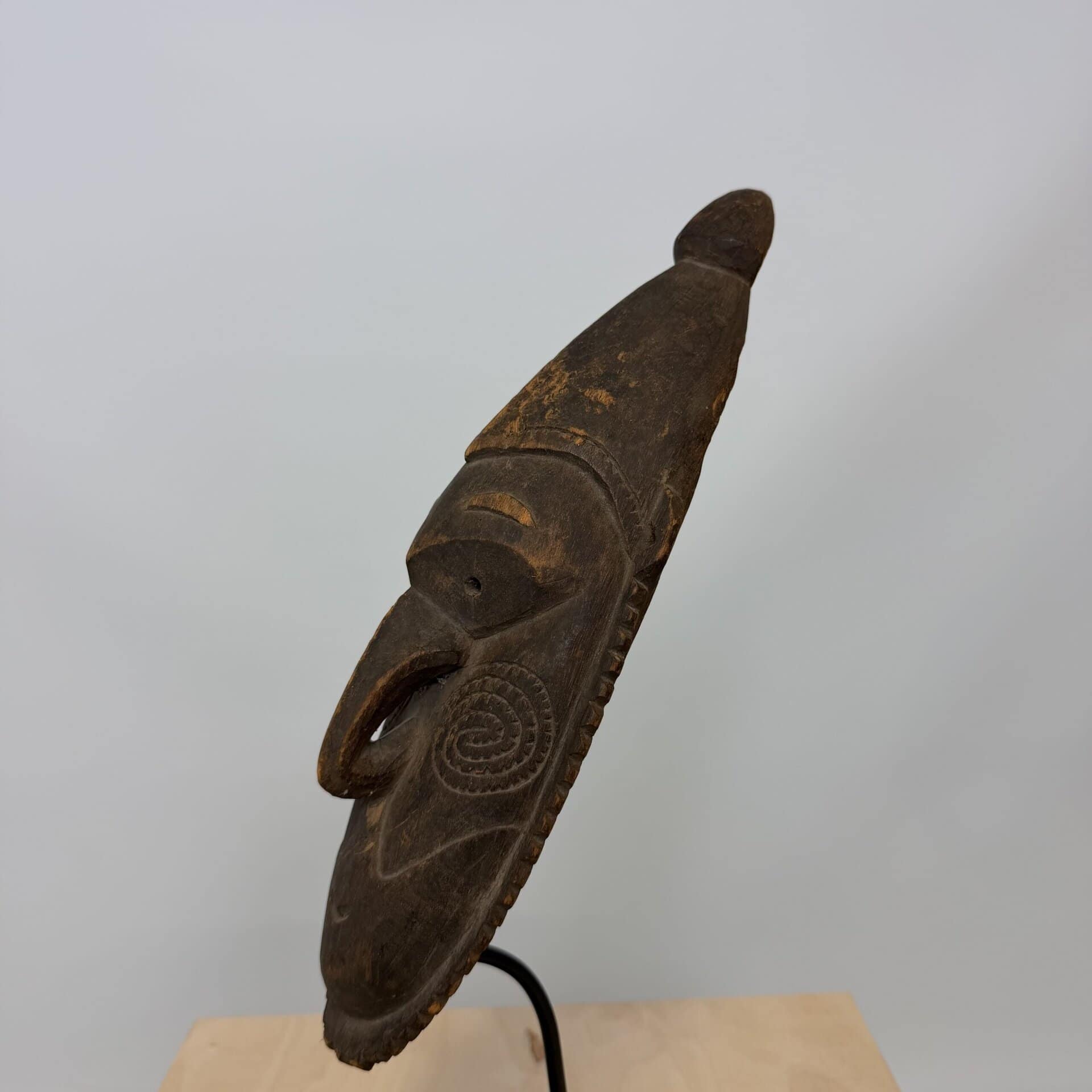 This mask an essential part of male religious life and initiation rites among the peoples along the Sepik River in New Guinea. They represent powerful spirits or ancestral figures, and are sometimes worn during ceremonies or displayed in a ‘Haus Tambaran’ (men’s house) to attract these spirits.