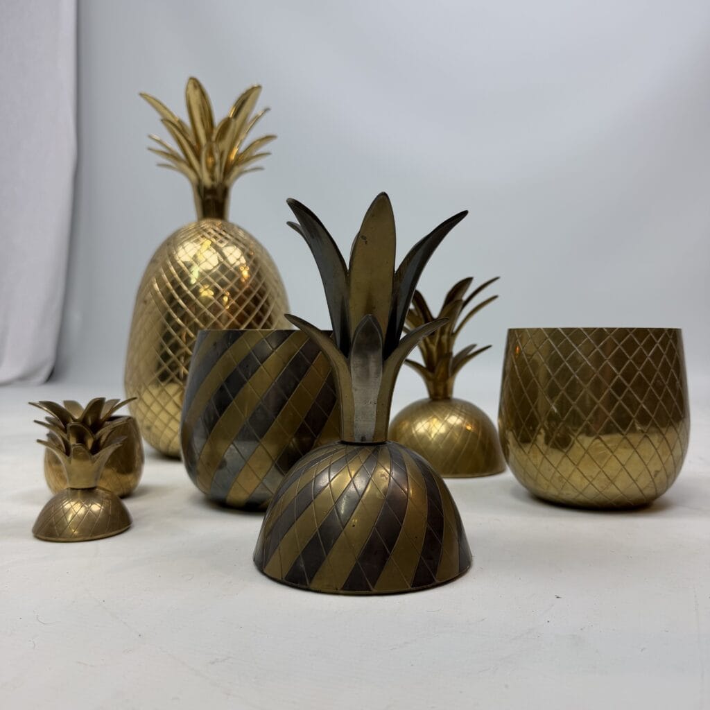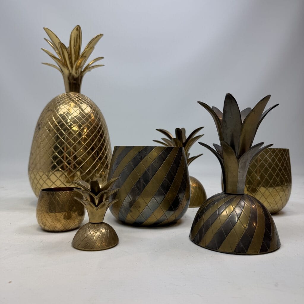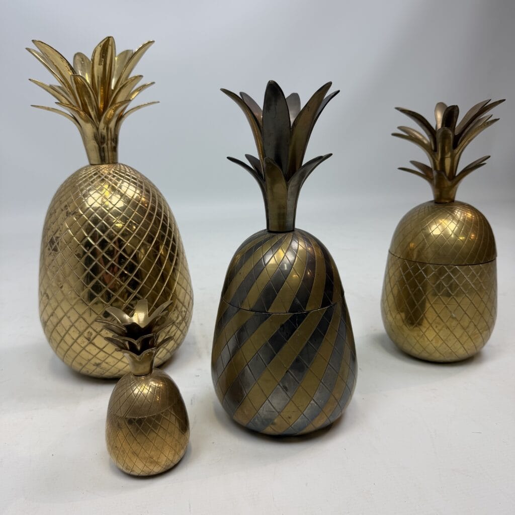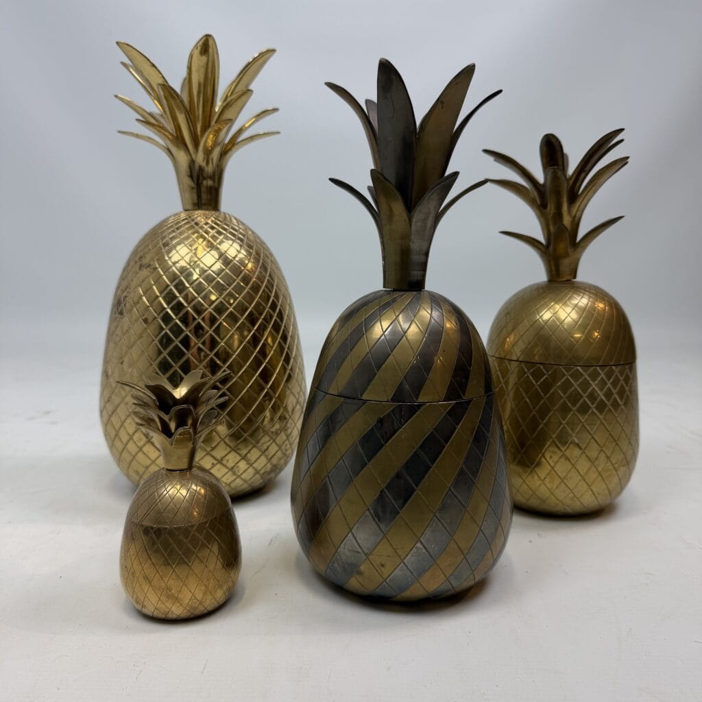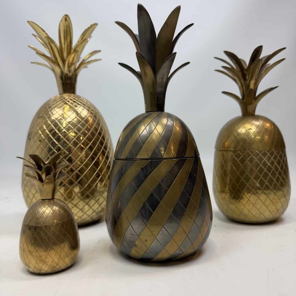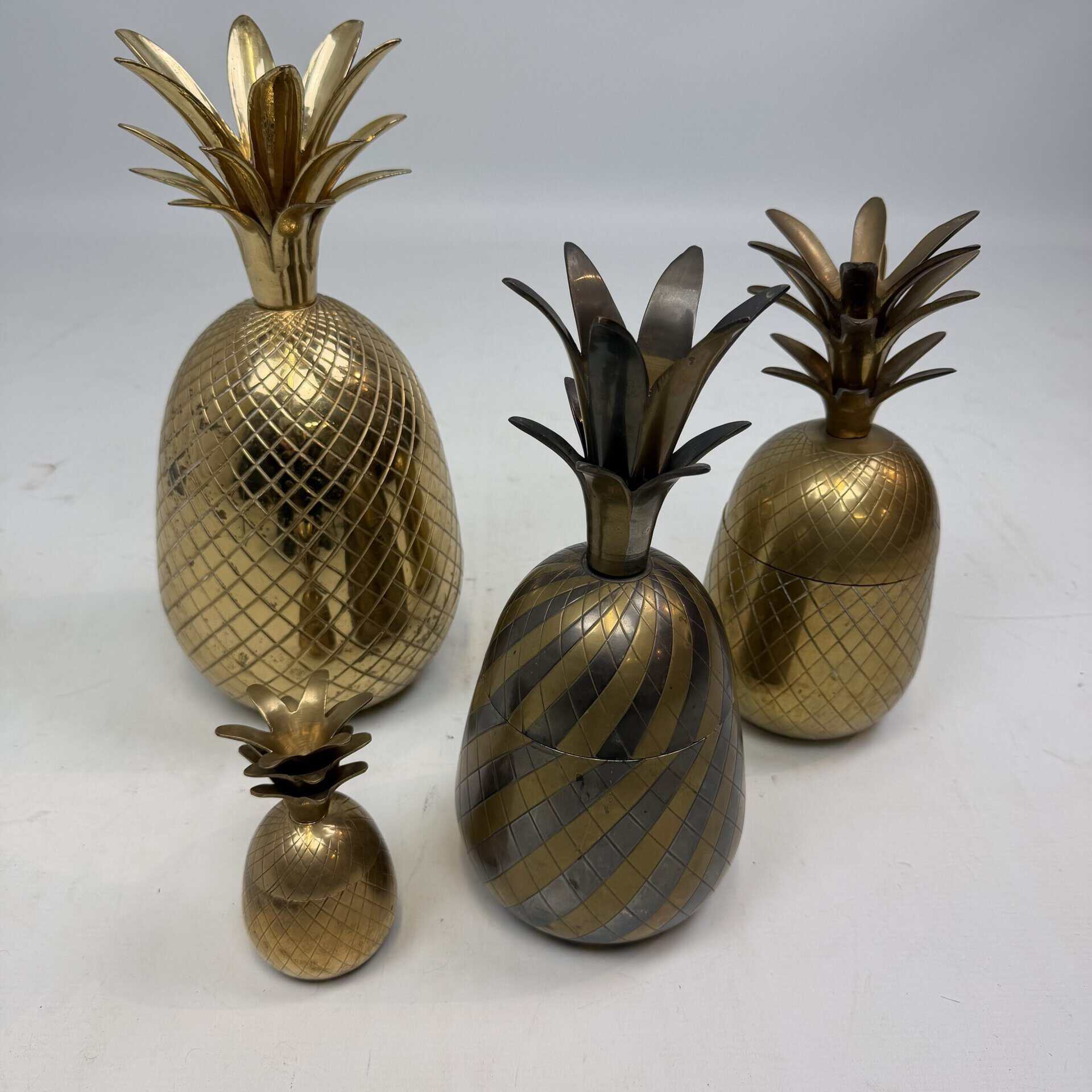 4 decorative pineapples in gilded brass and a distinctive two-tone, bicolored brass pineapple features a diagonal striped pattern