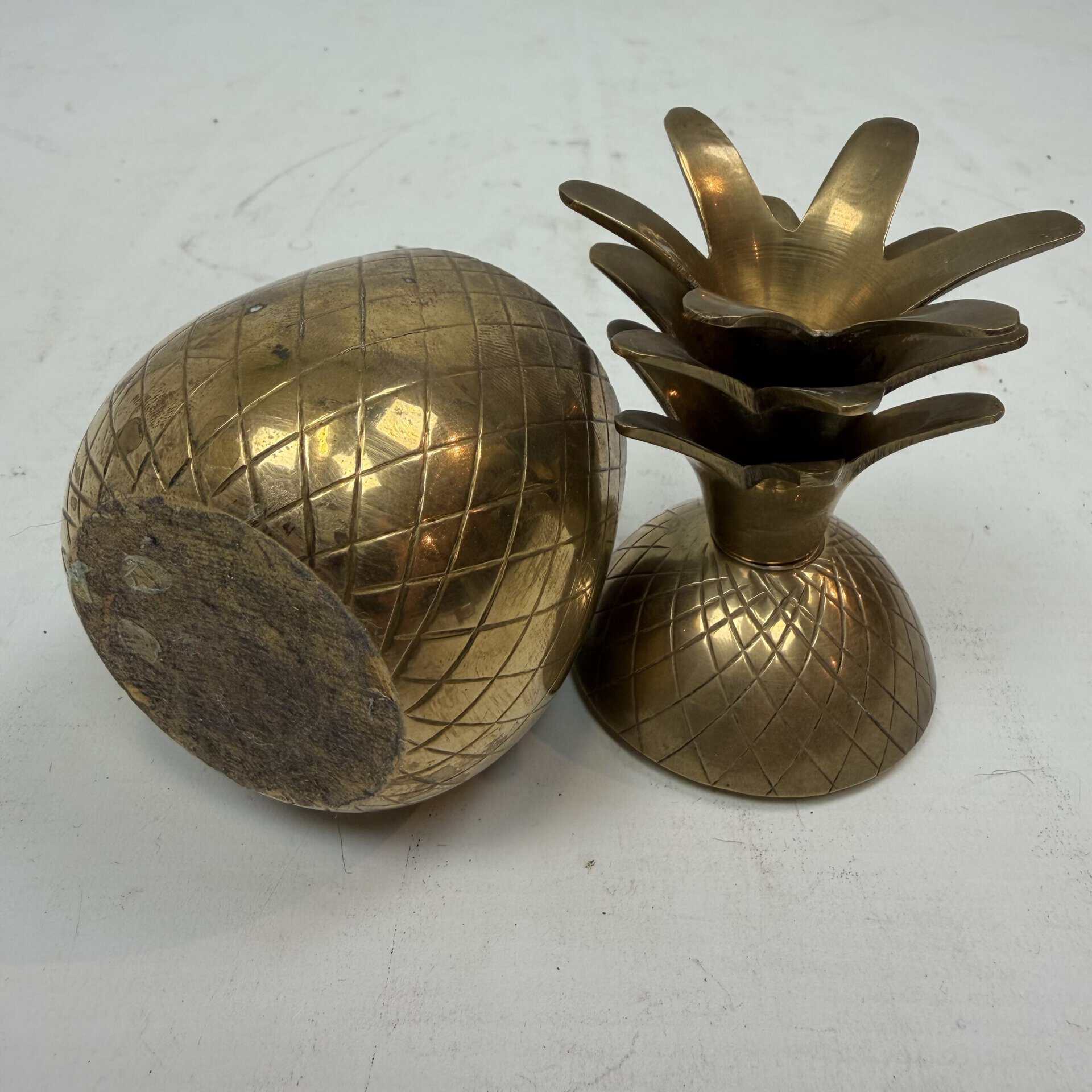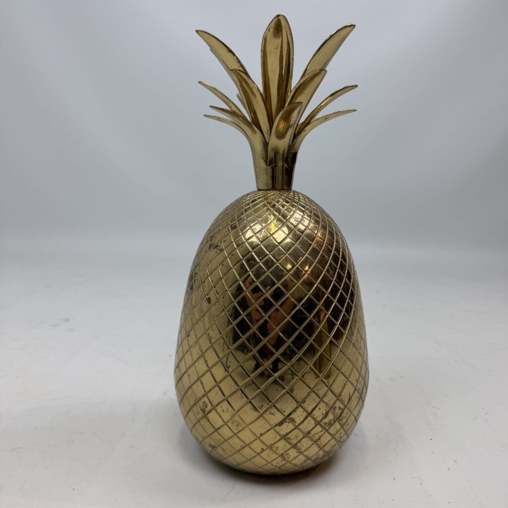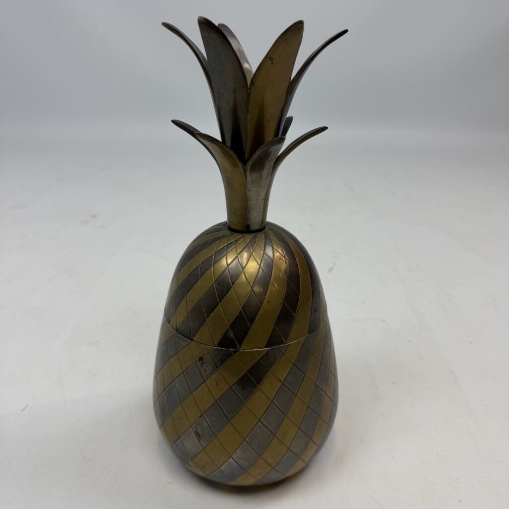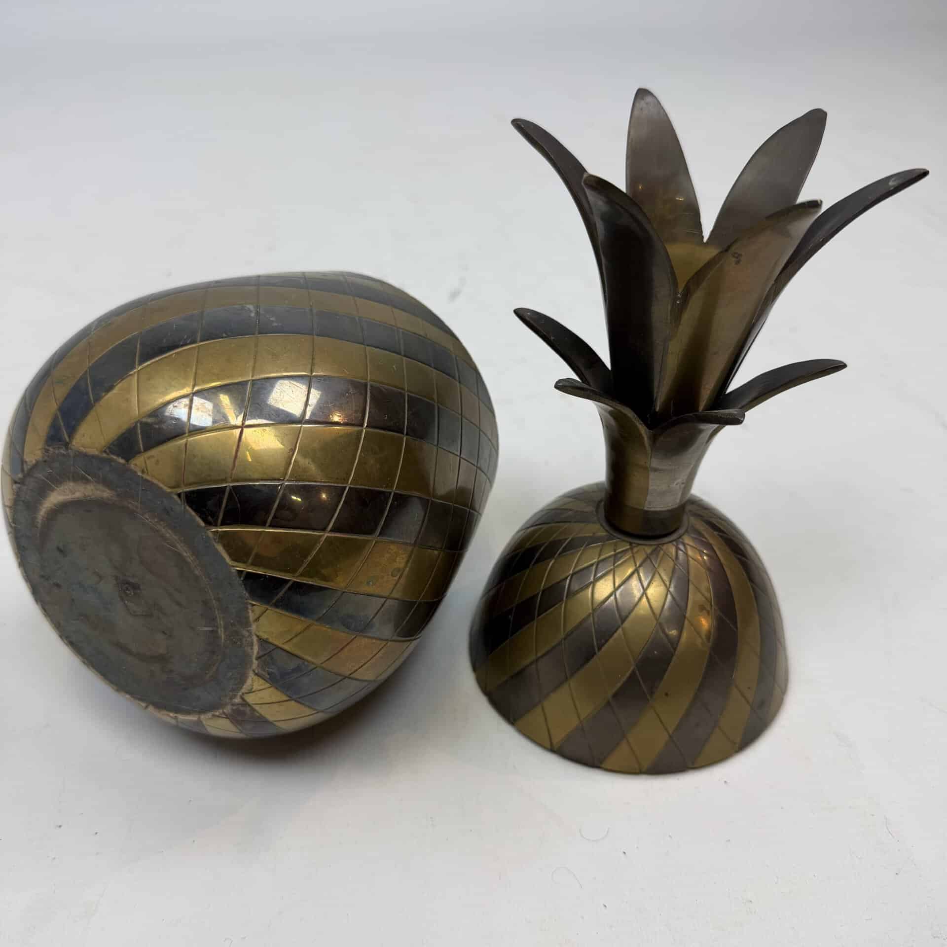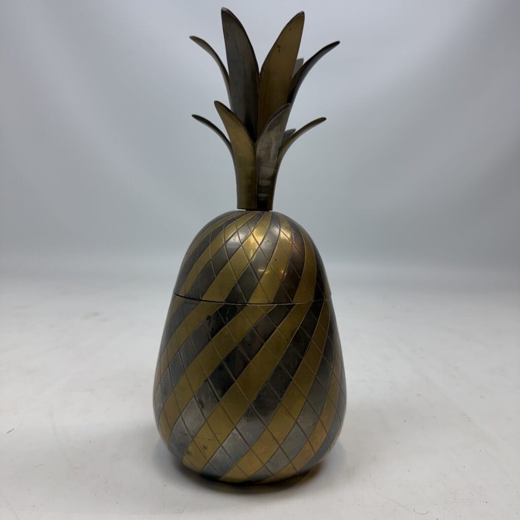 4 decorative pineapples in gilded brass and a distinctive two-tone, bicolored brass pineapple features a diagonal striped pattern
