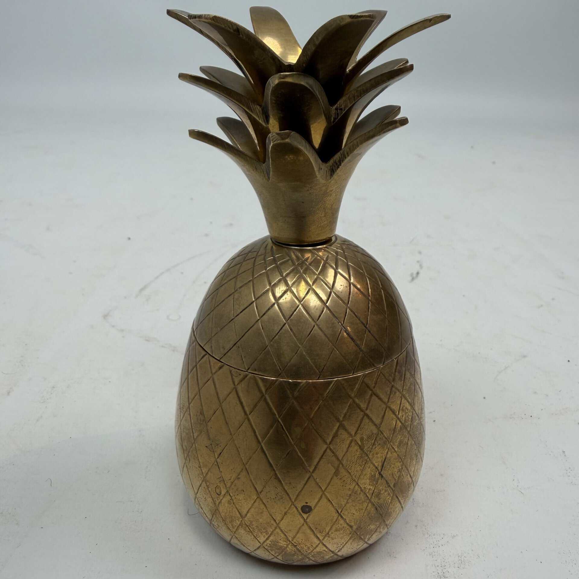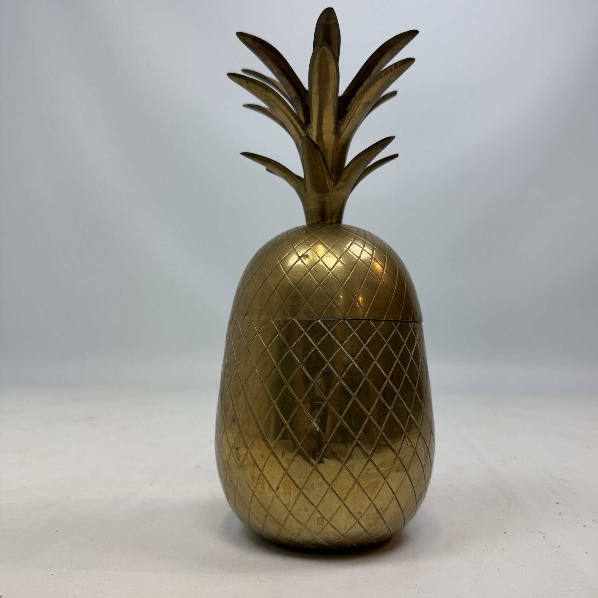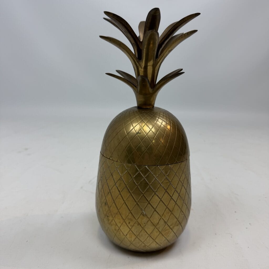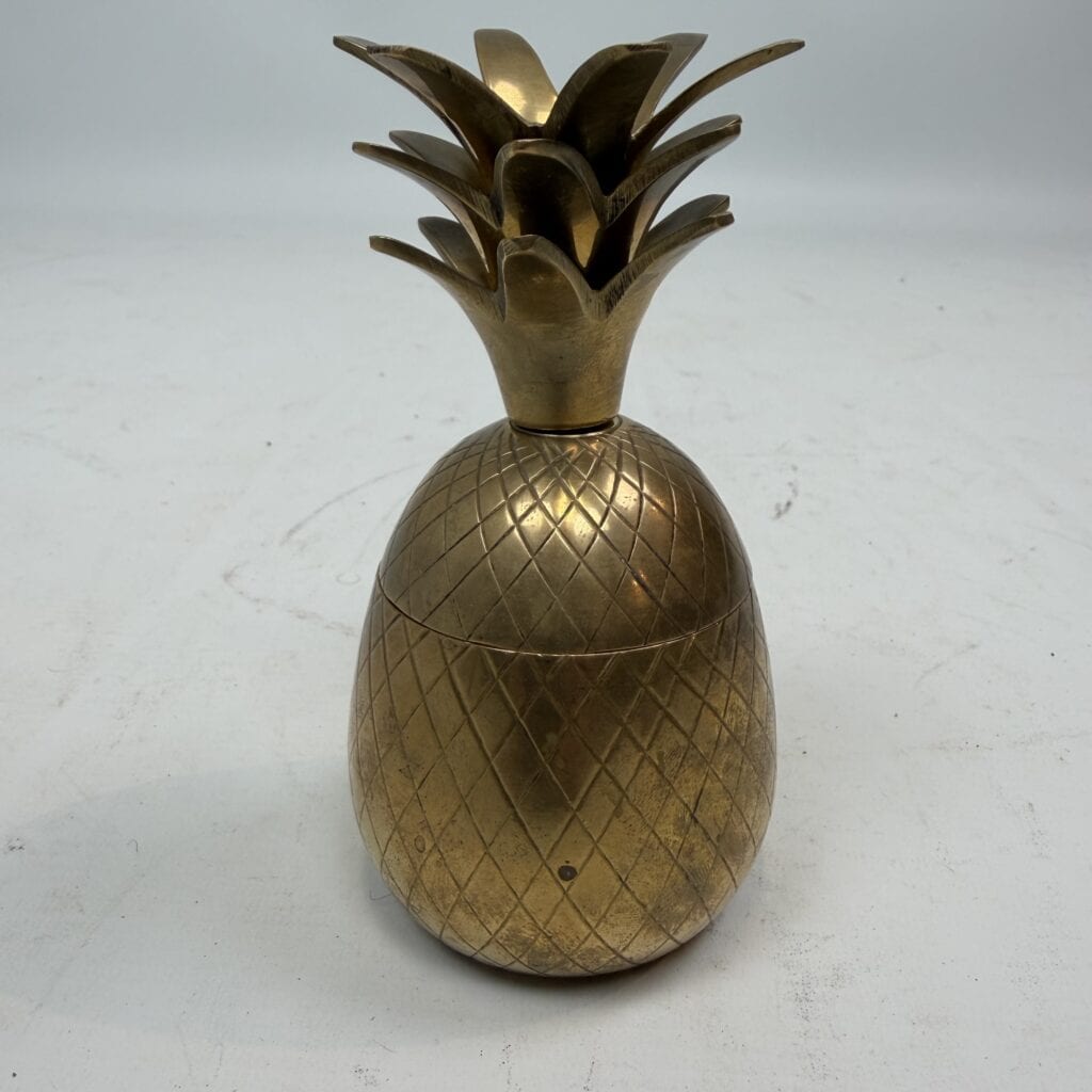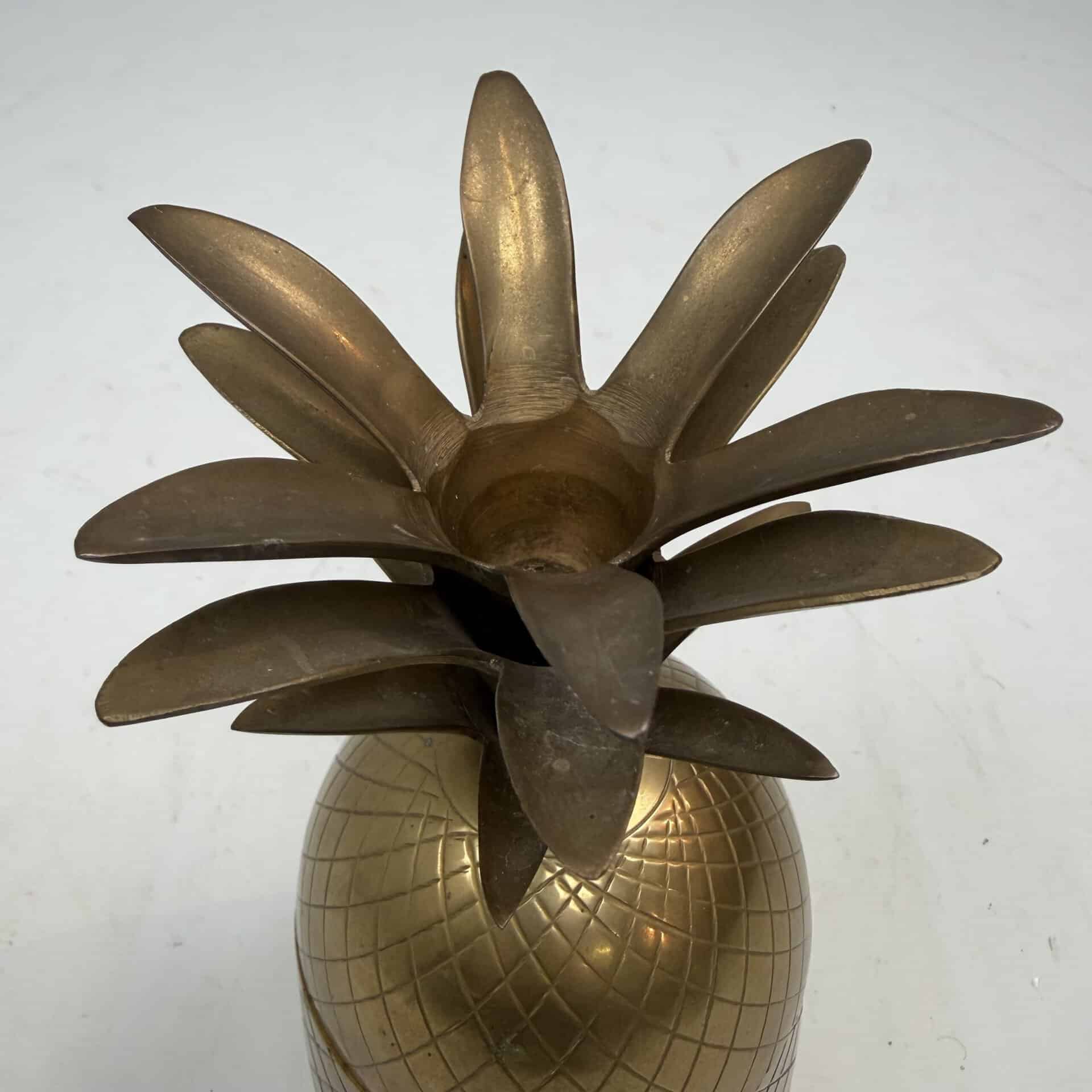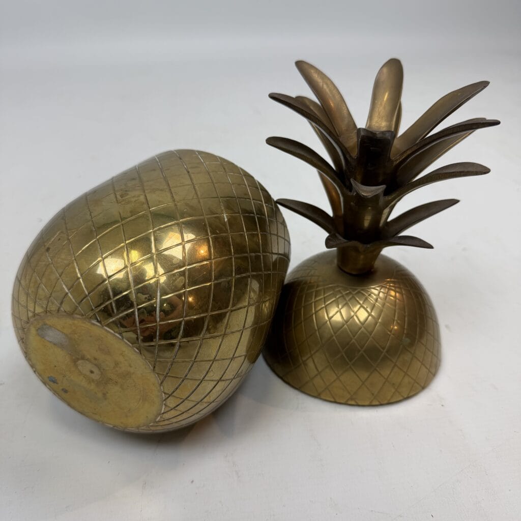4 decorative pineapples in gilded brass and a distinctive two-tone, bicolored brass pineapple features a diagonal striped pattern