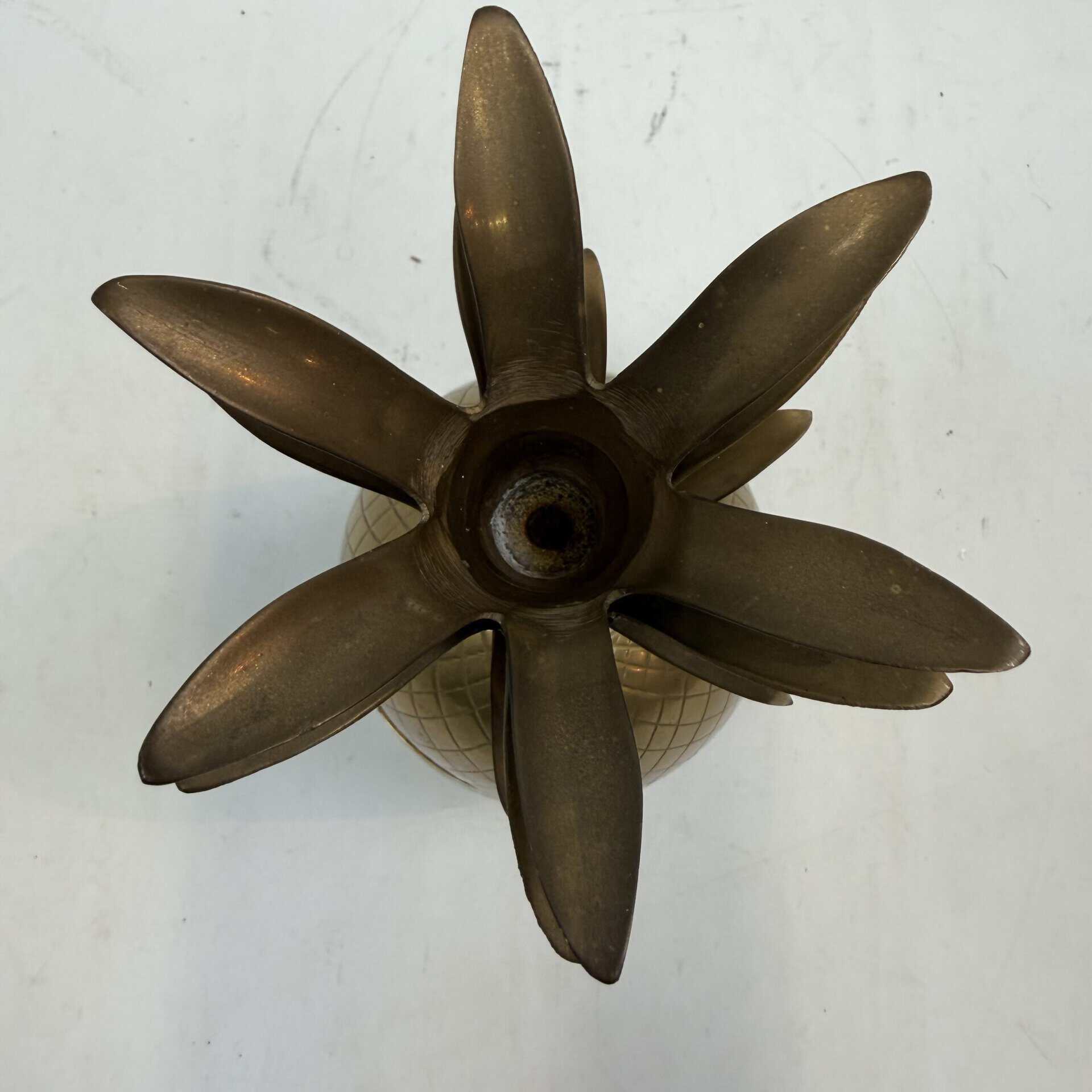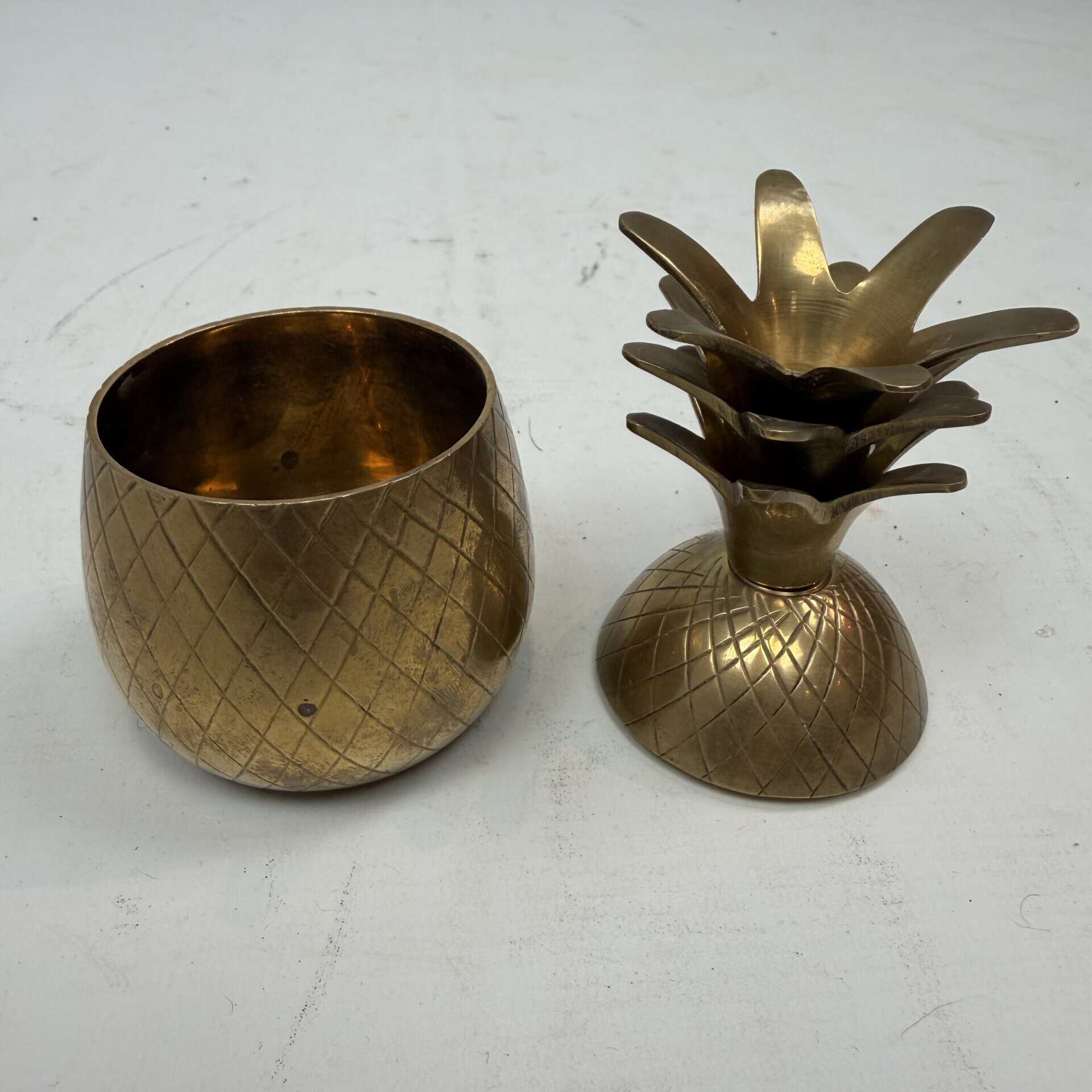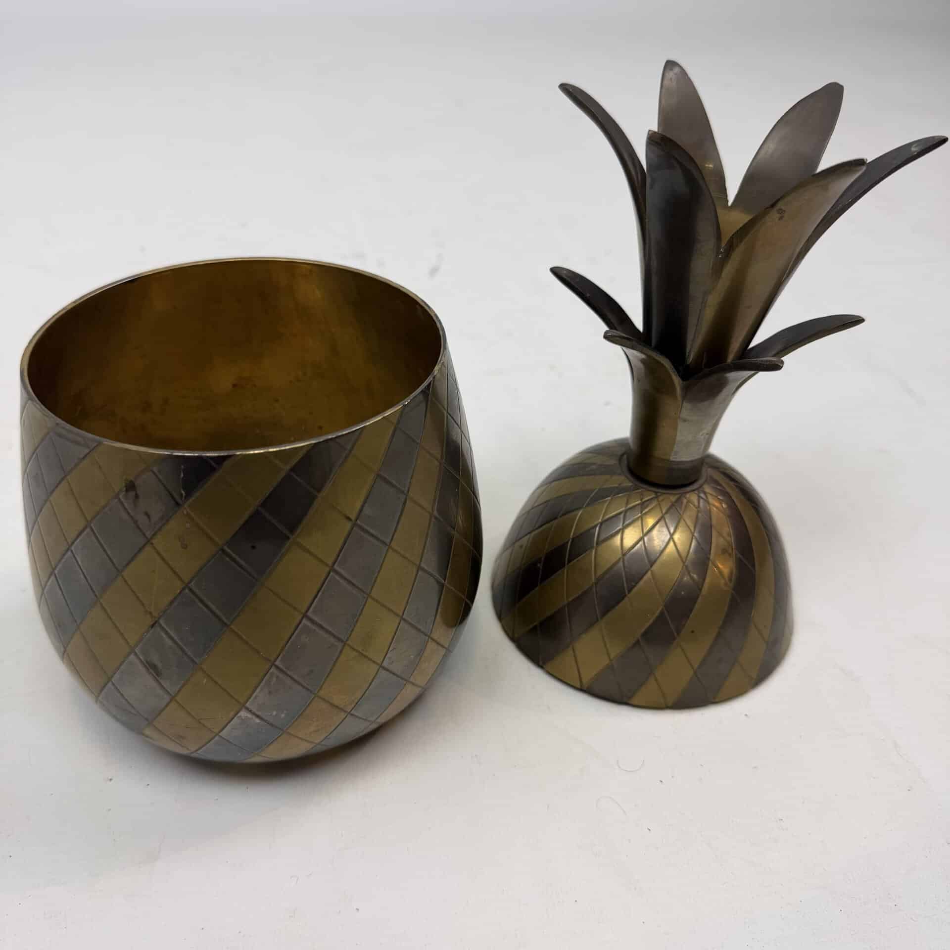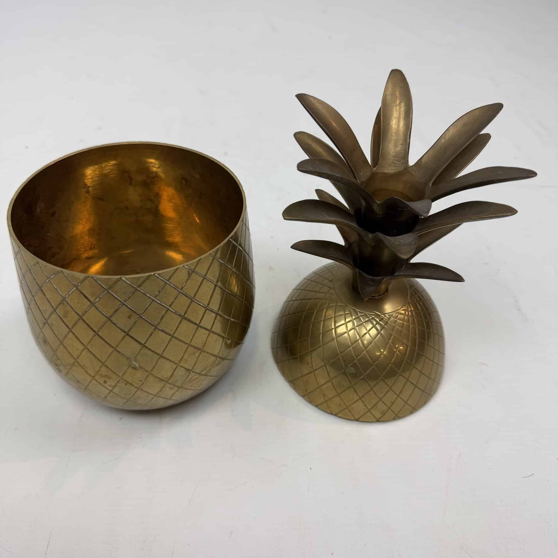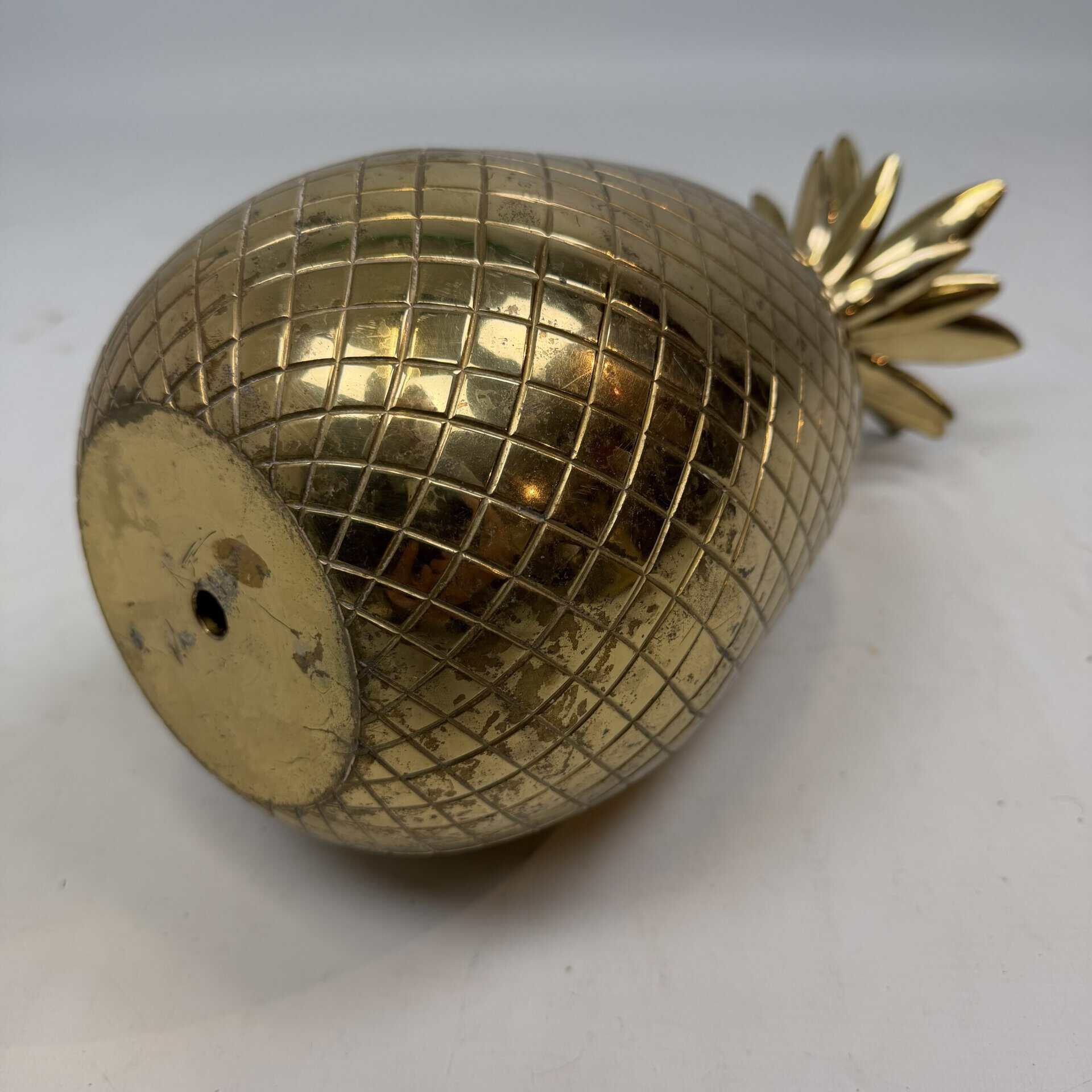 4 decorative pineapples in gilded brass and a distinctive two-tone, bicolored brass pineapple features a diagonal striped pattern