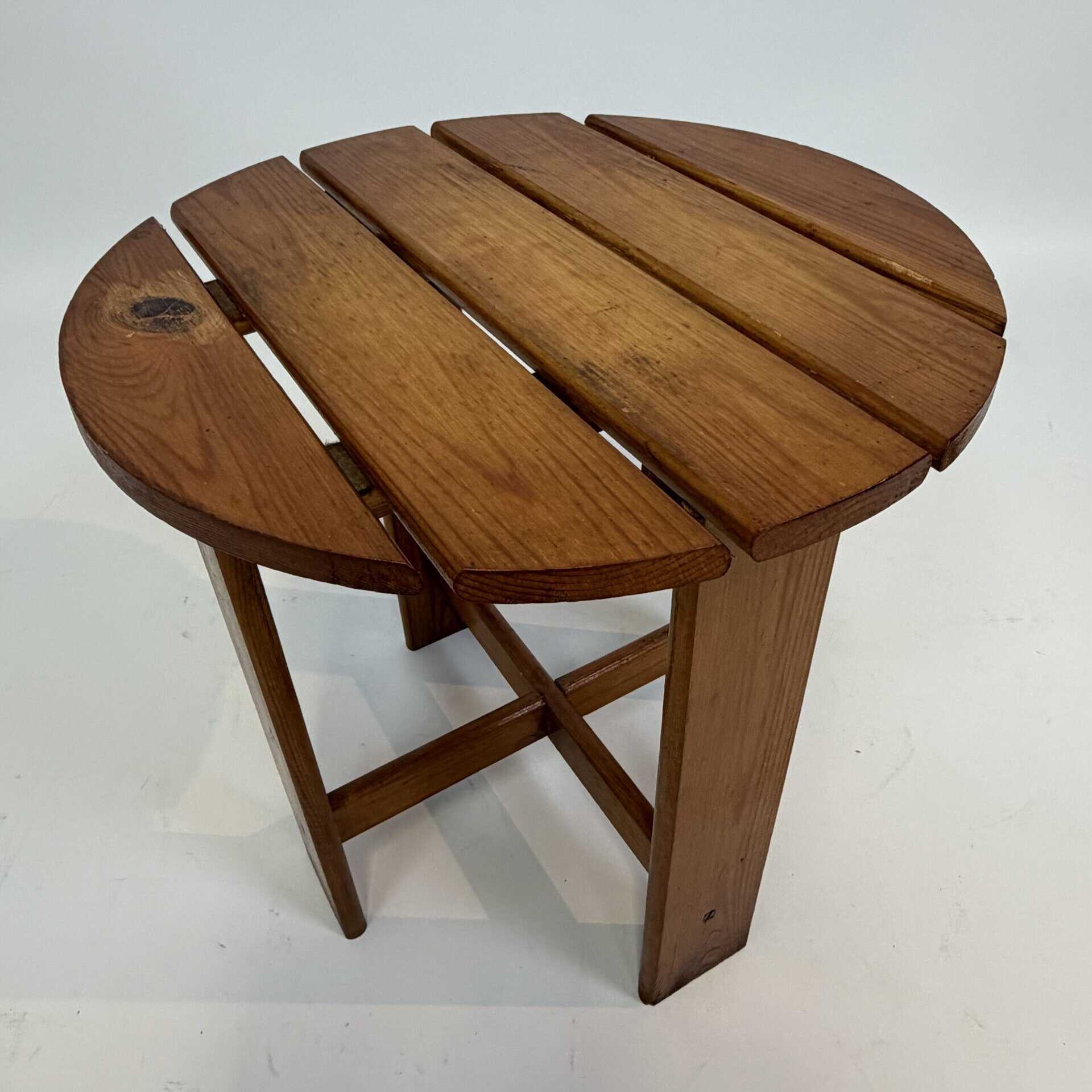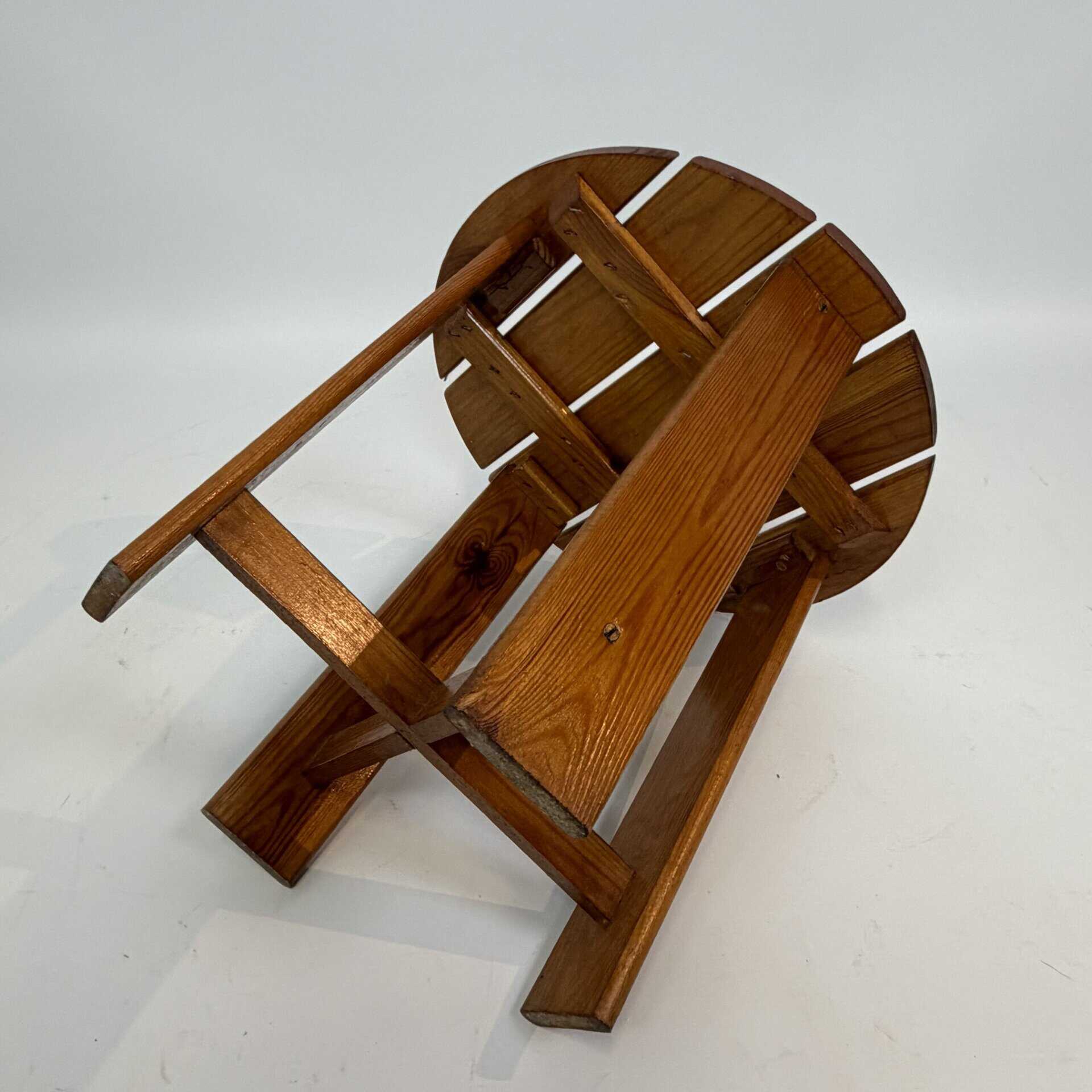 A round model consisting of slats, supported by a cross-leg base