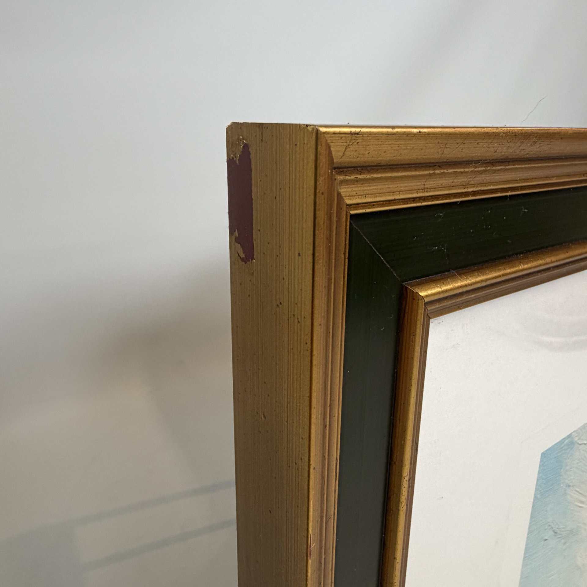 The gilded wooden frame with relief and black band has slight wear consistent with age