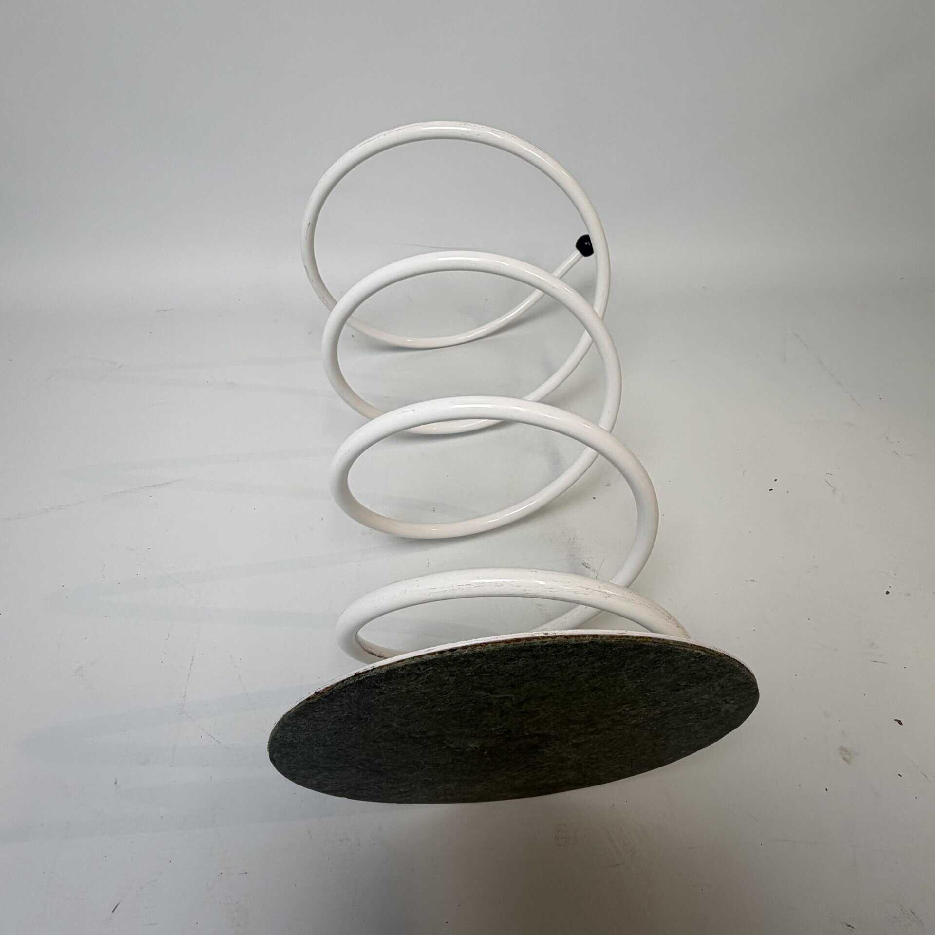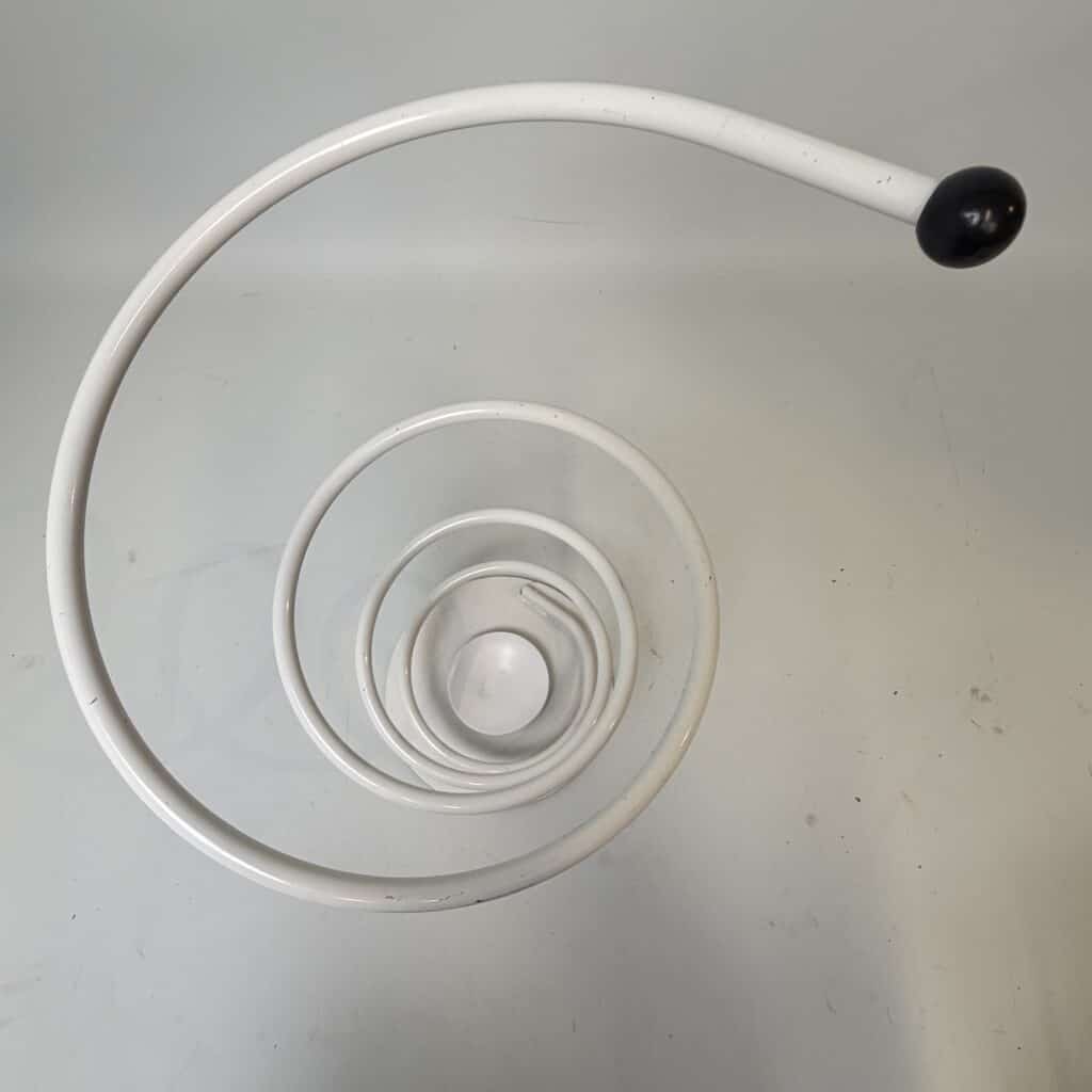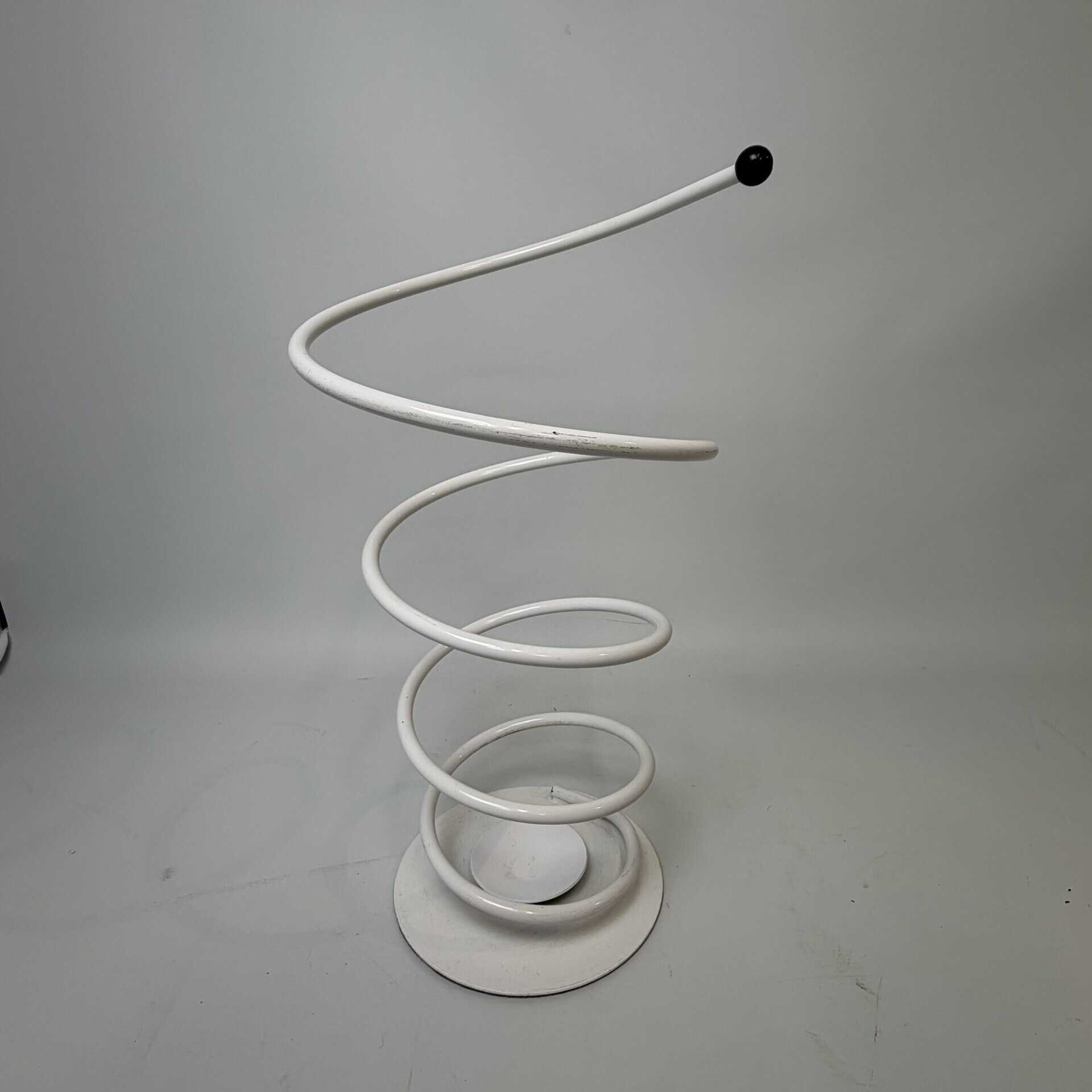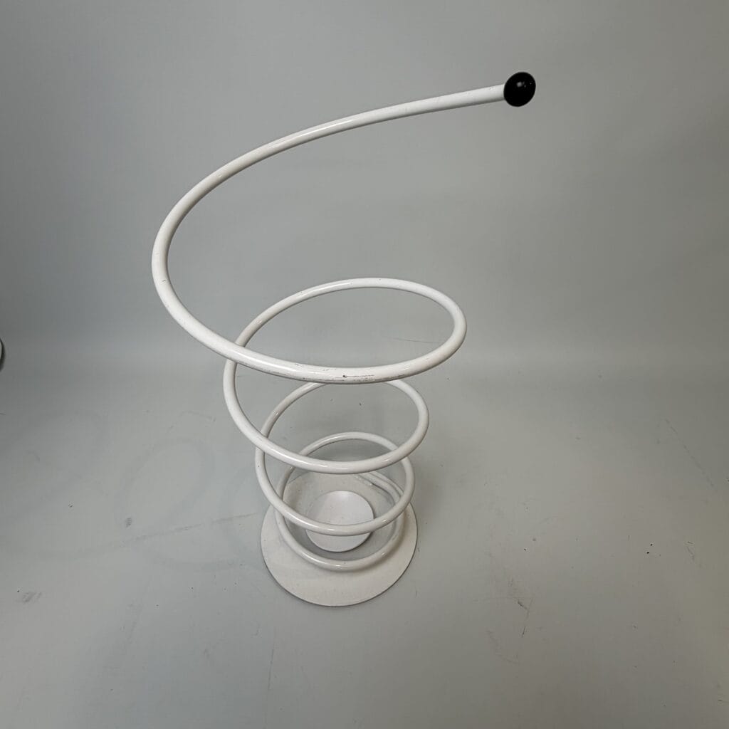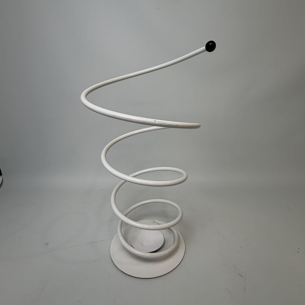 Pop Art umbrella stand in white lacquered metal with a black wooden ball at the end of the spiral