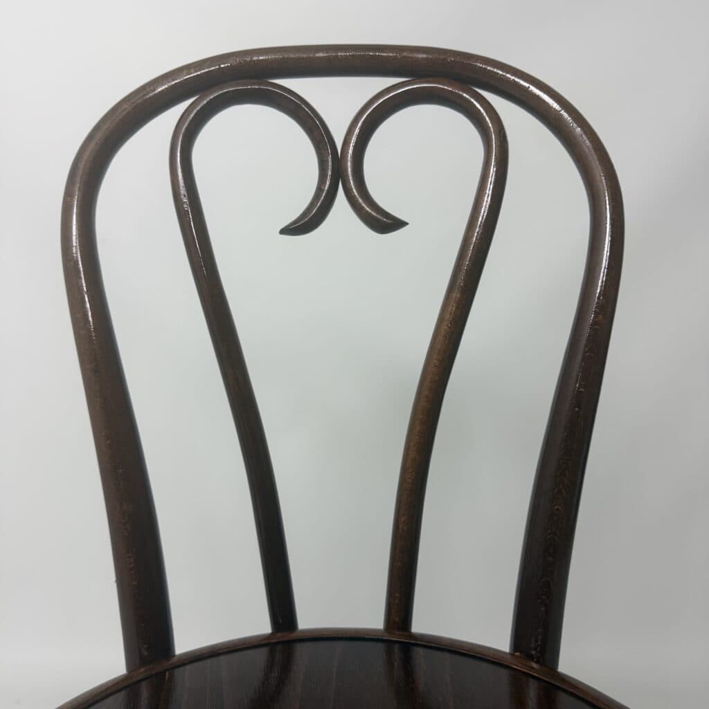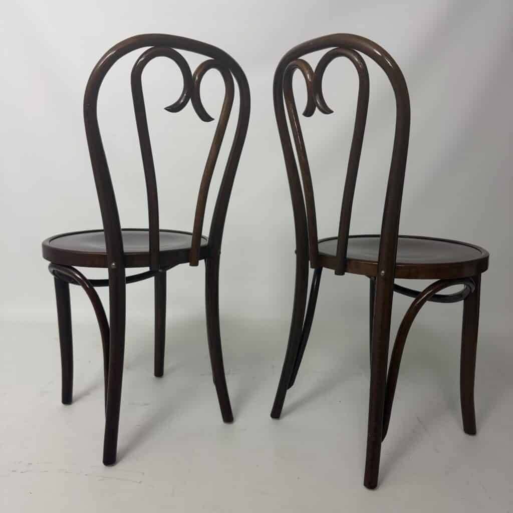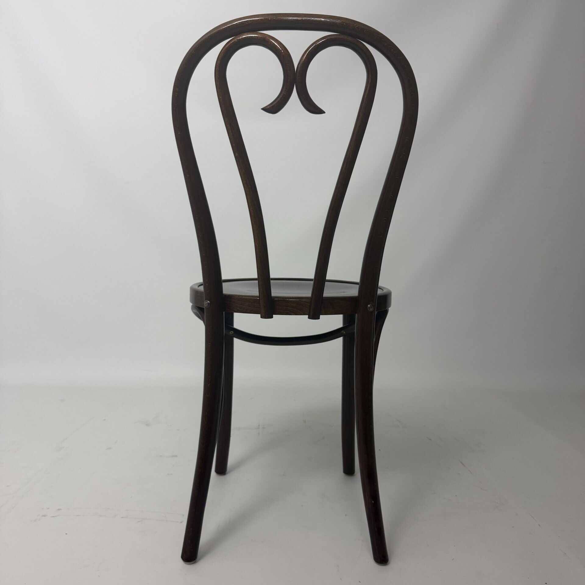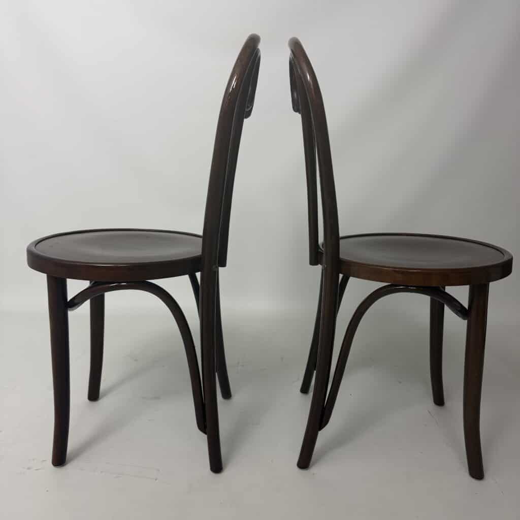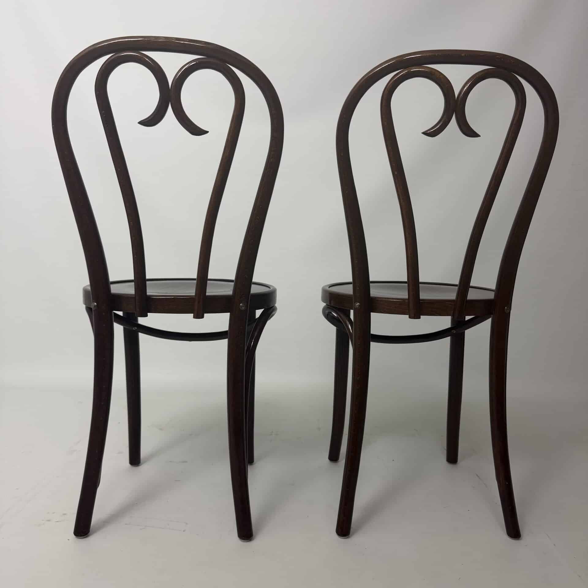 These bistro chairs in Jugendstil are made out of steam-bent beechwood, a traditional method used for lightweight but sturdy seating with a dark stained wood finish