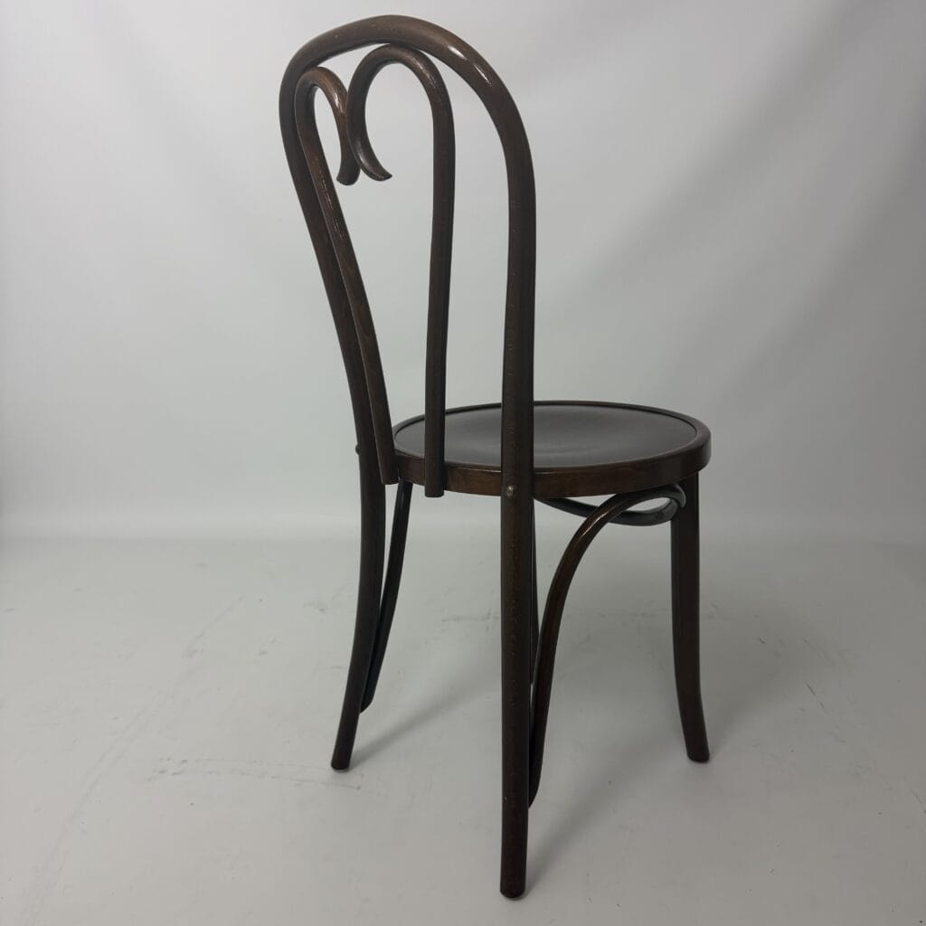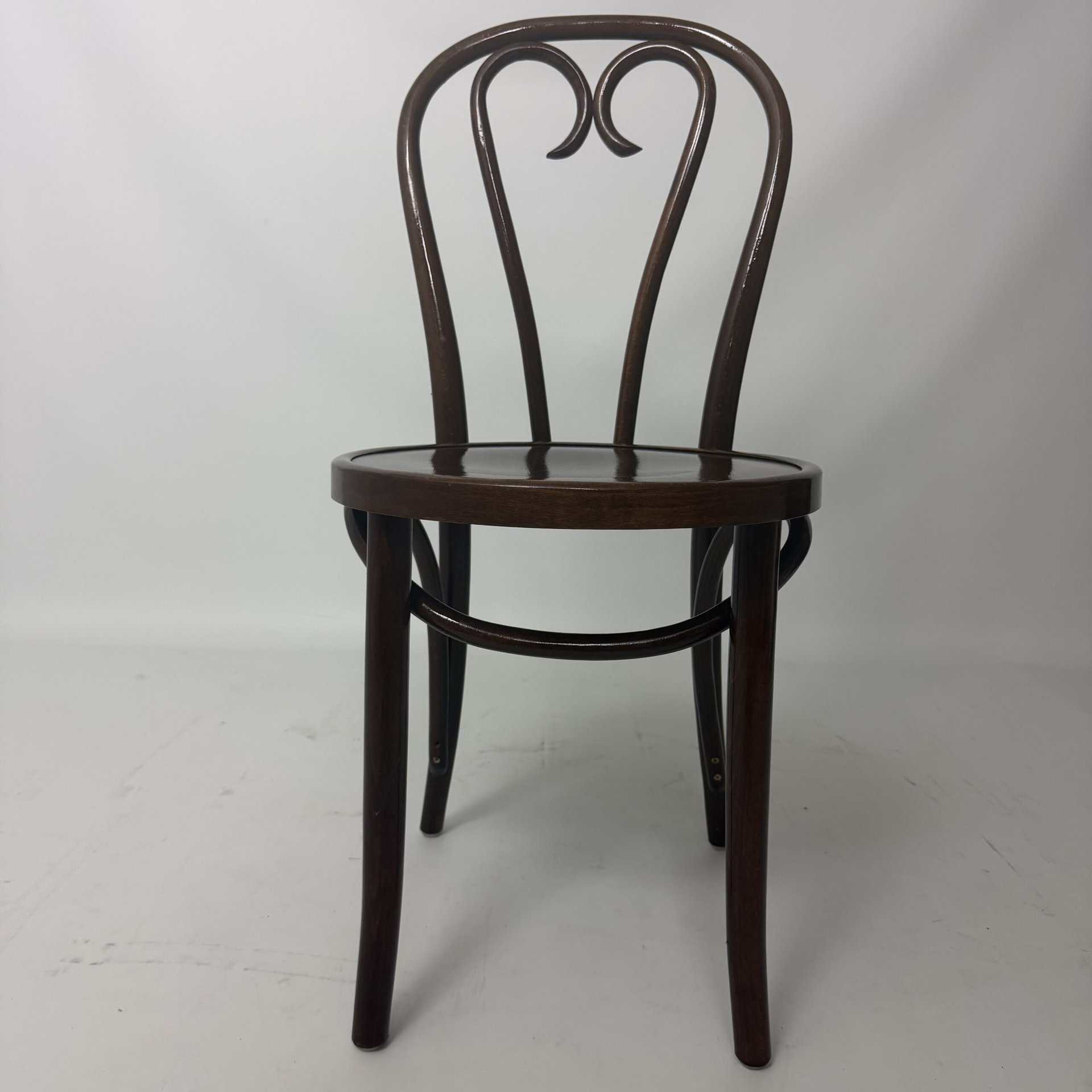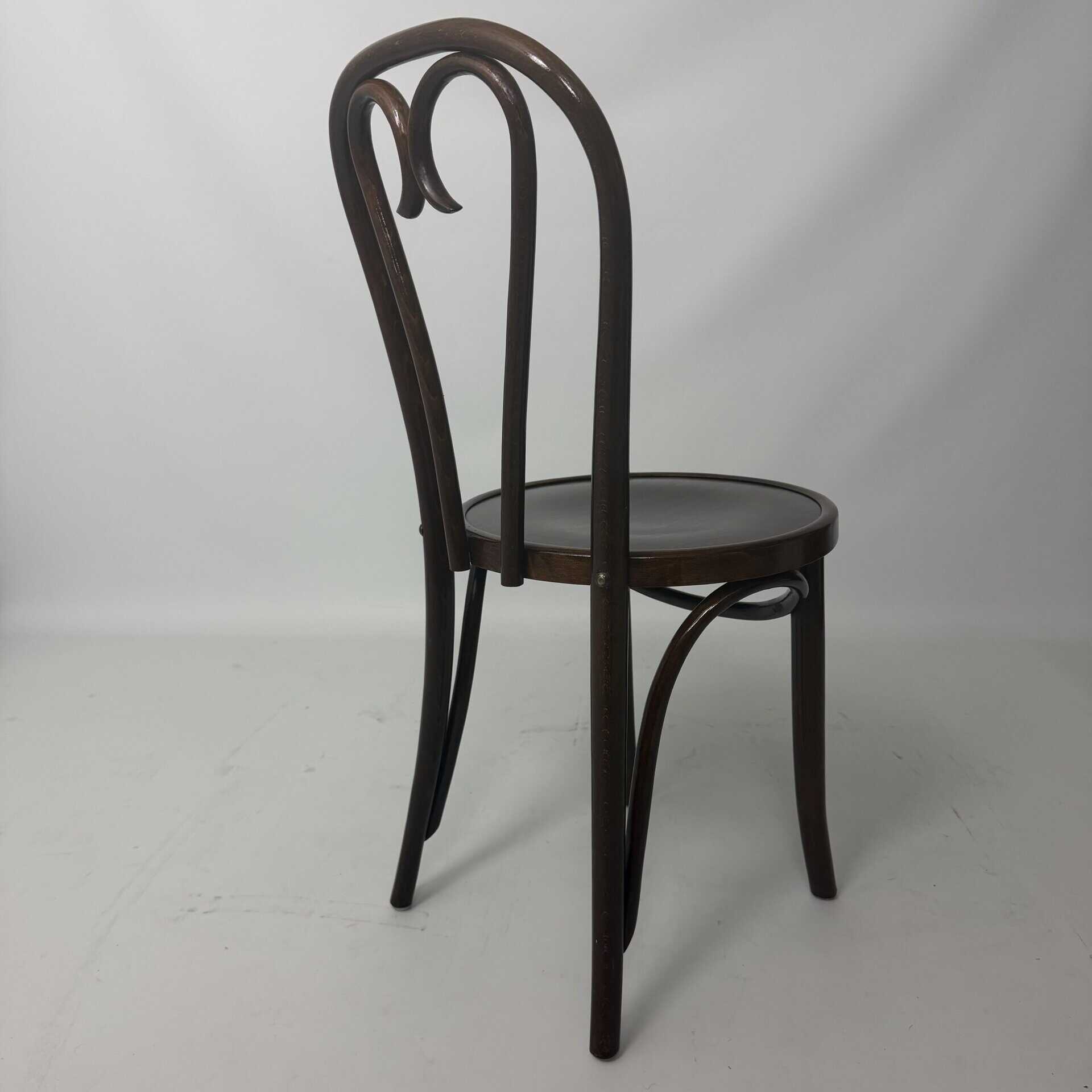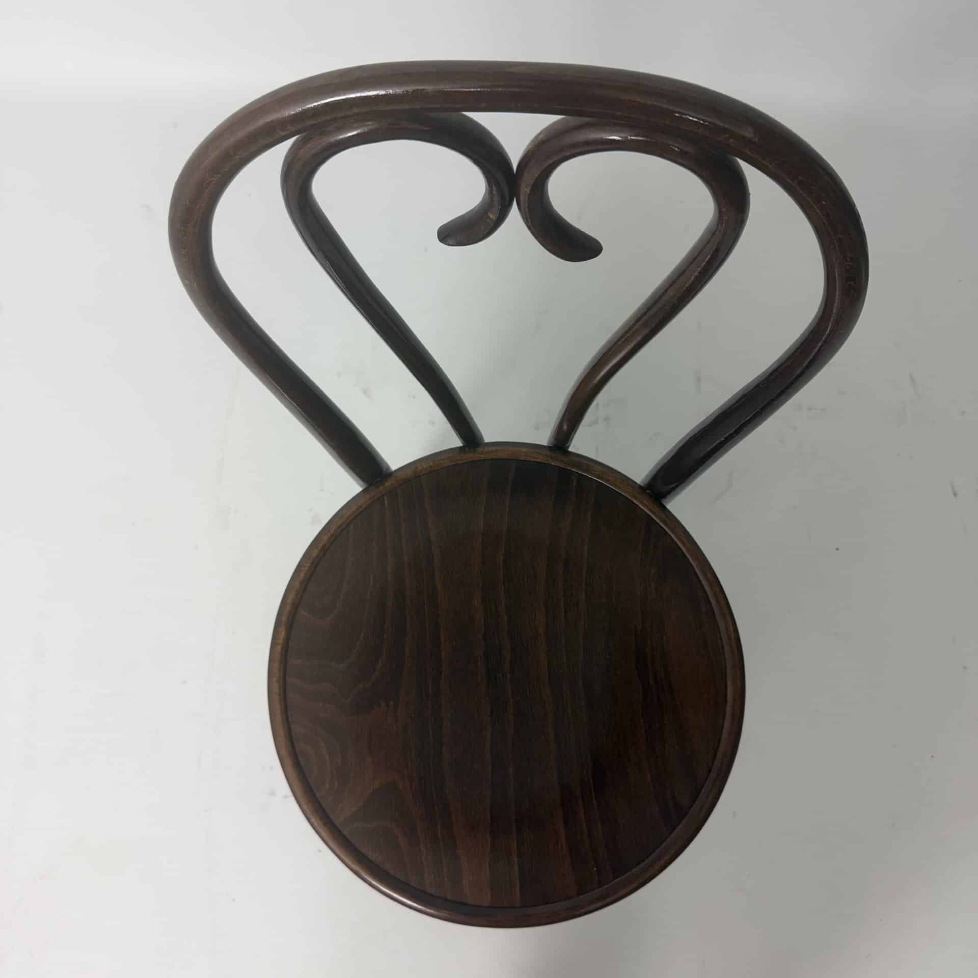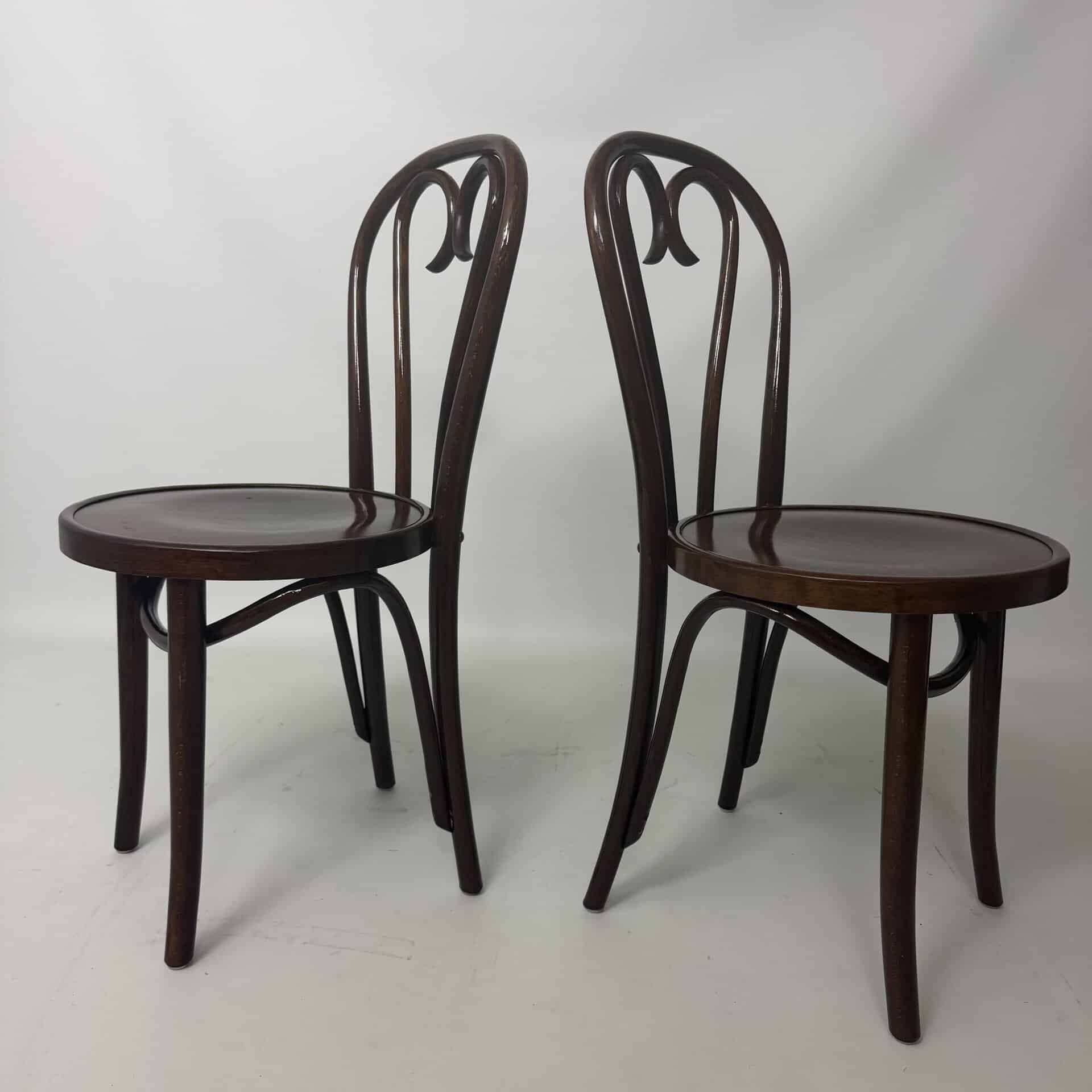 These bistro chairs in Jugendstil are made out of steam-bent beechwood, a traditional method used for lightweight but sturdy seating with a dark stained wood finish