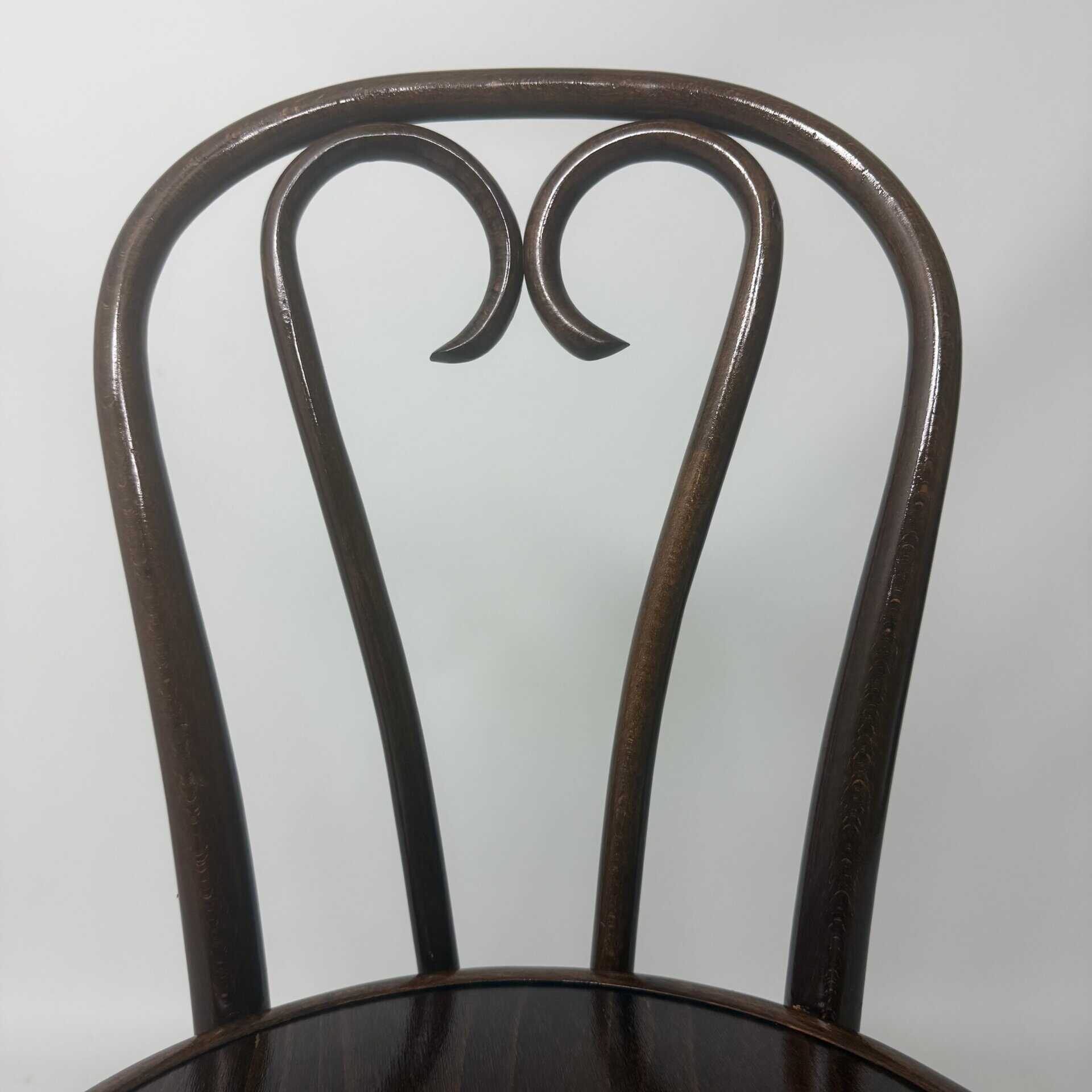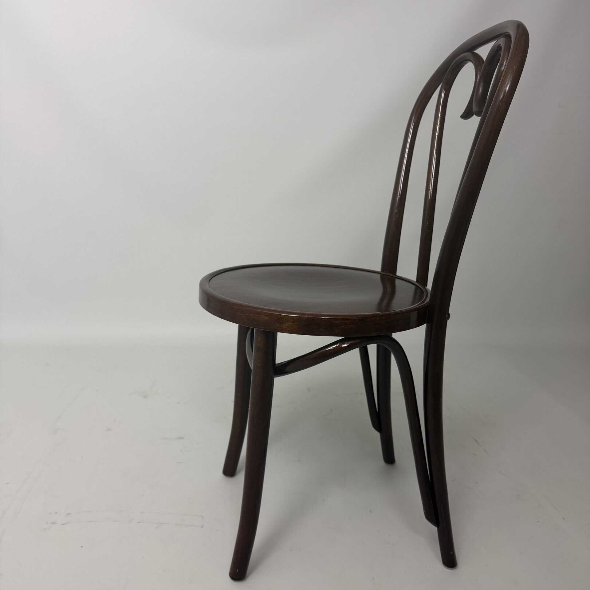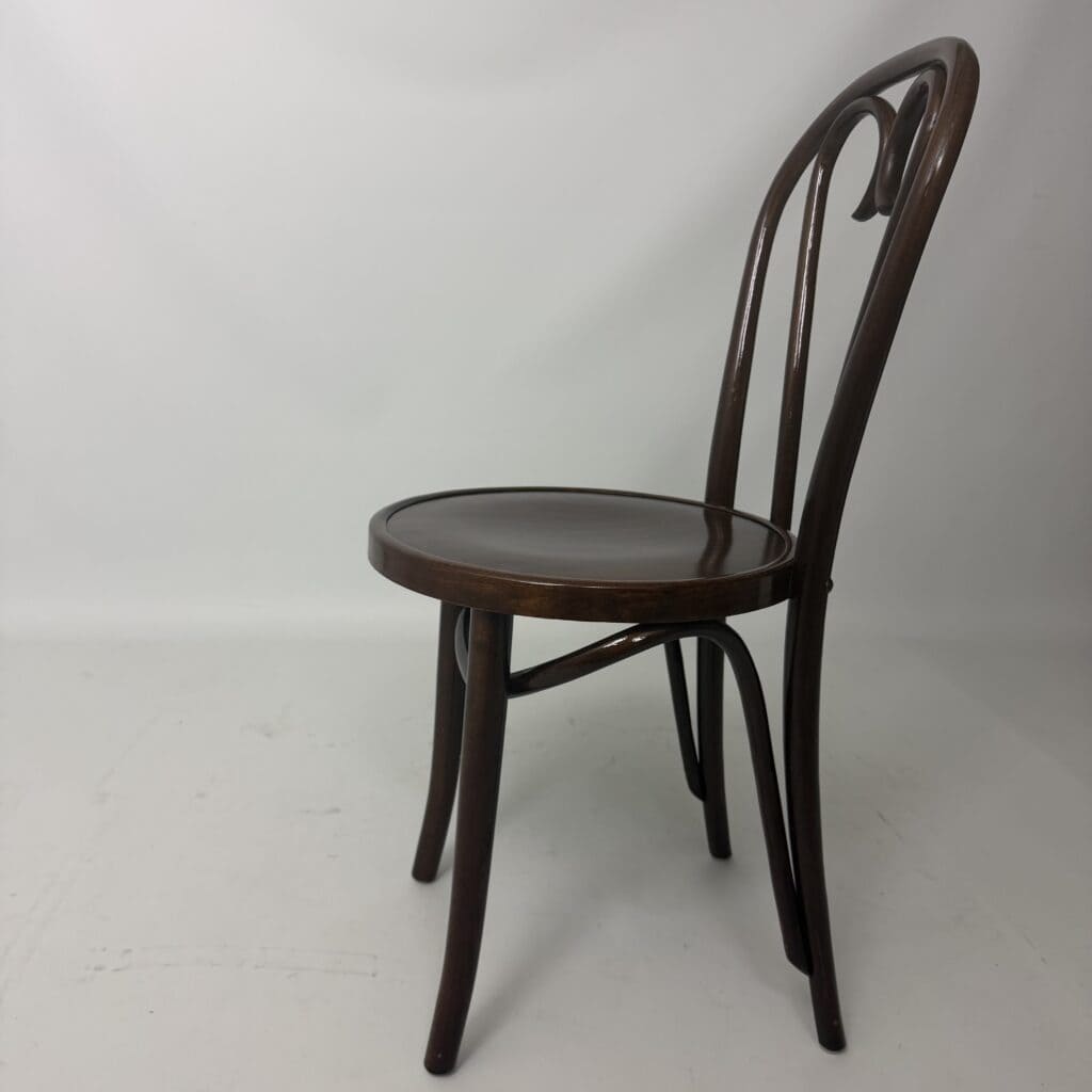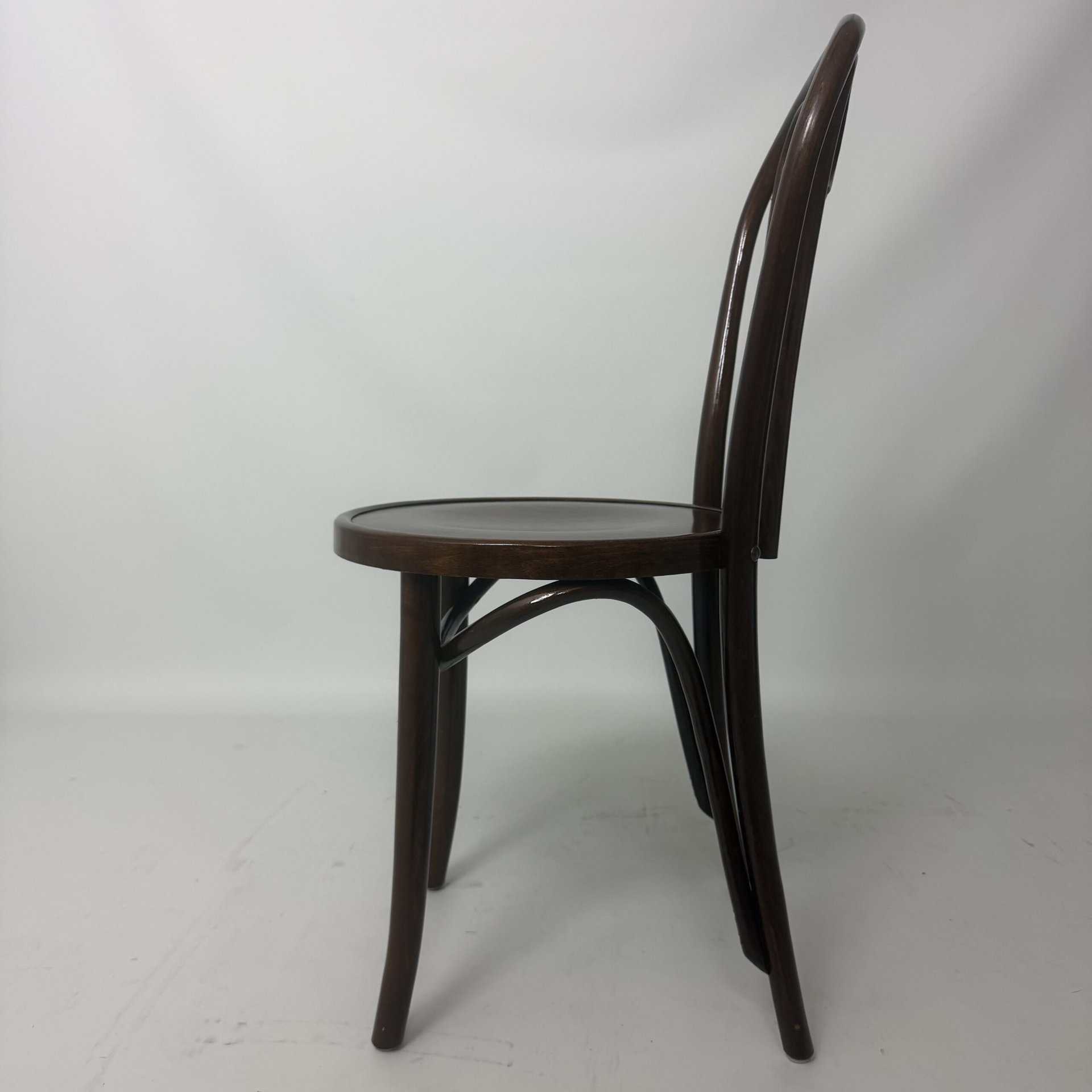 These bistro chairs in Jugendstil are made out of steam-bent beechwood, a traditional method used for lightweight but sturdy seating with a dark stained wood finish