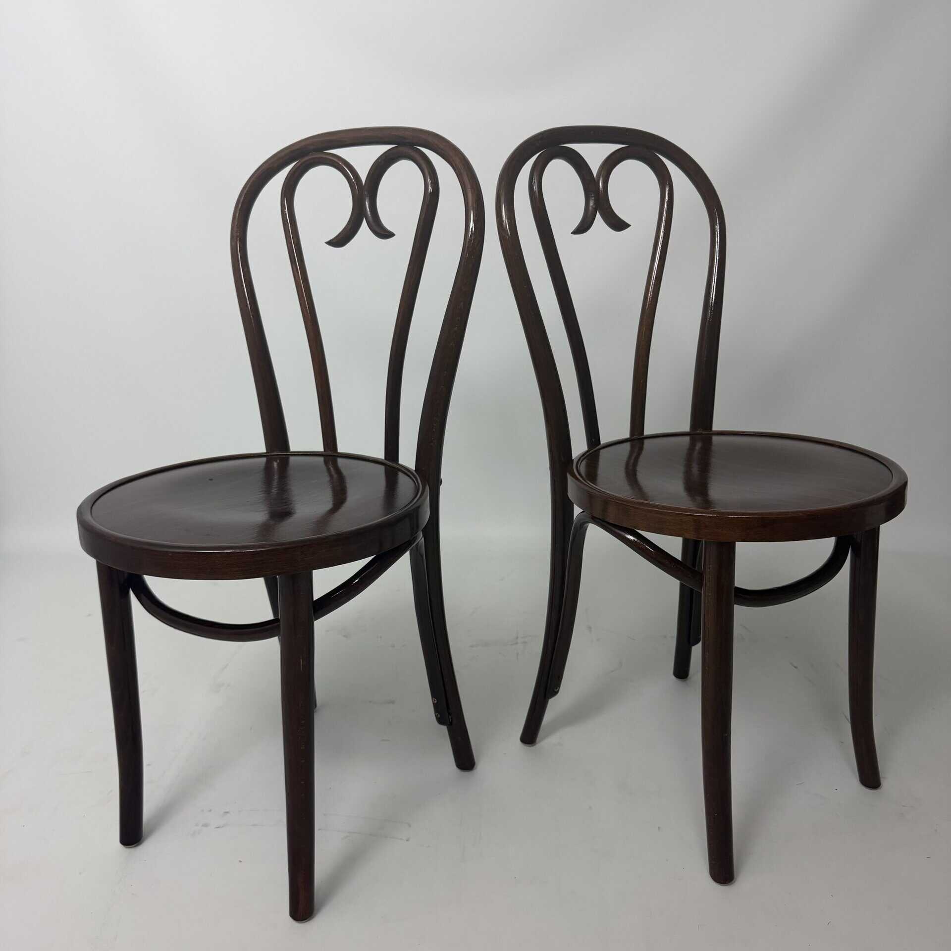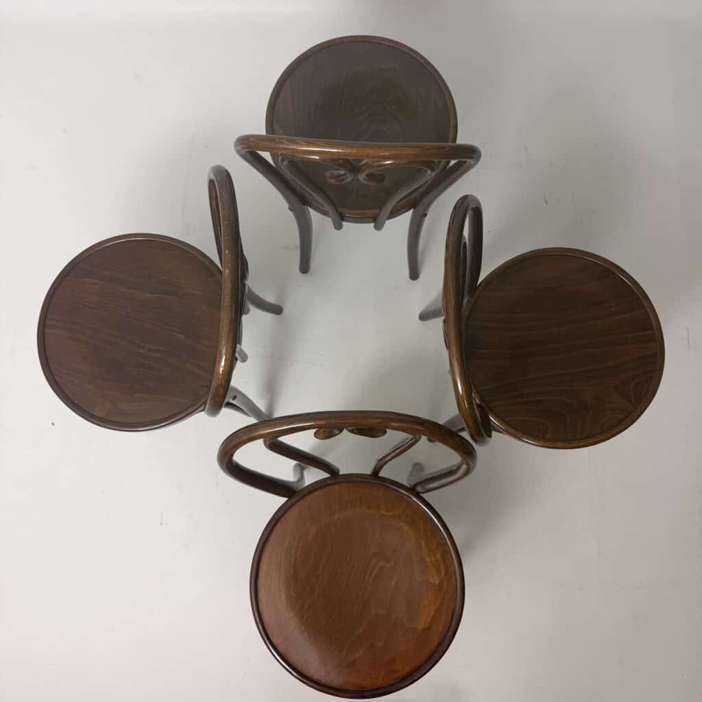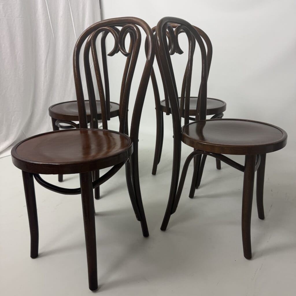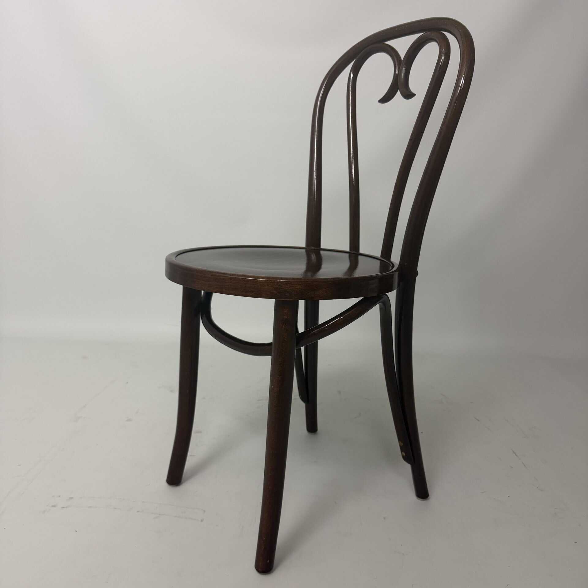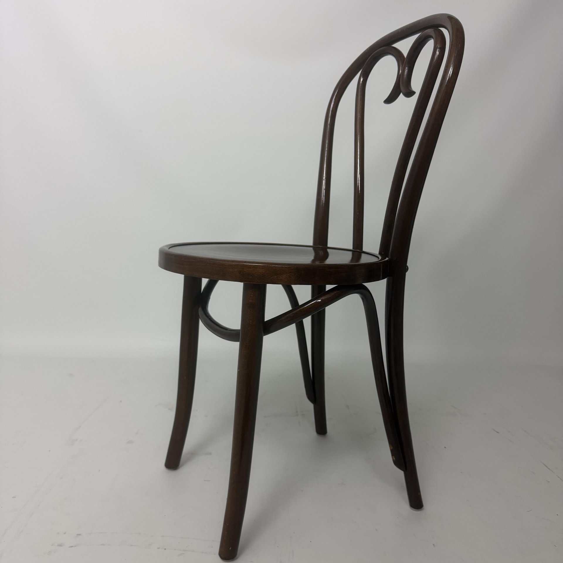 These bistro chairs in Jugendstil are made out of steam-bent beechwood, a traditional method used for lightweight but sturdy seating with a dark stained wood finish