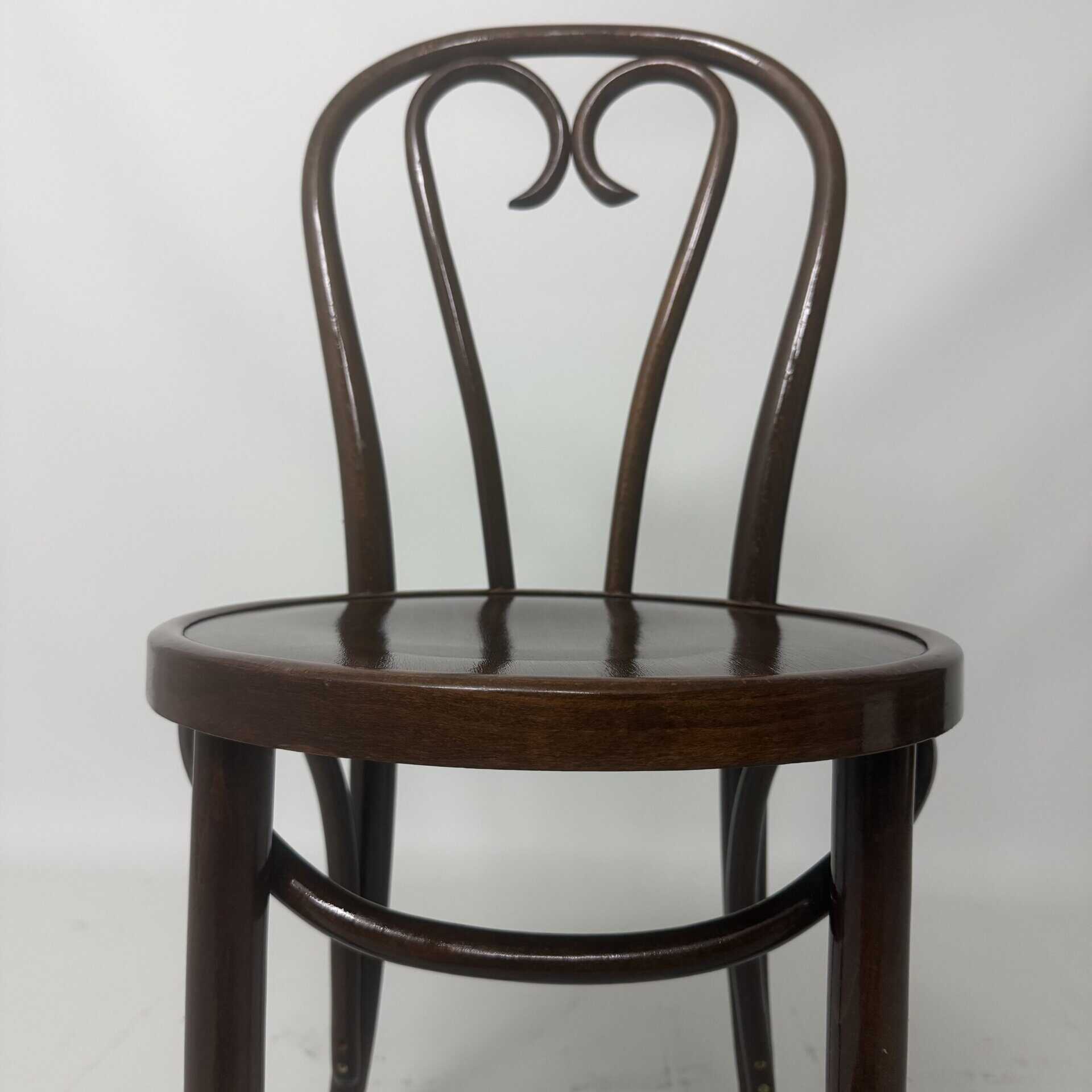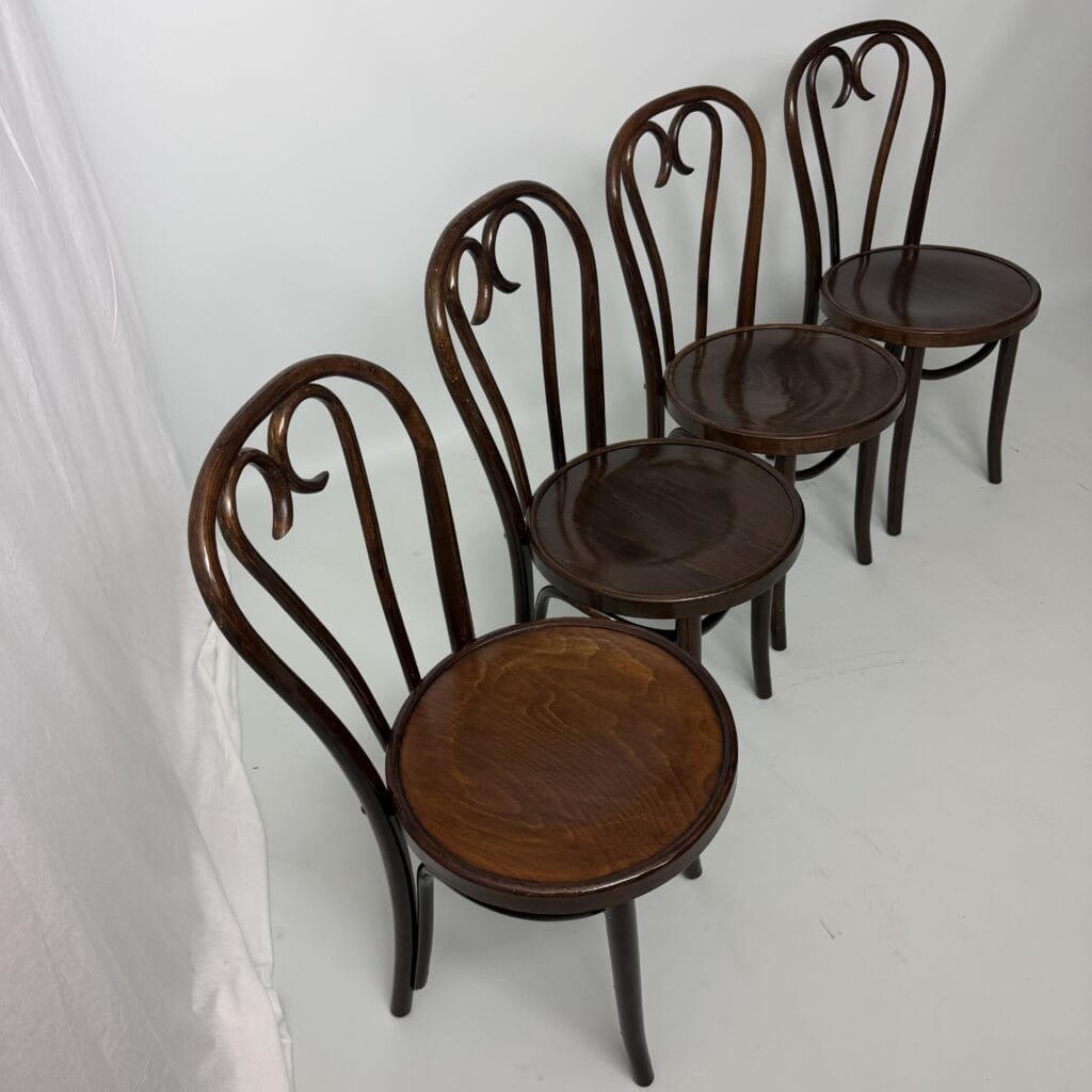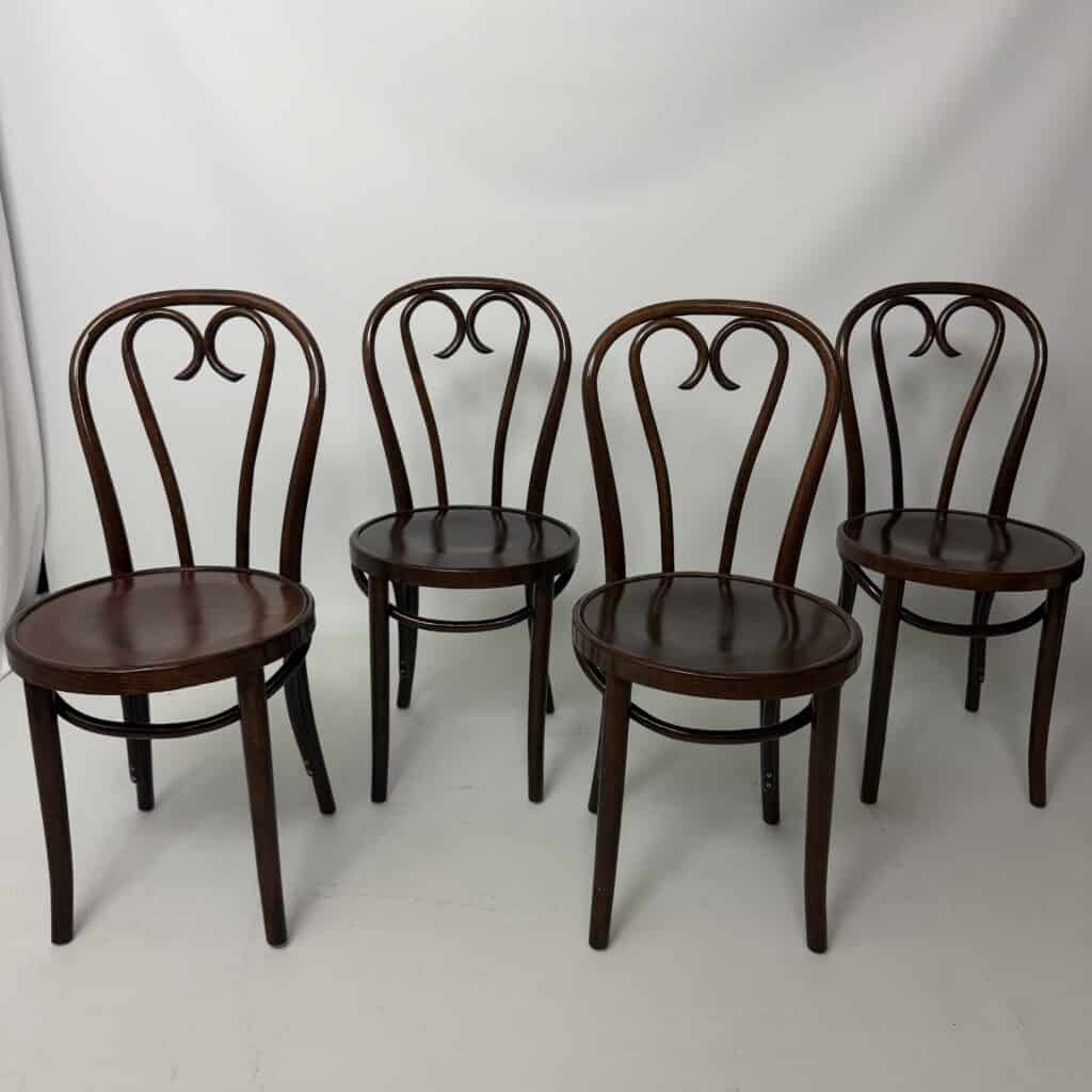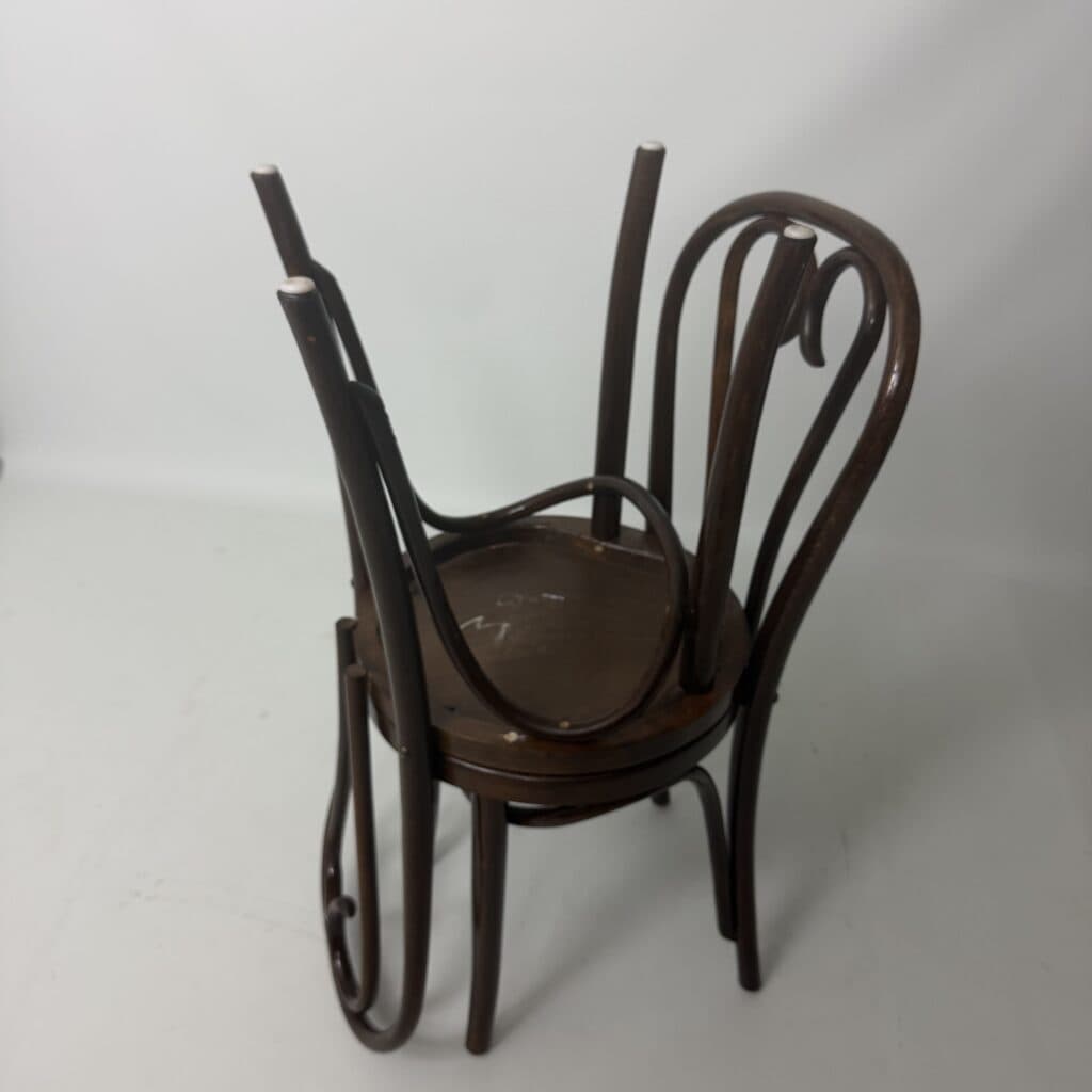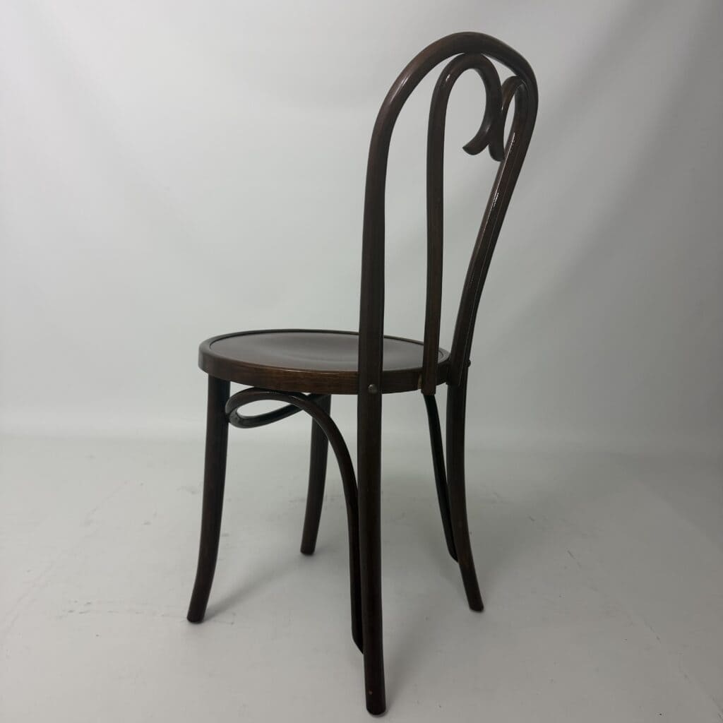 These bistro chairs in Jugendstil are made out of steam-bent beechwood, a traditional method used for lightweight but sturdy seating with a dark stained wood finish