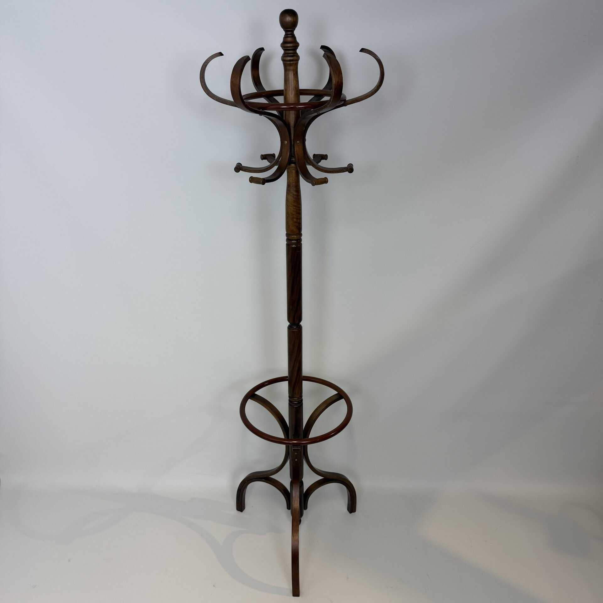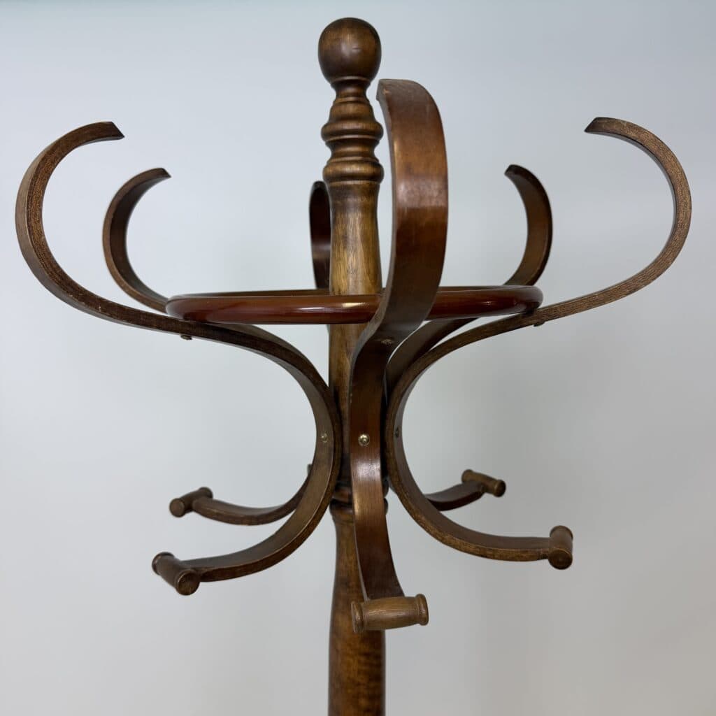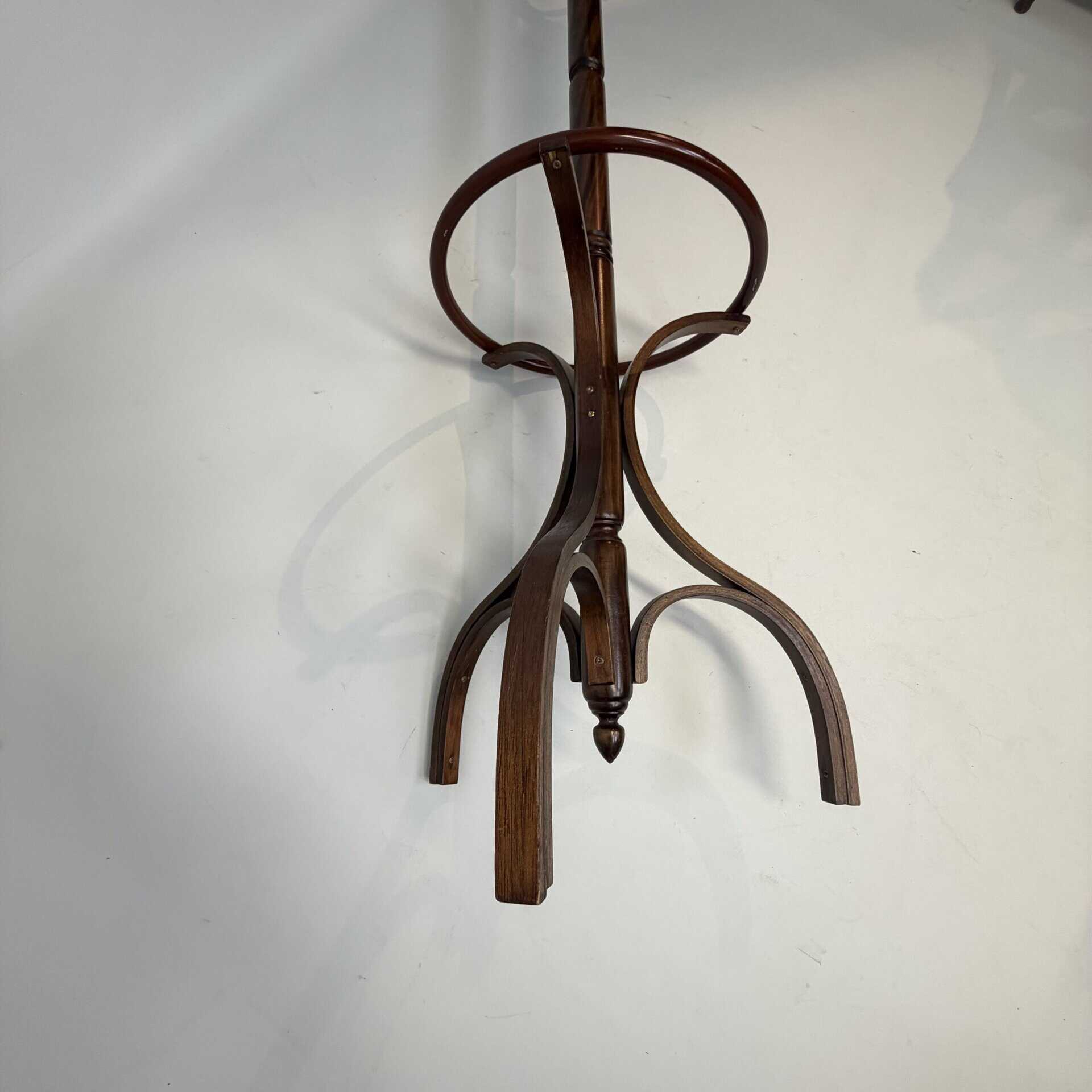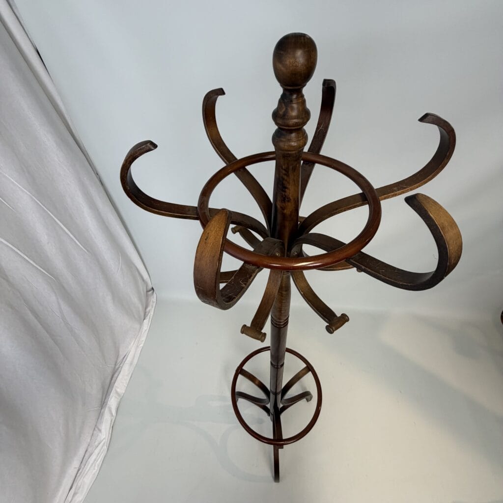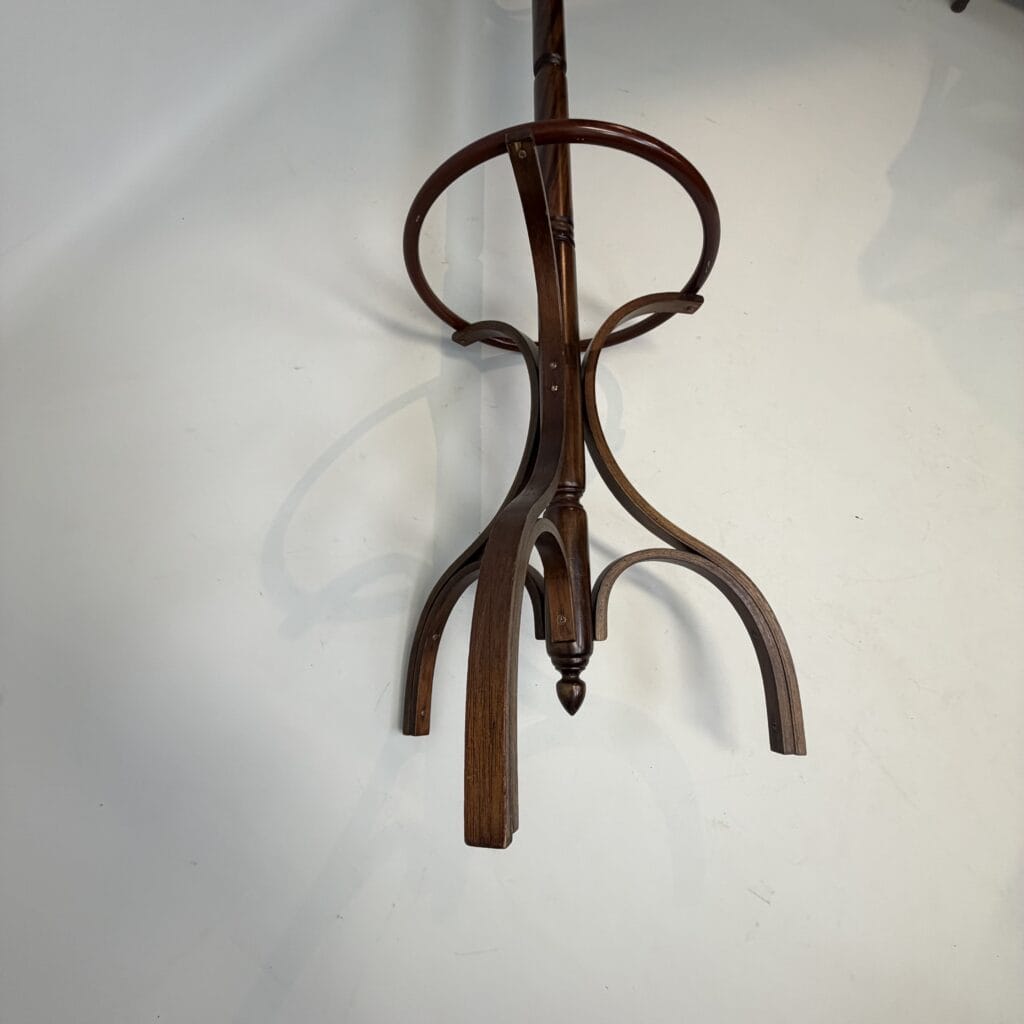 This wooden coat rack  has a rotating top section with “S” shaped hooks for hats and coats, a turned central post, and a tripod or quadrupod base with a ring for holding umbrellas or canes