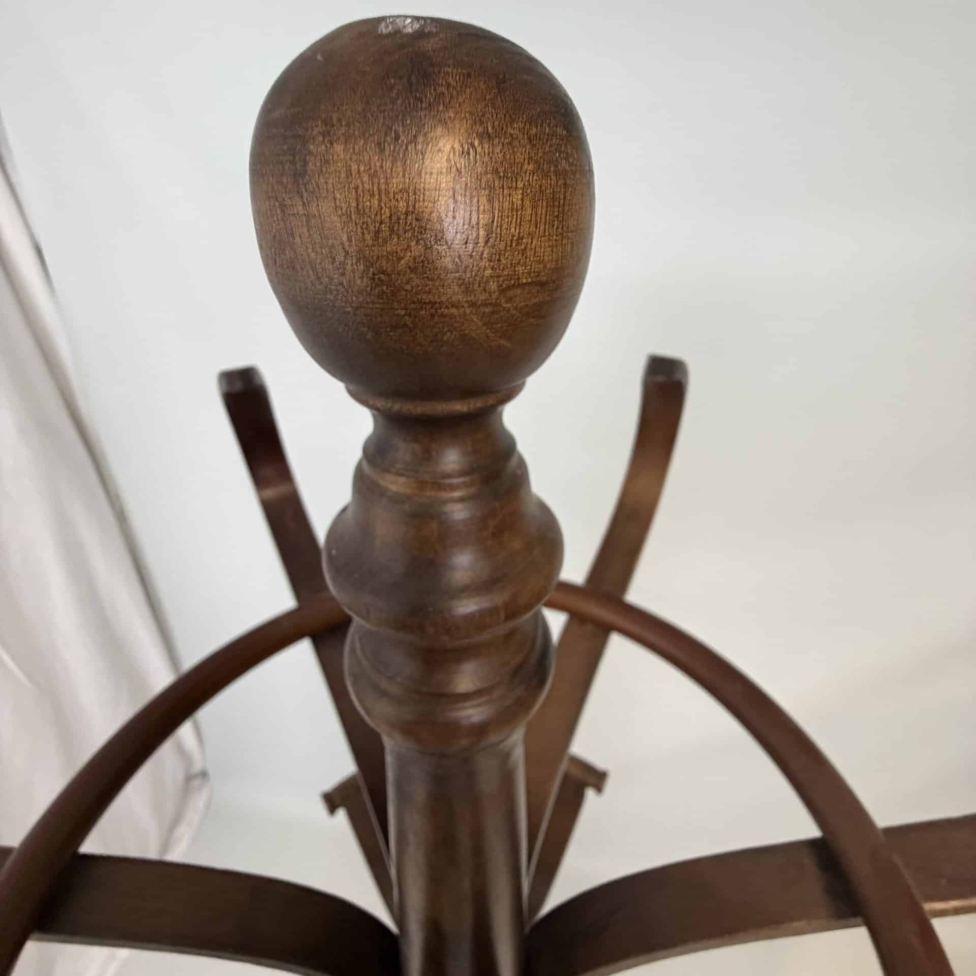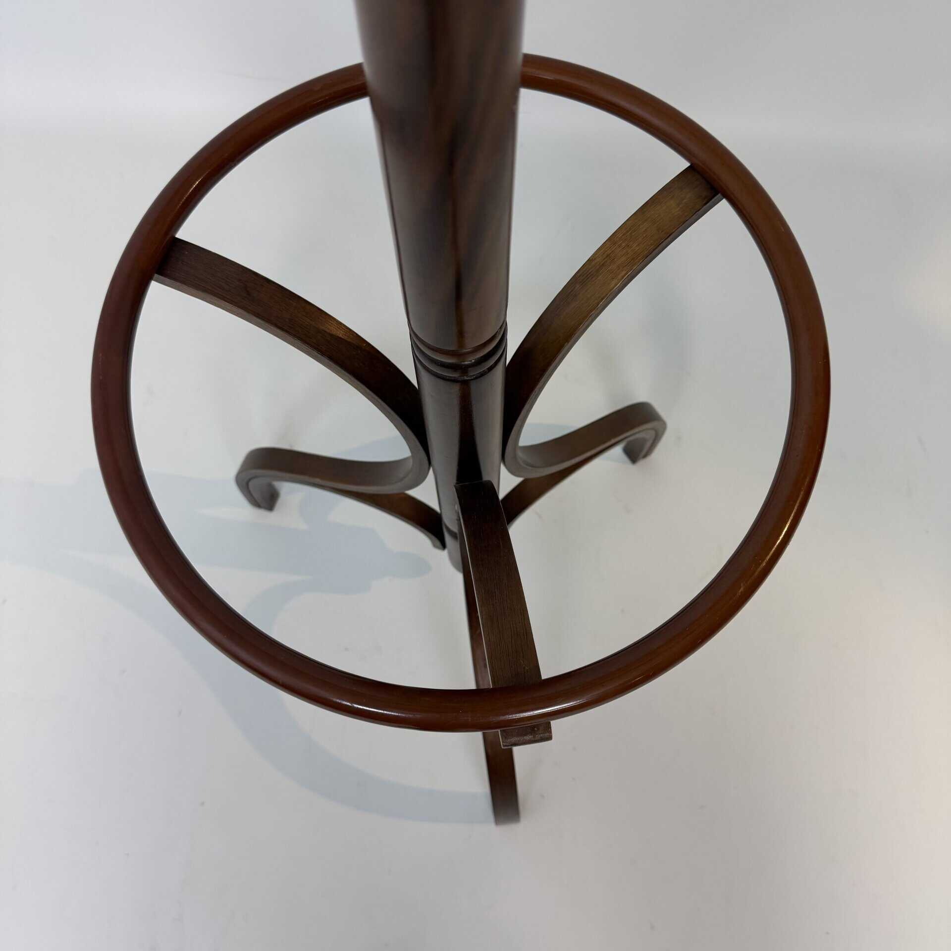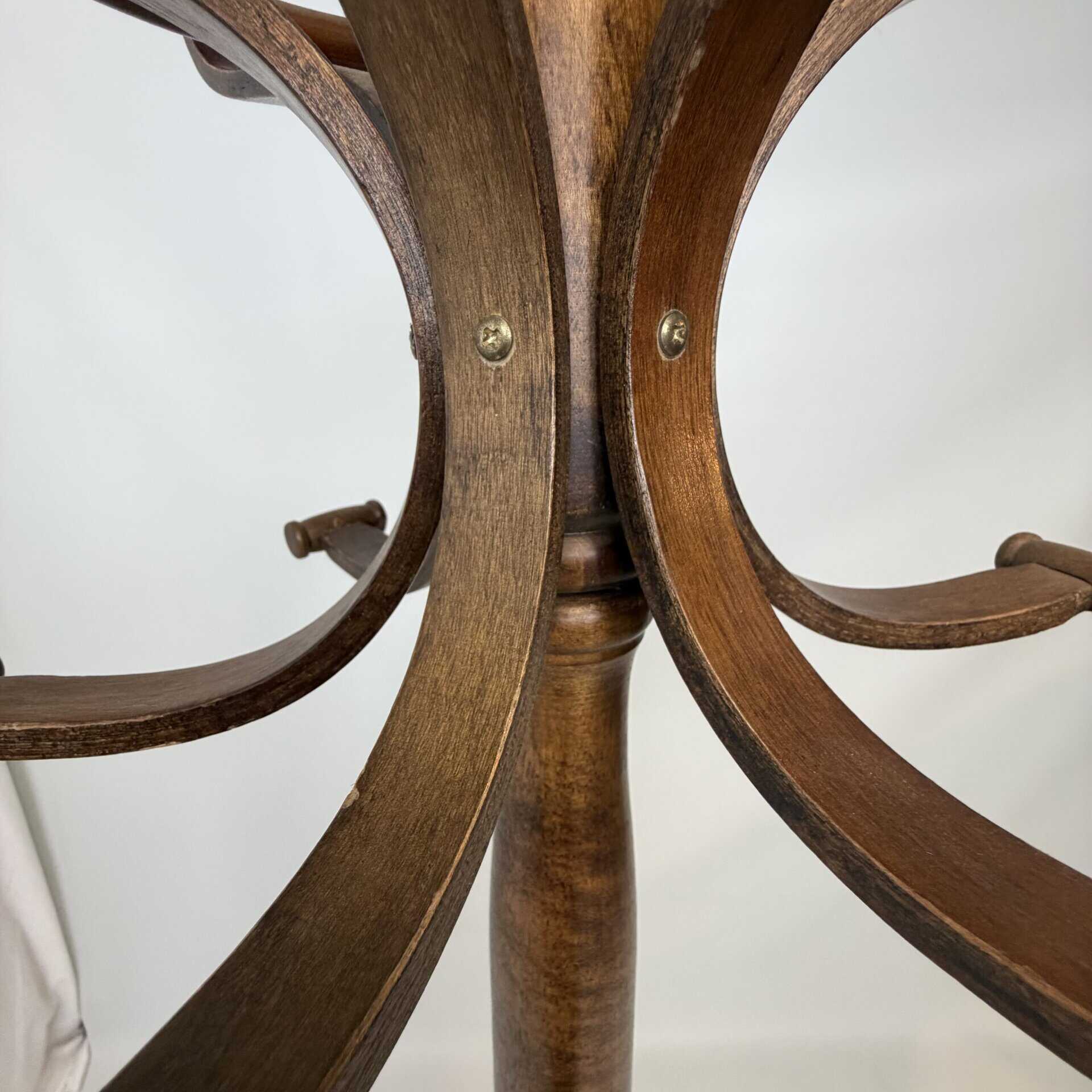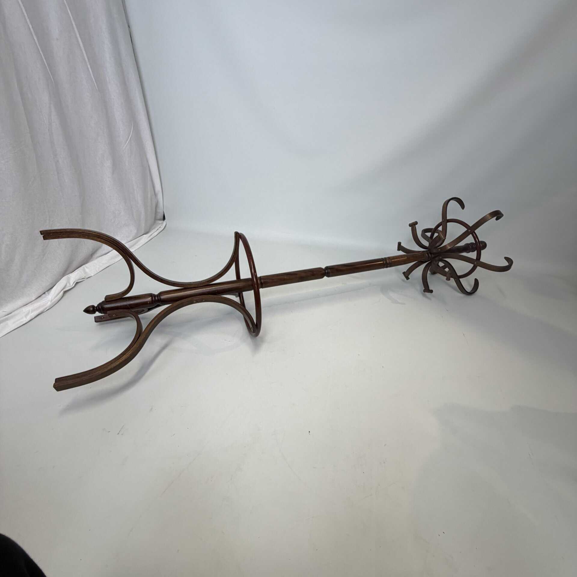 This wooden coat rack  has a rotating top section with “S” shaped hooks for hats and coats, a turned central post, and a tripod or quadrupod base with a ring for holding umbrellas or canes