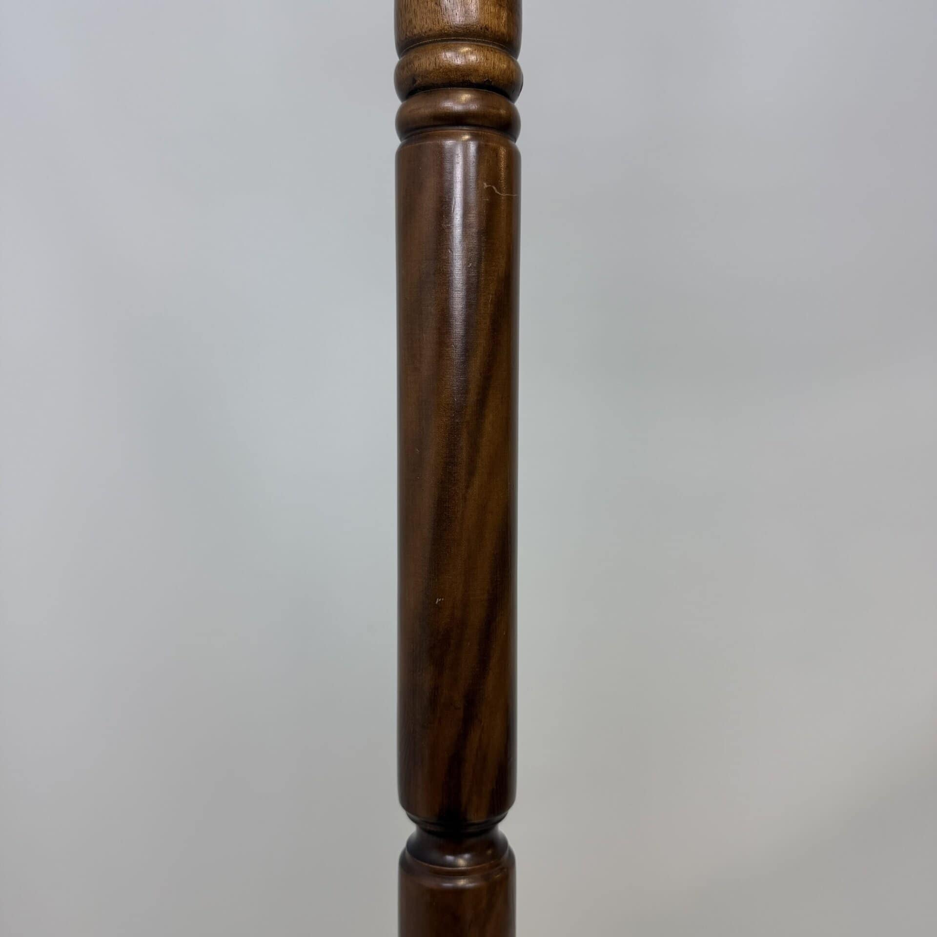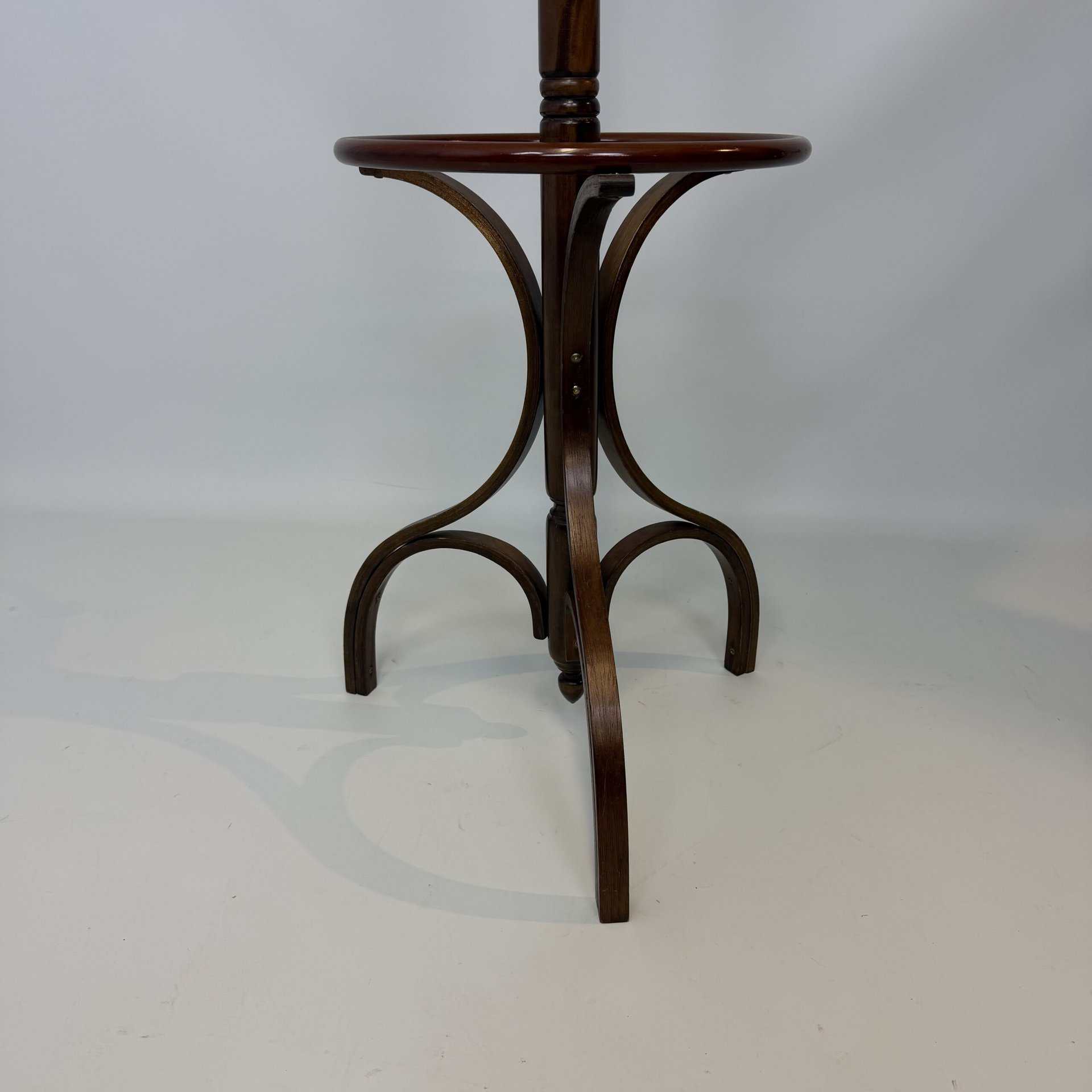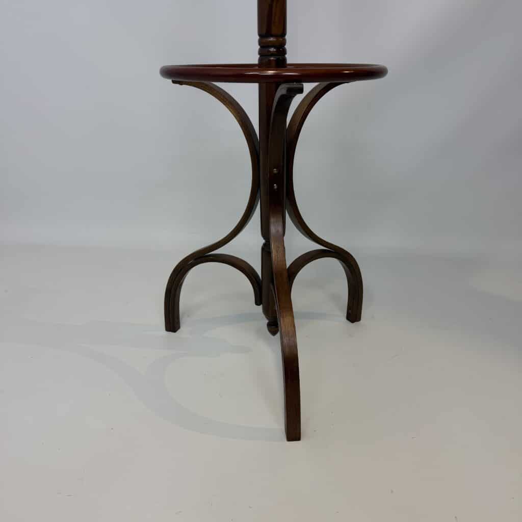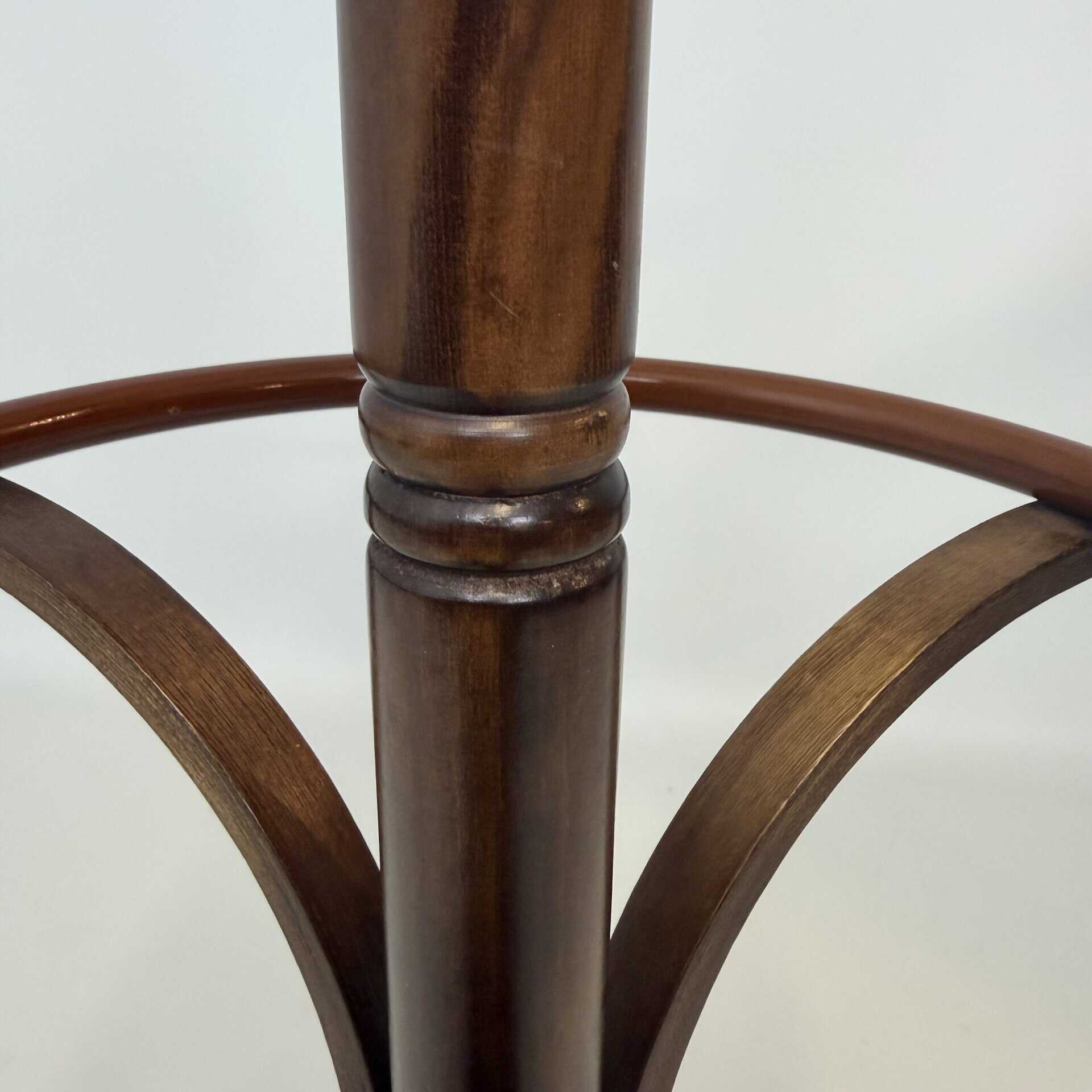 This wooden coat rack  has a rotating top section with “S” shaped hooks for hats and coats, a turned central post, and a tripod or quadrupod base with a ring for holding umbrellas or canes