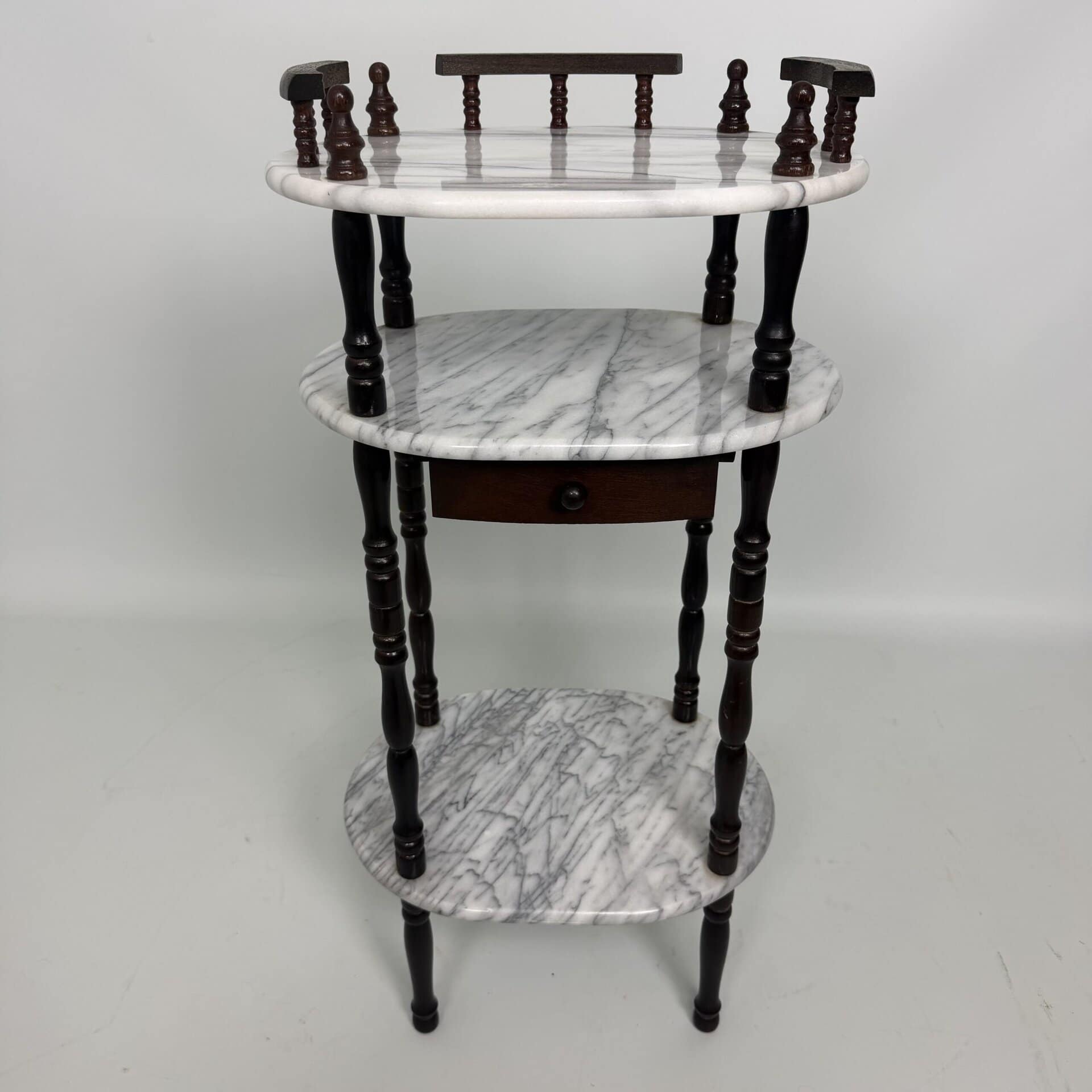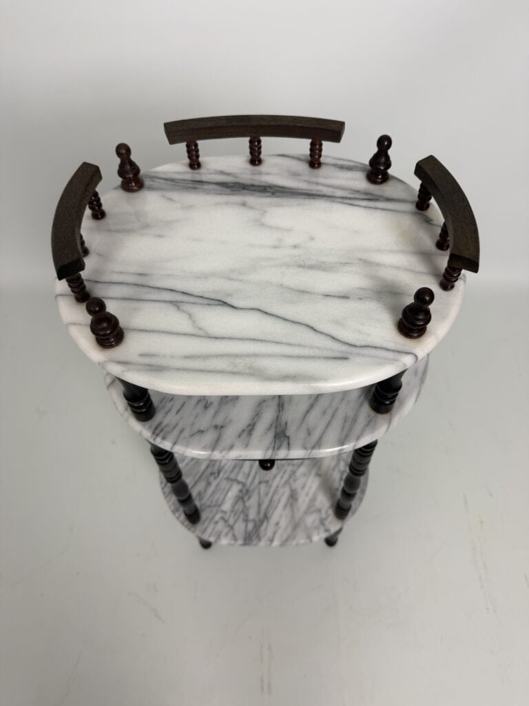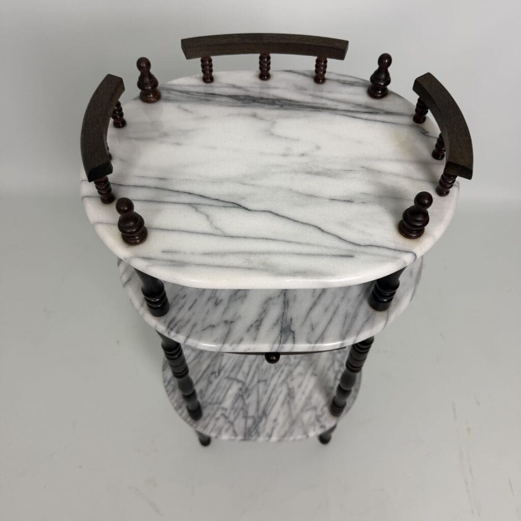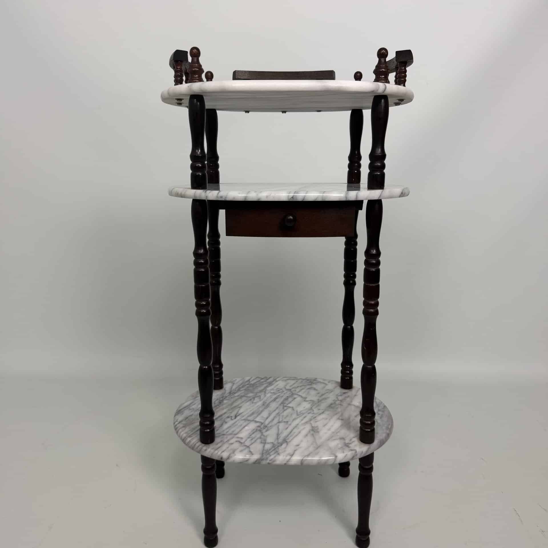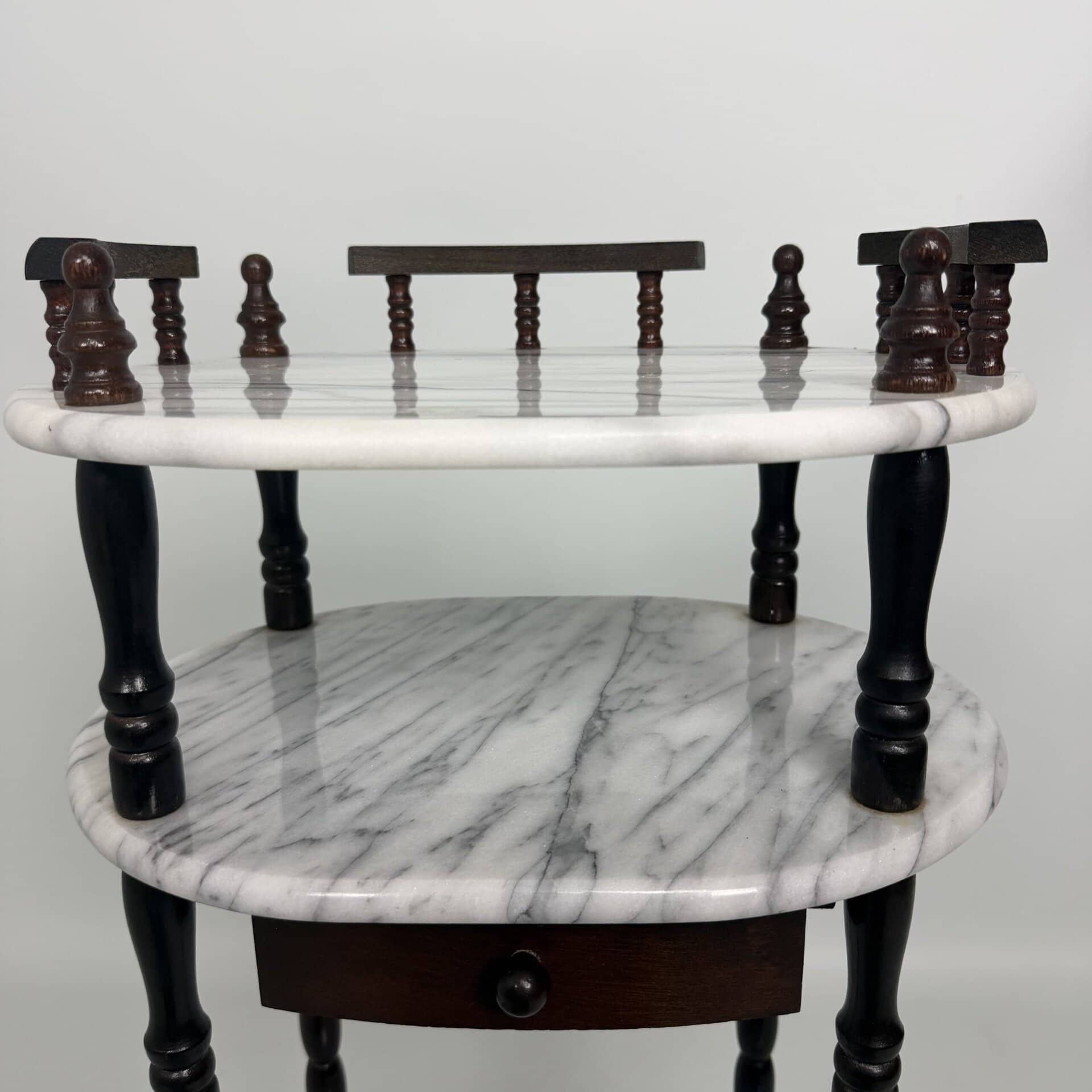 Side table with carrara marble shelves and dark wood turned legs