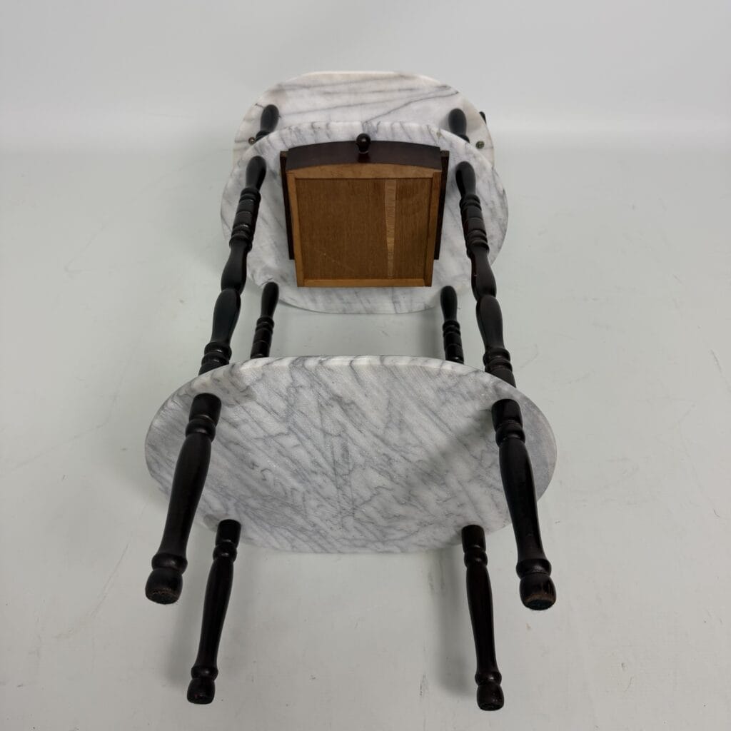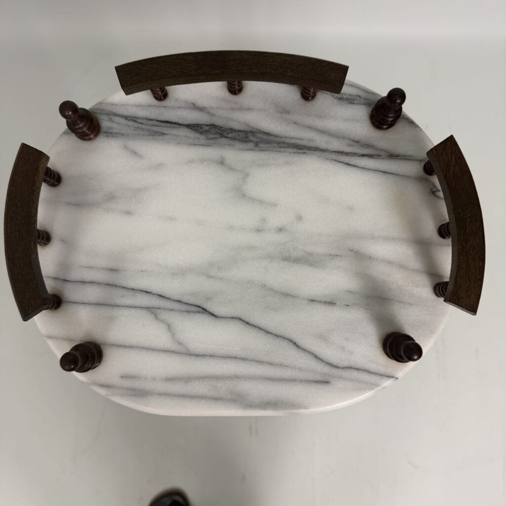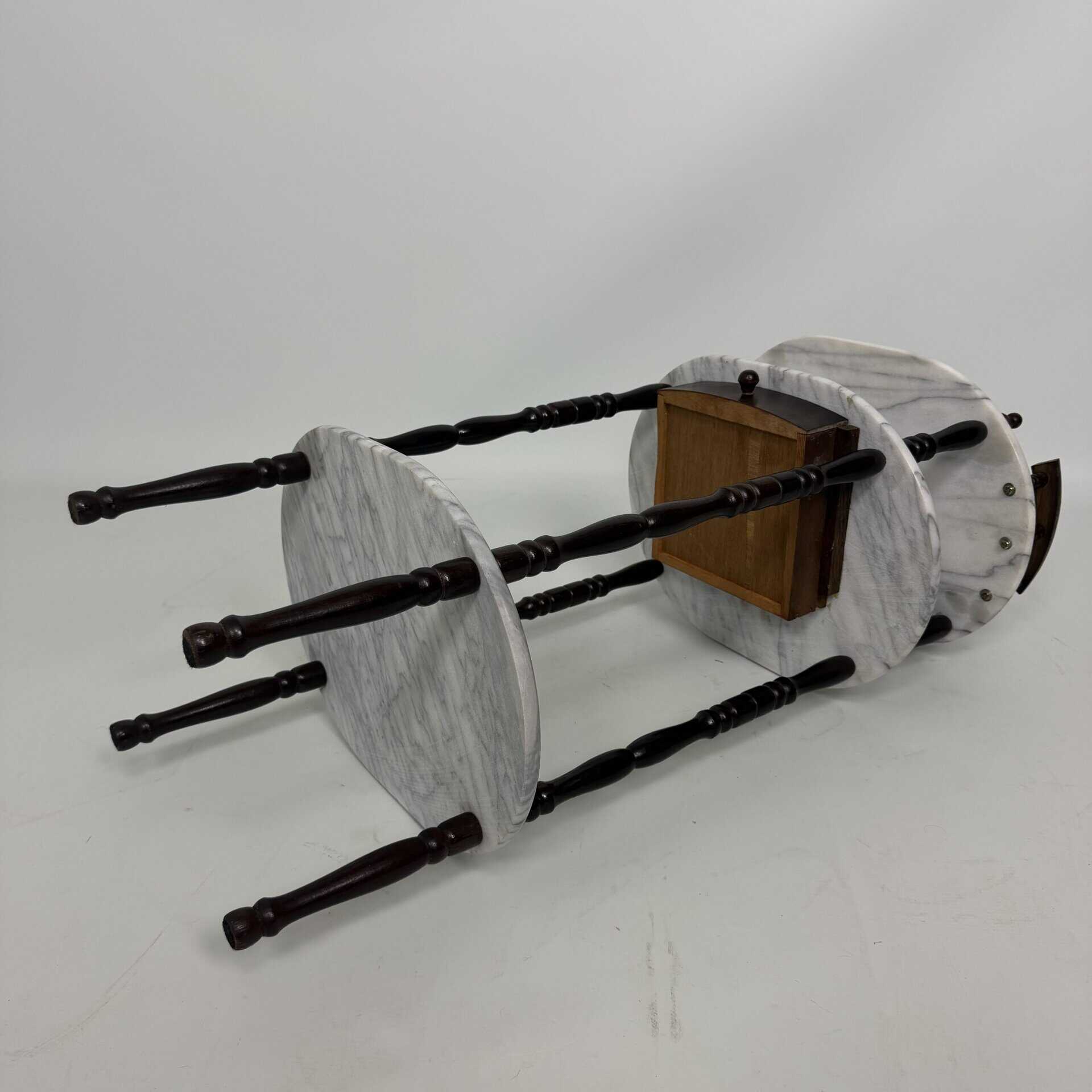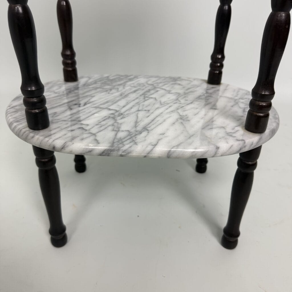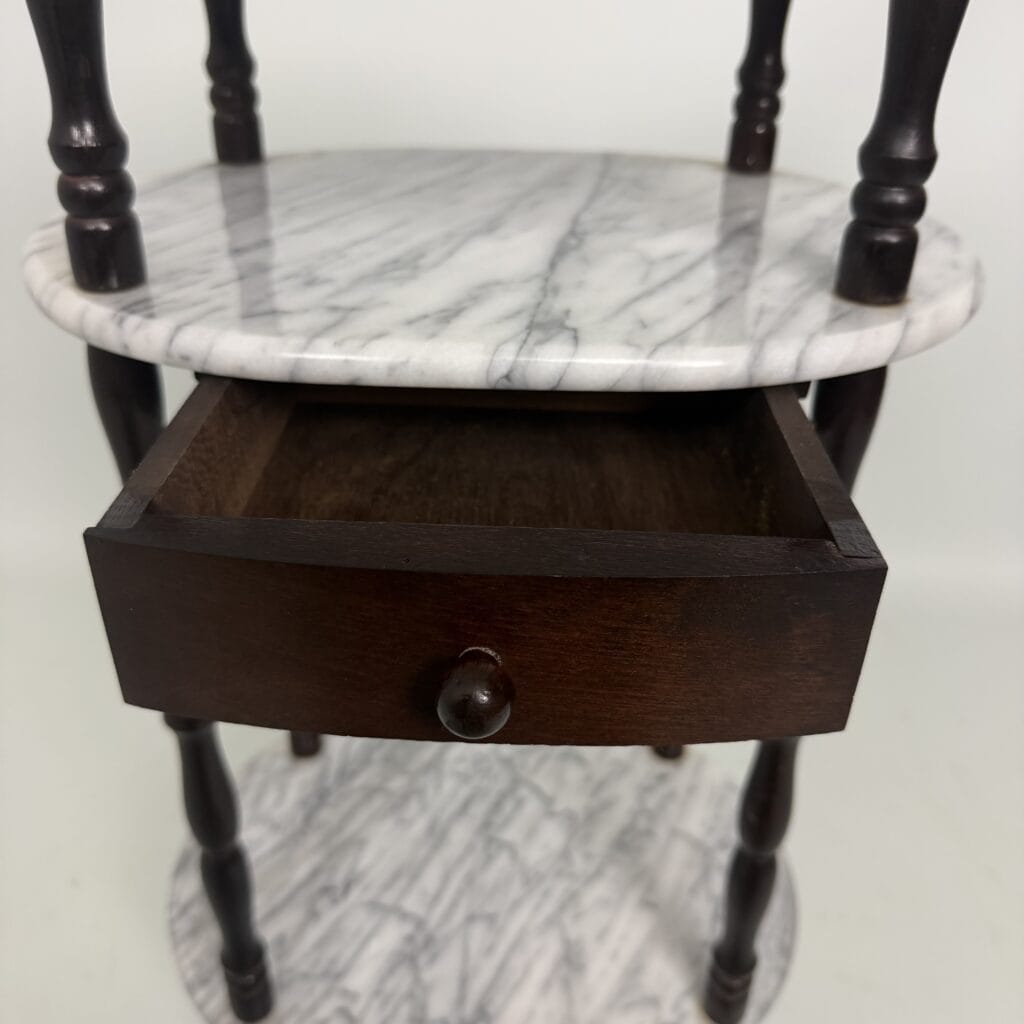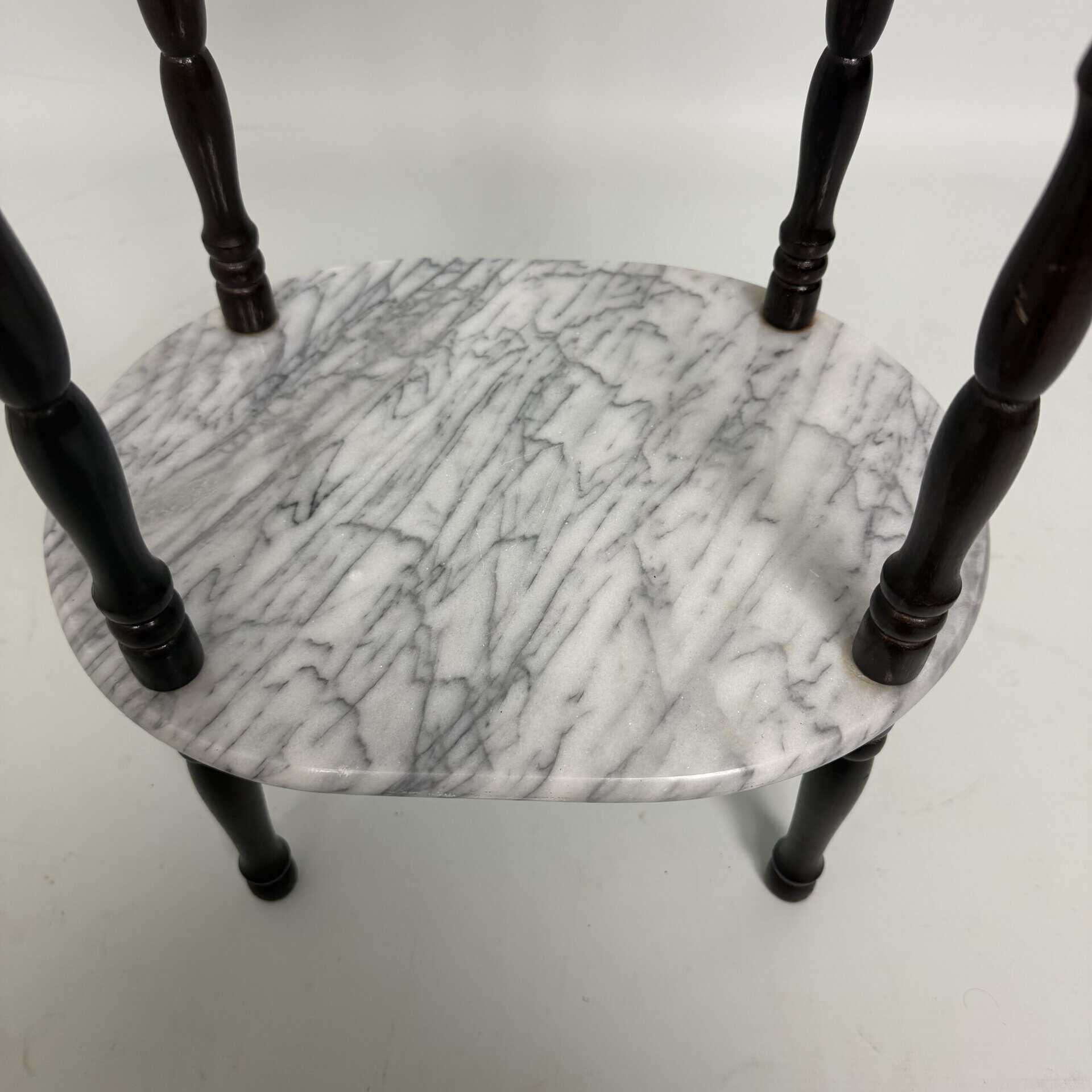 Side table with carrara marble shelves and dark wood turned legs