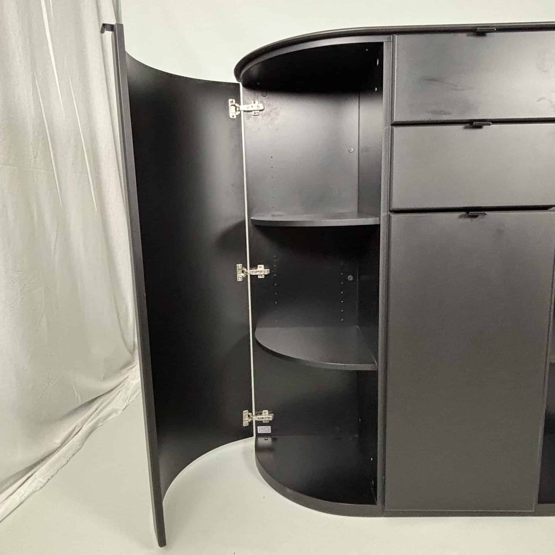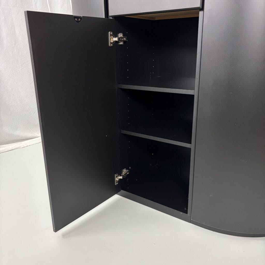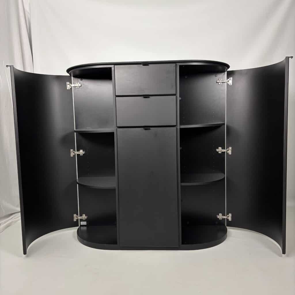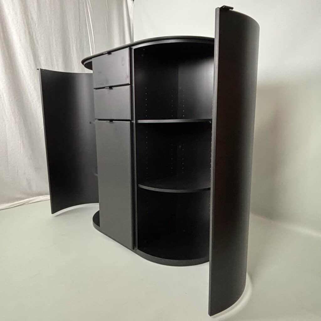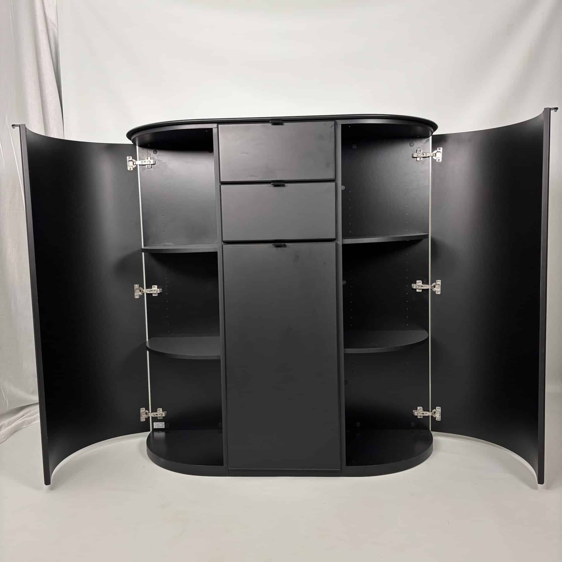 Symmetrical layout with central stack with 2 drawers and a tall door section, on each side there is a rounded side panel with several shelves on the inside