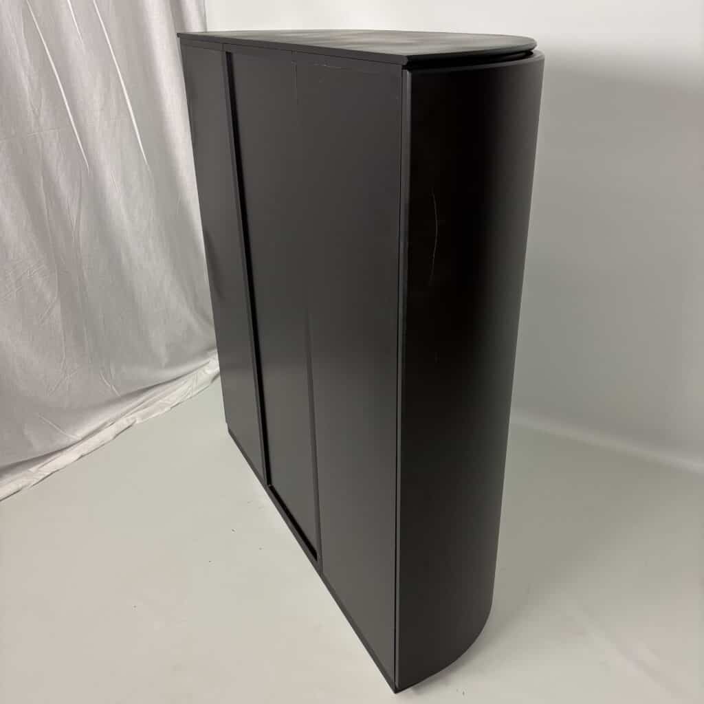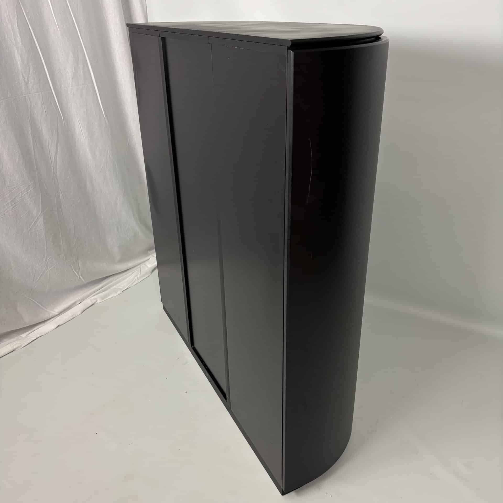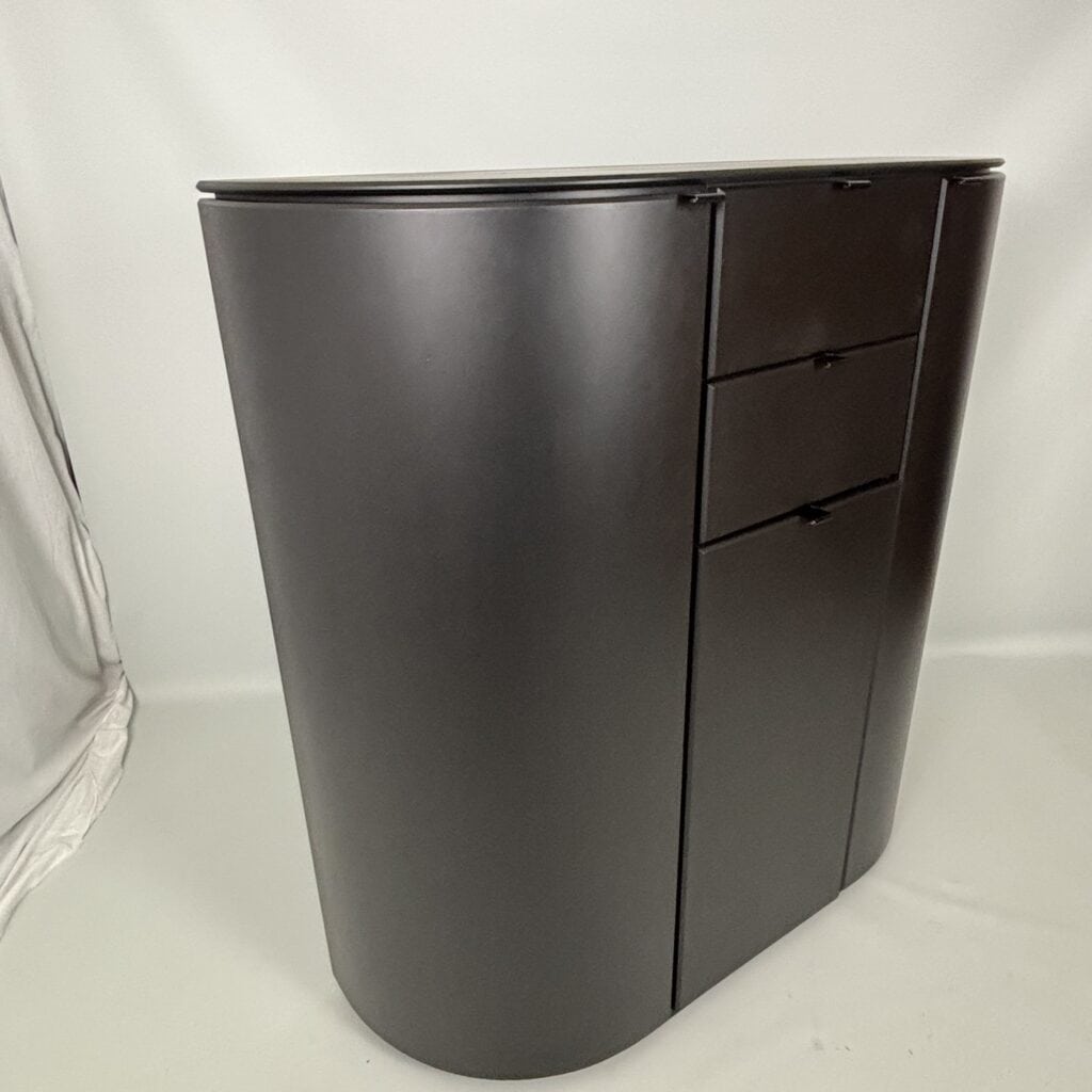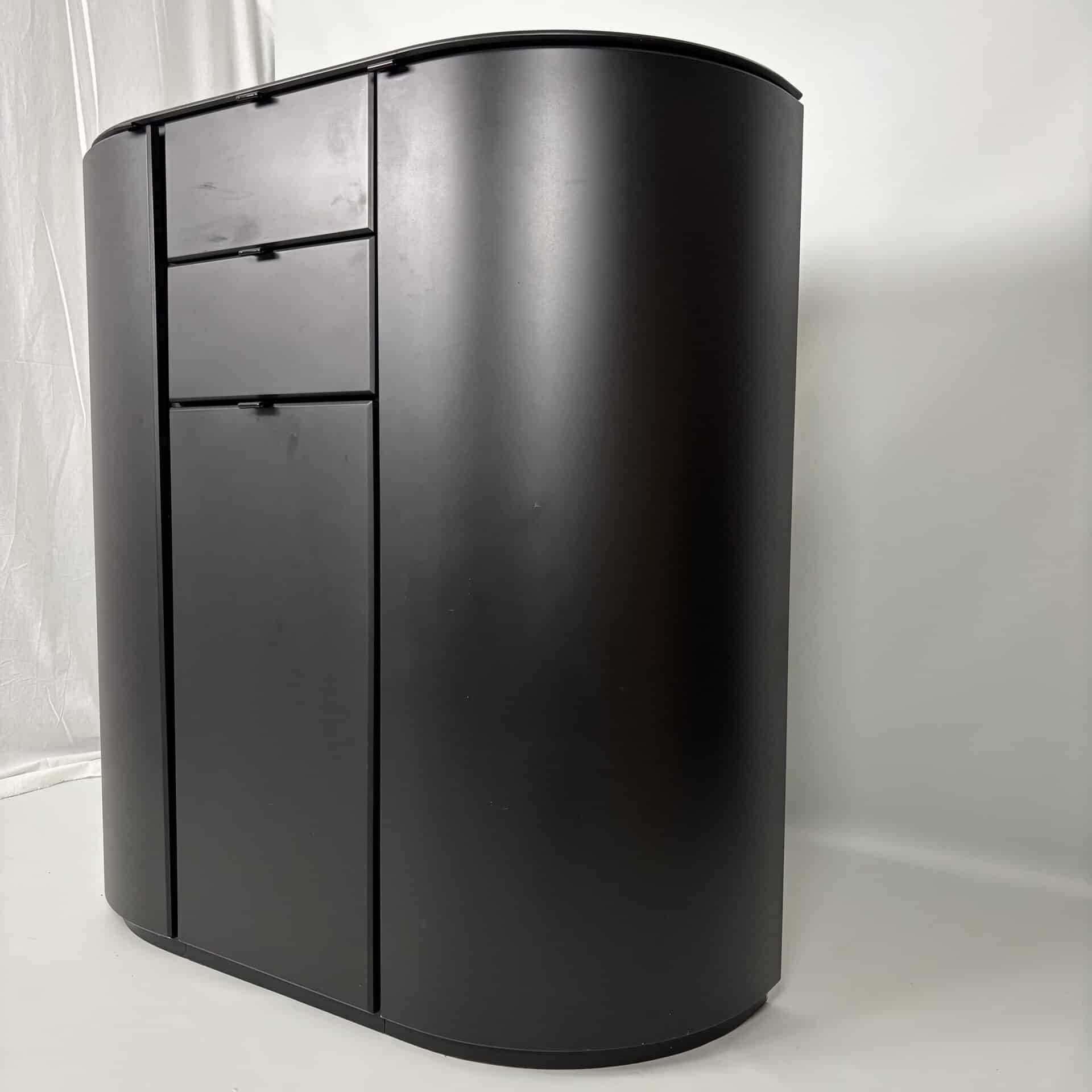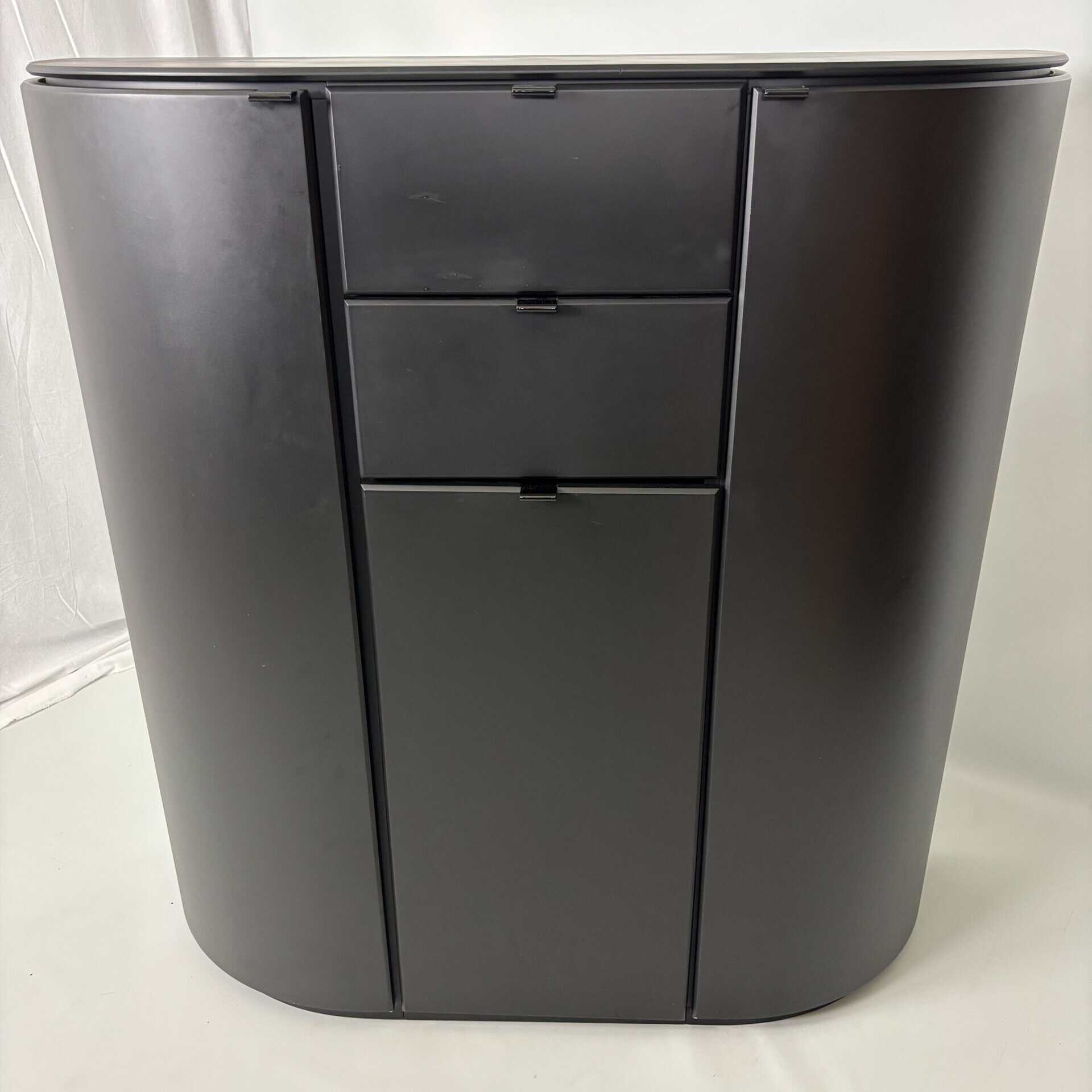 Symmetrical layout with central stack with 2 drawers and a tall door section, on each side there is a rounded side panel with several shelves on the inside