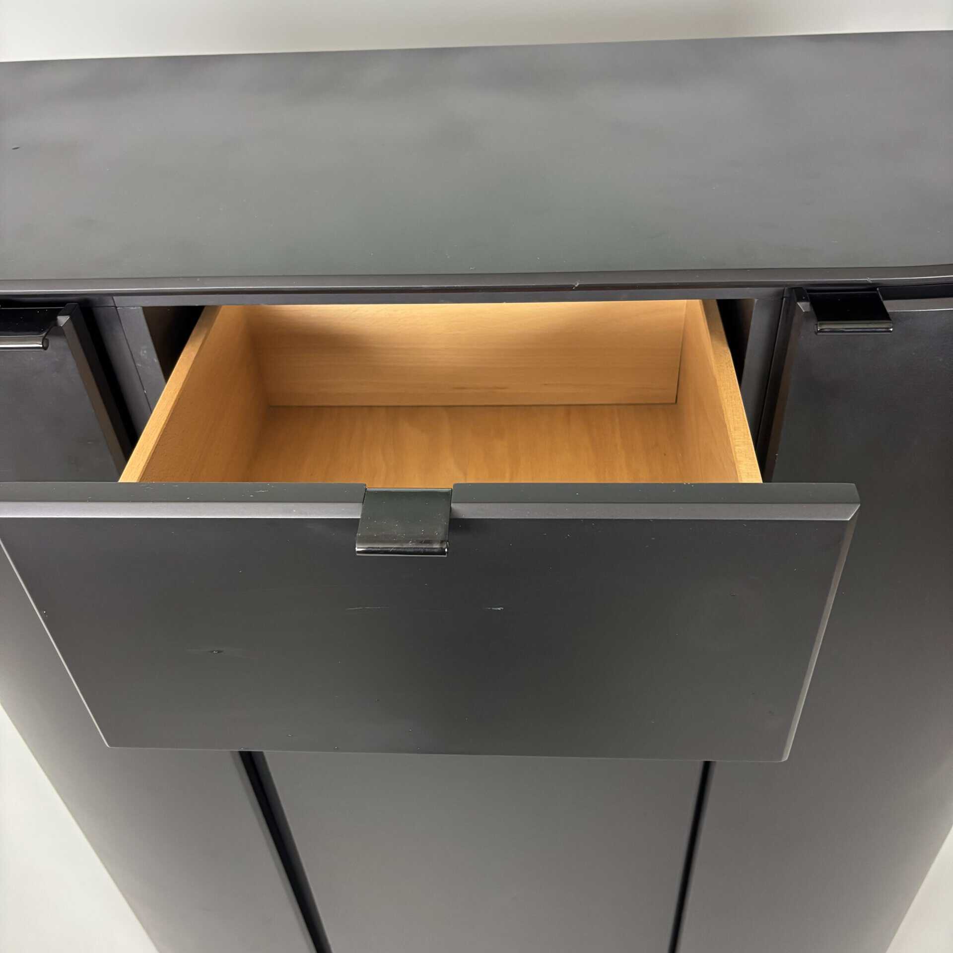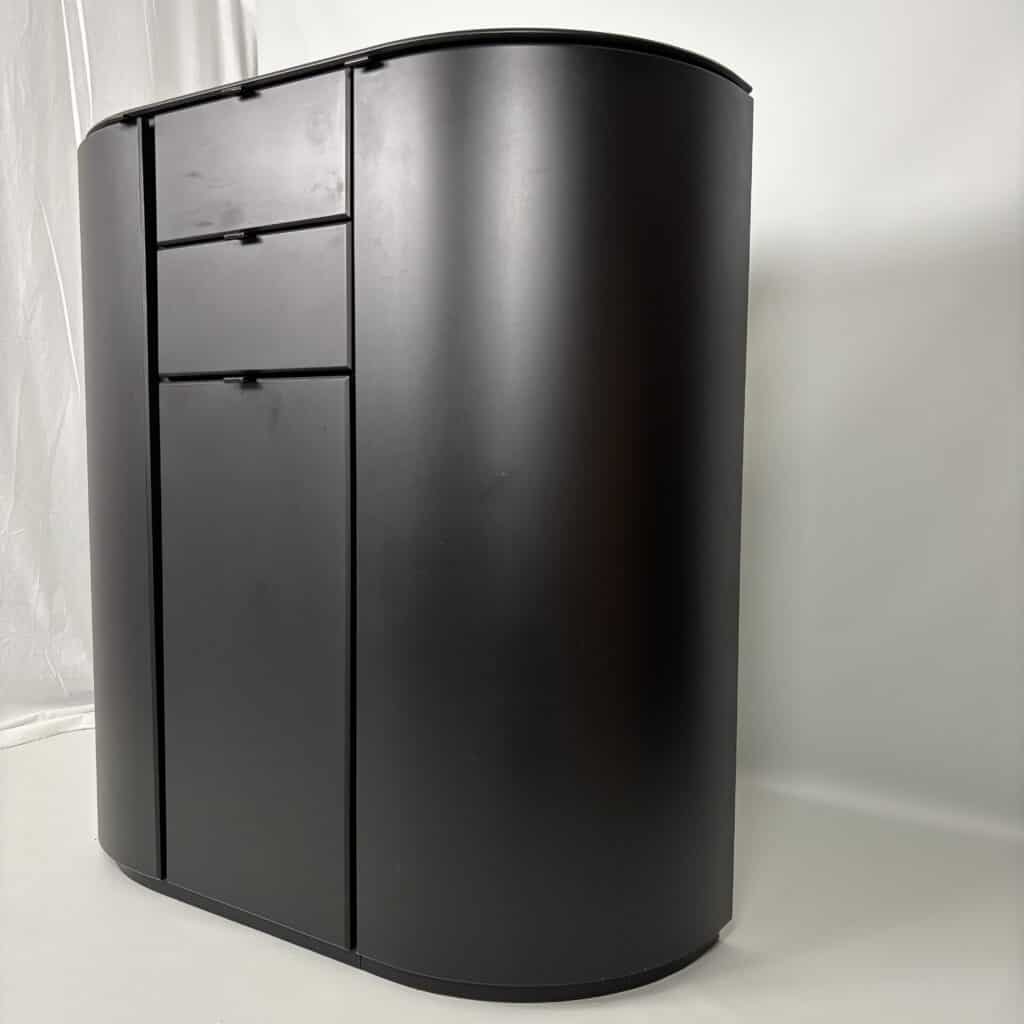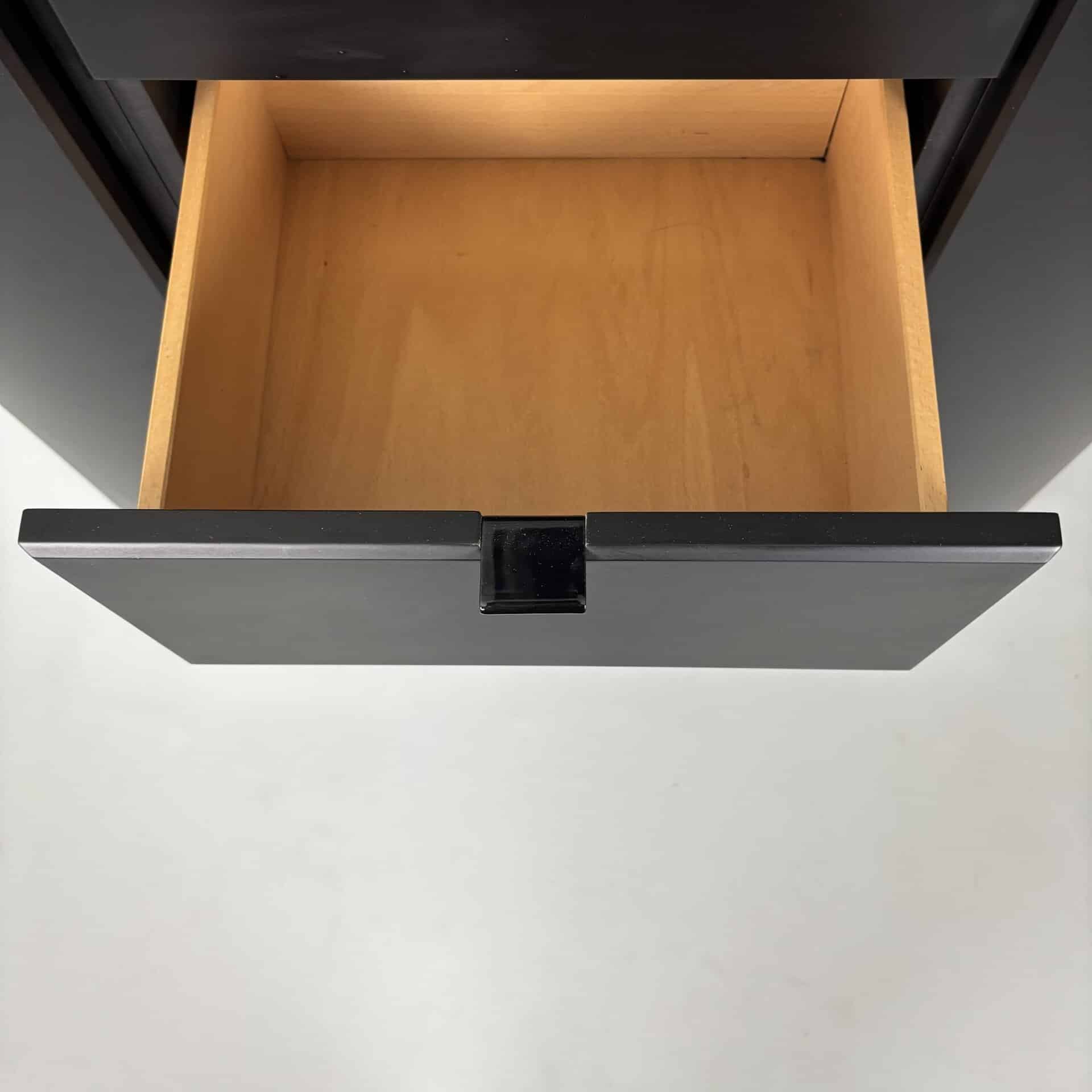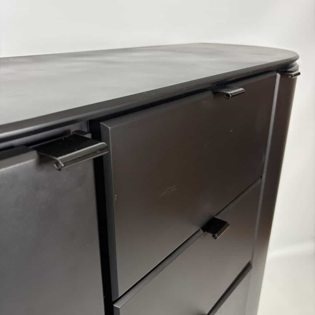 Cabinet in black lacquered MDF and minimal metal tab pulls