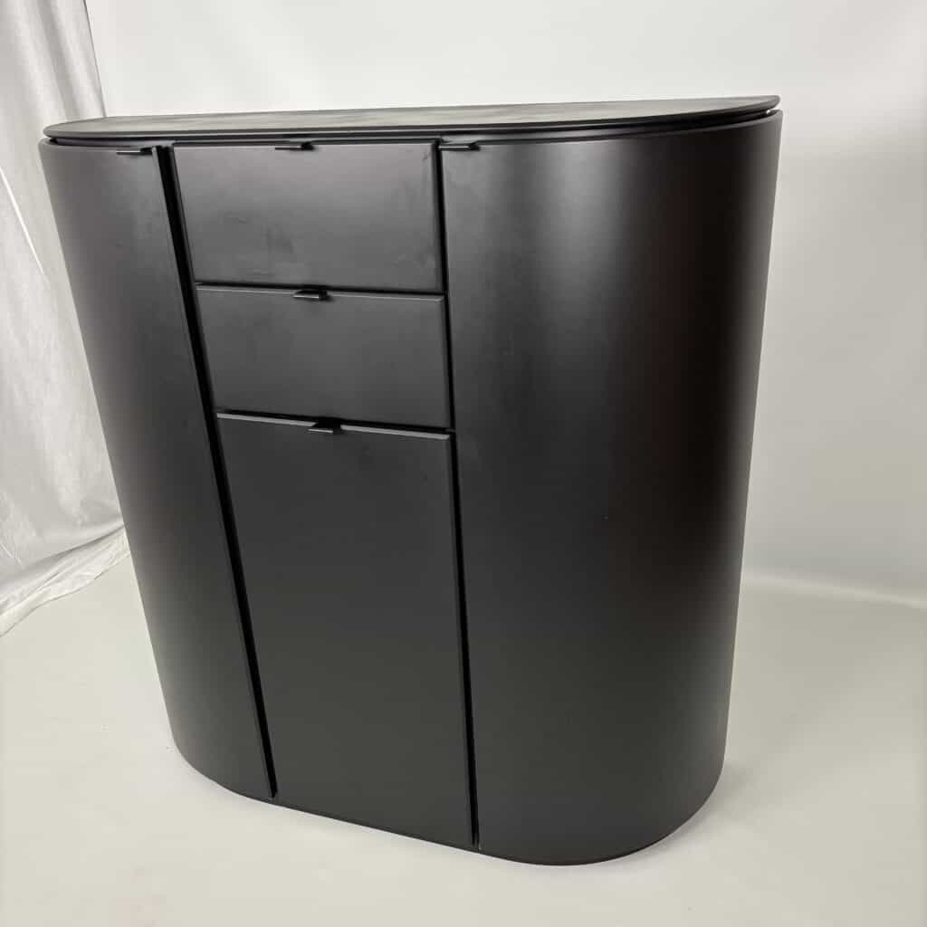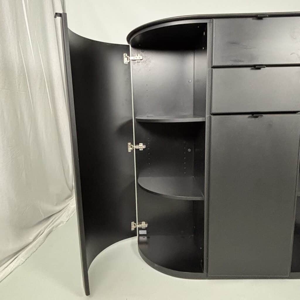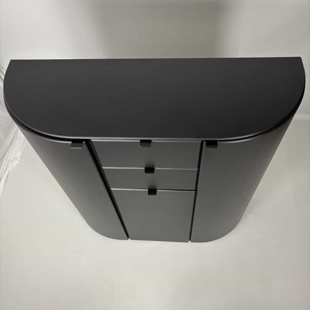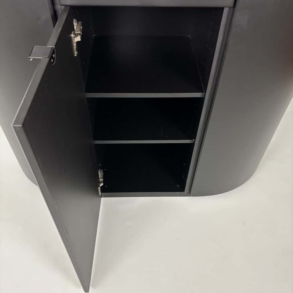 Cabinet in black lacquered MDF and minimal metal tab pulls
