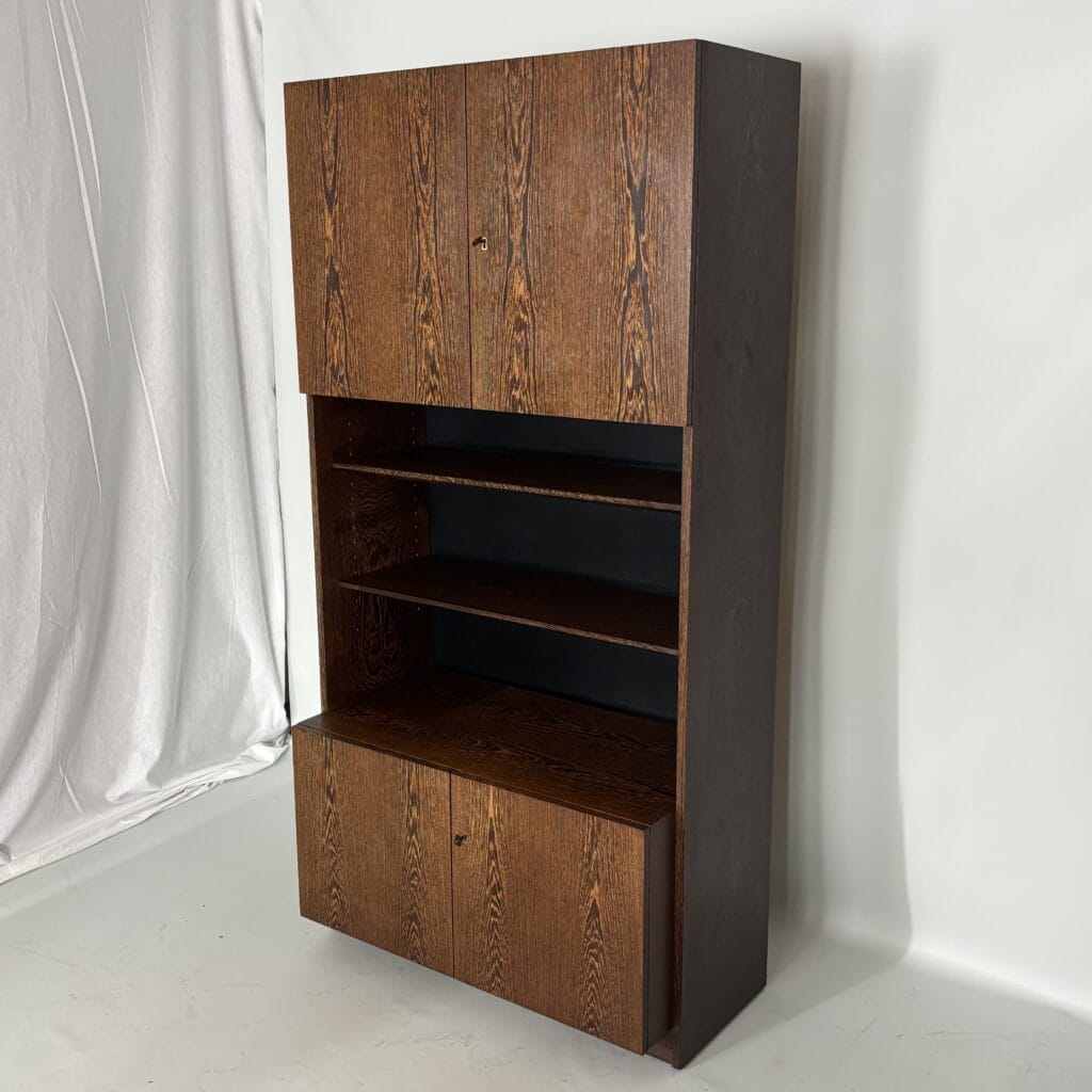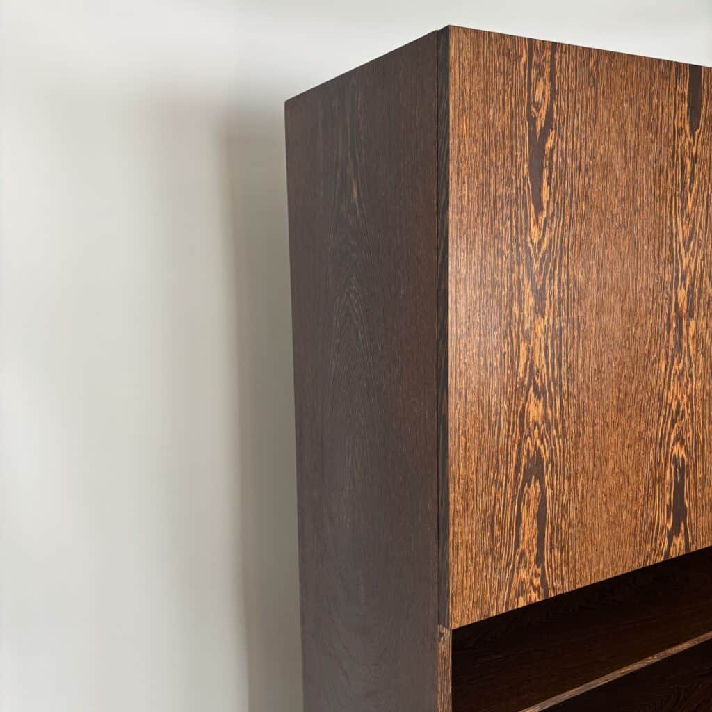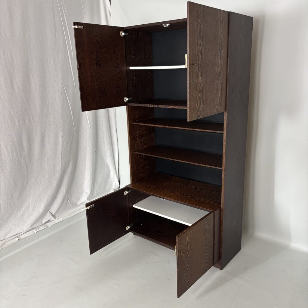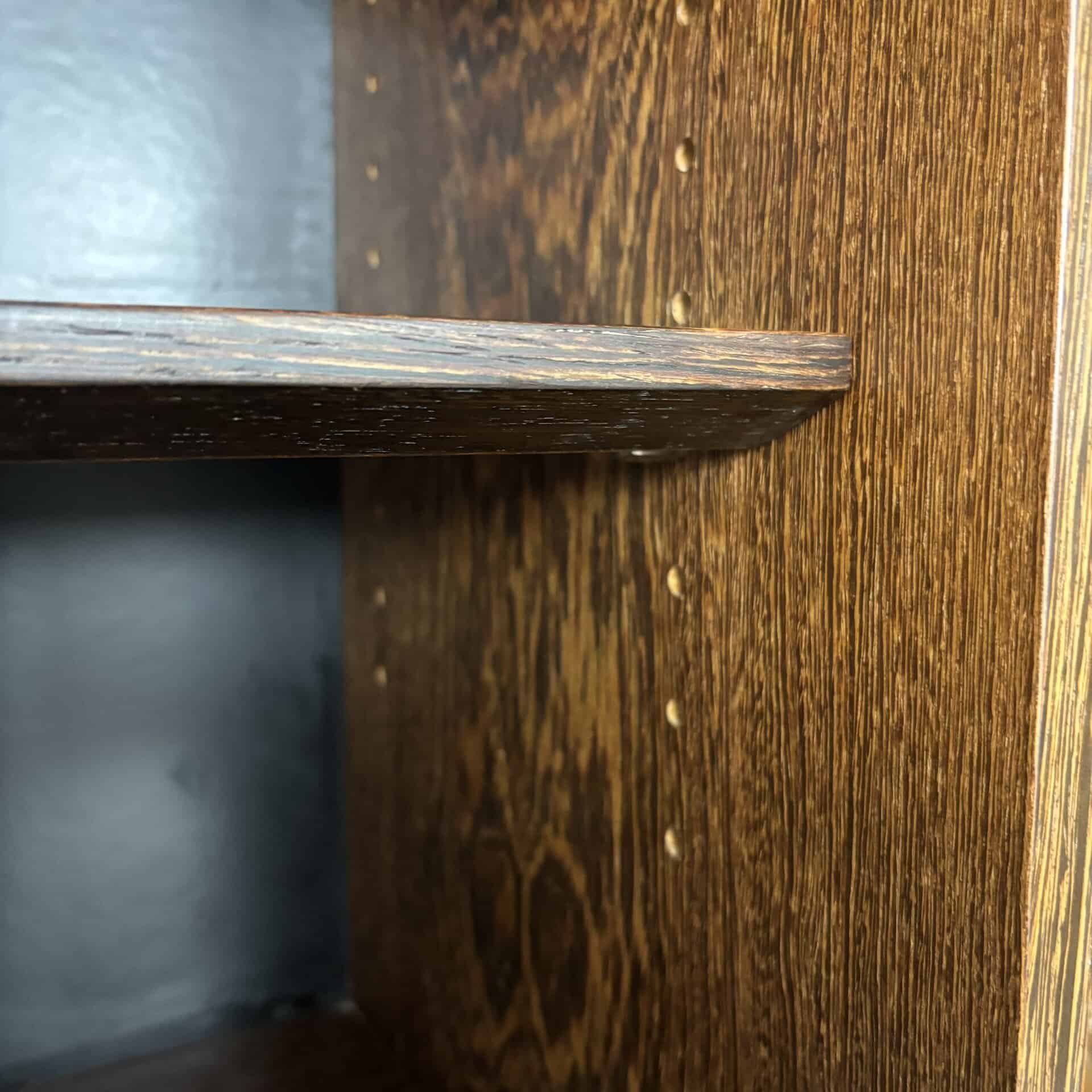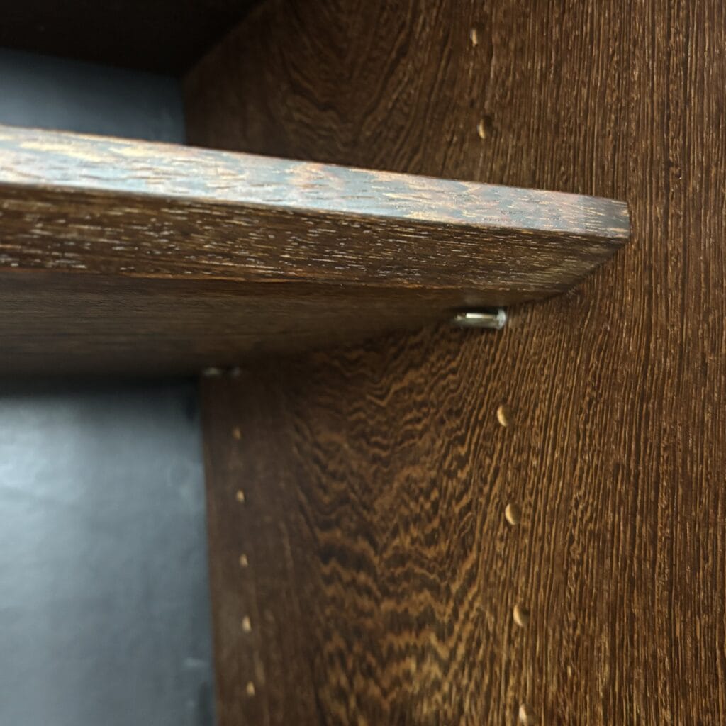 Veneered wood in quarter-sawn oak (also called tiger oak) with solid shelving and brass accents