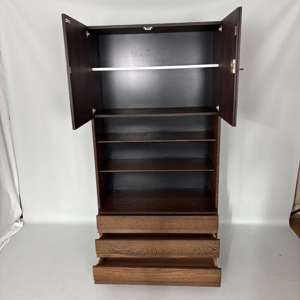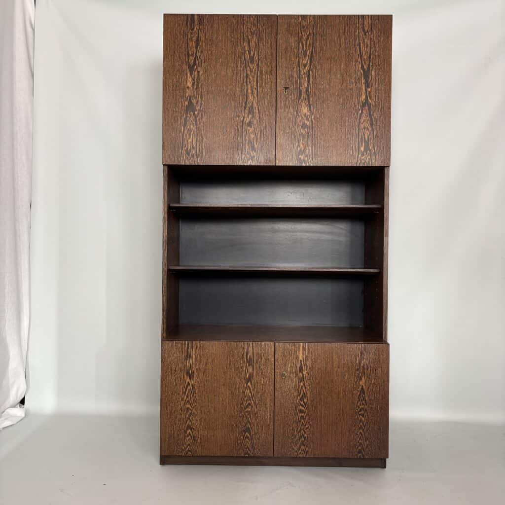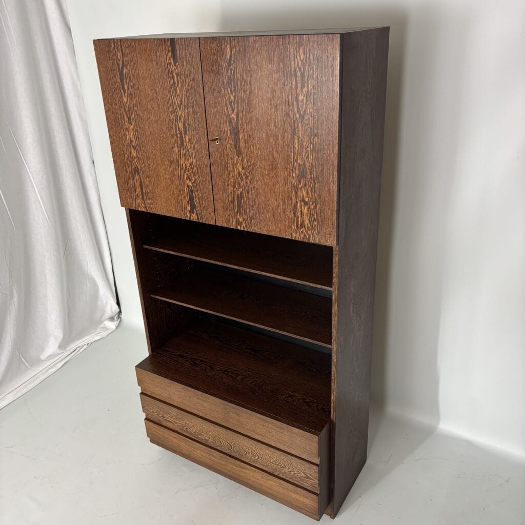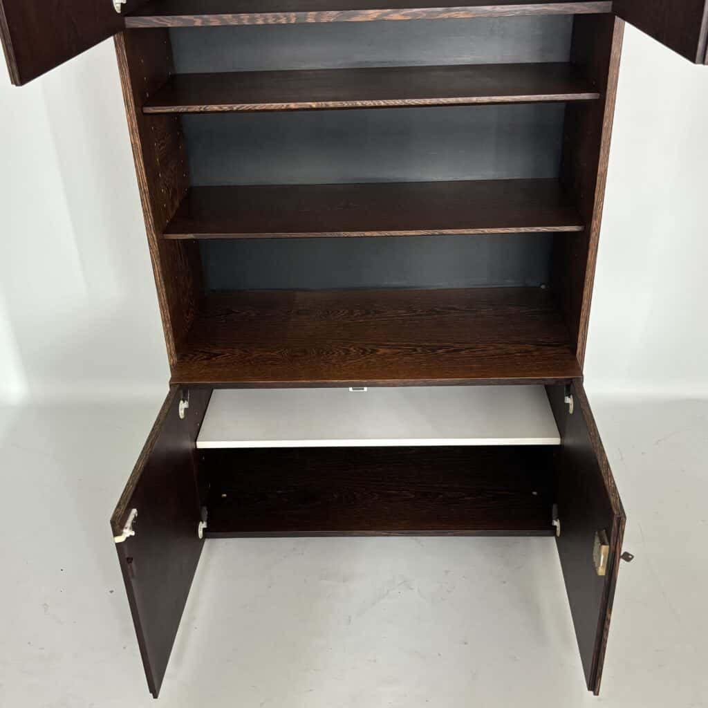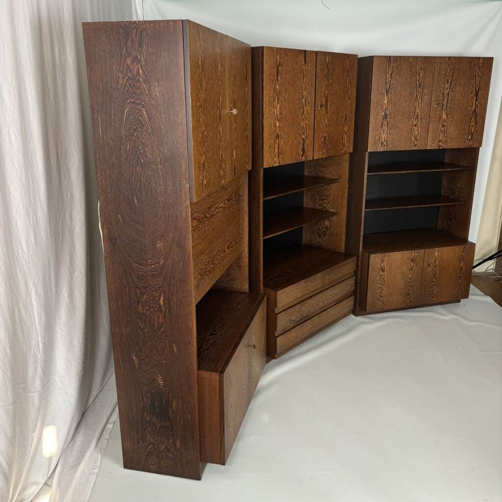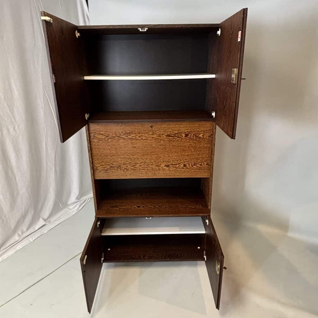 Veneered wood in quarter-sawn oak (also called tiger oak) with solid shelving and brass accents