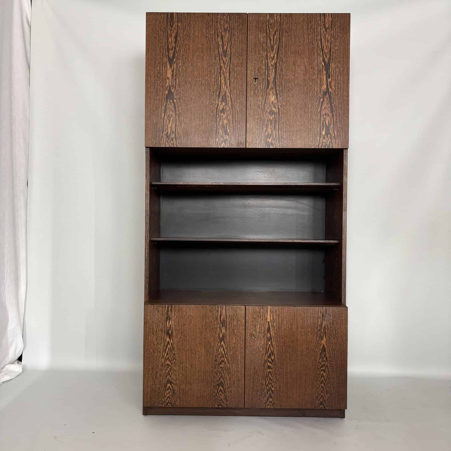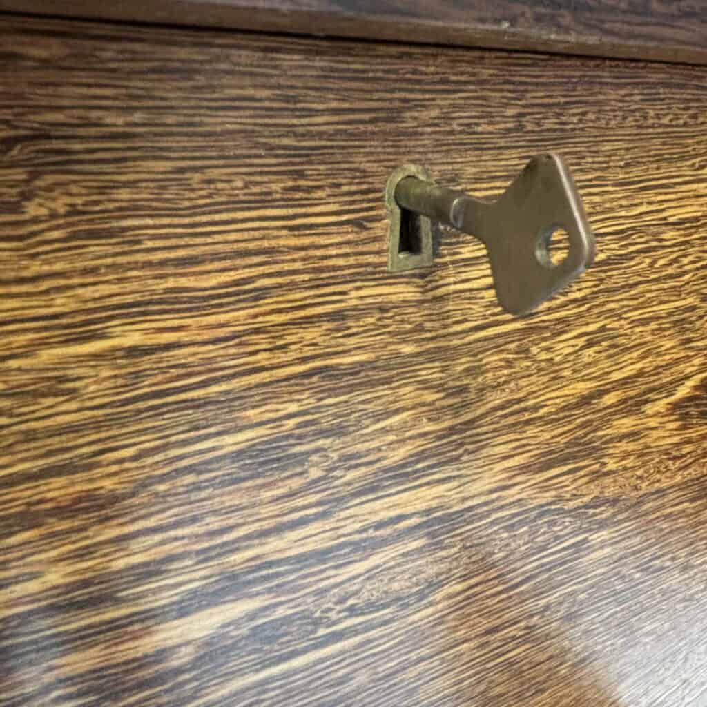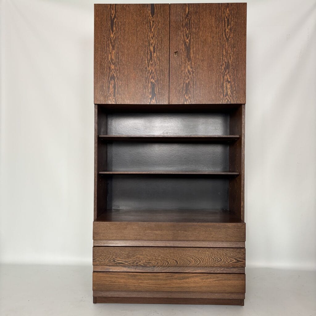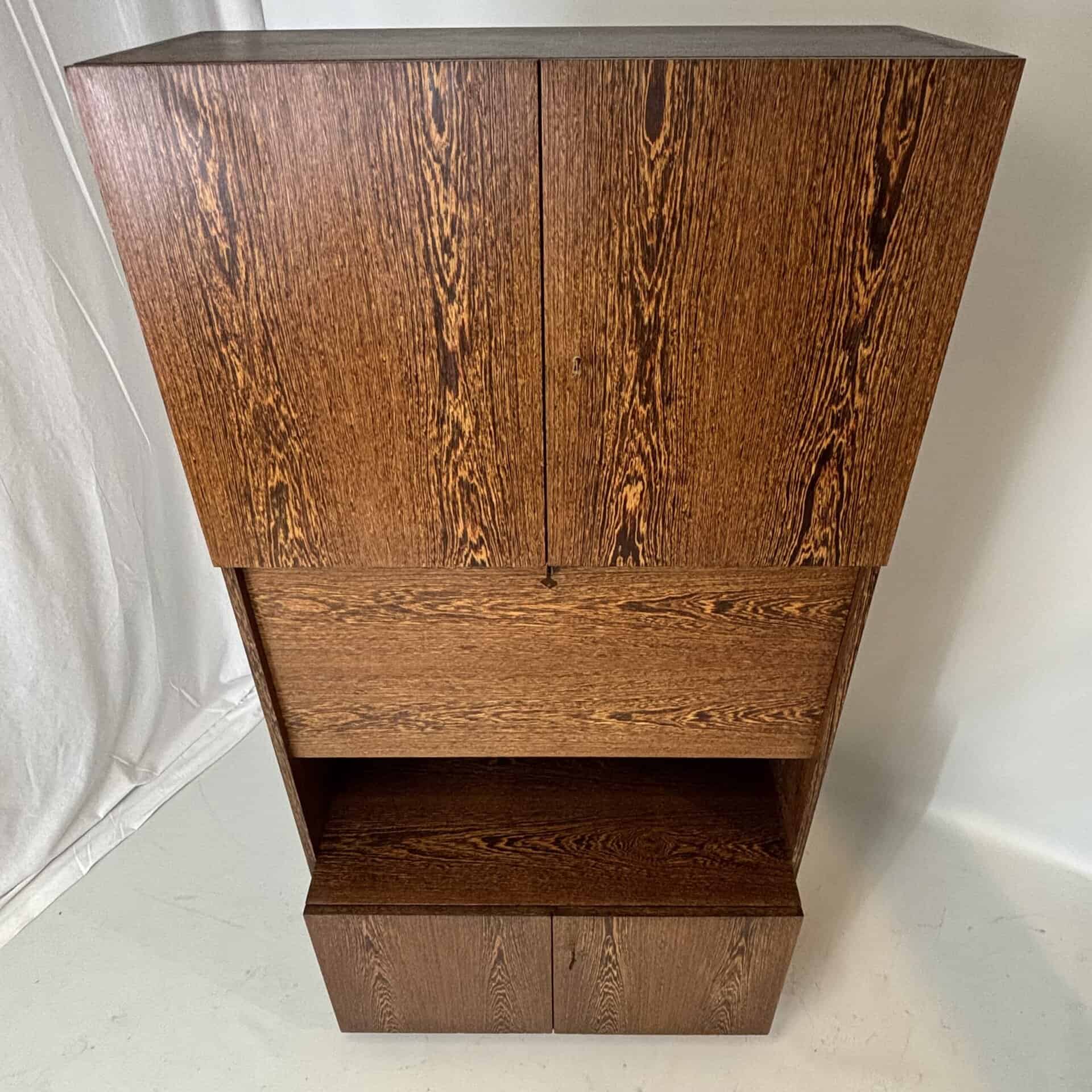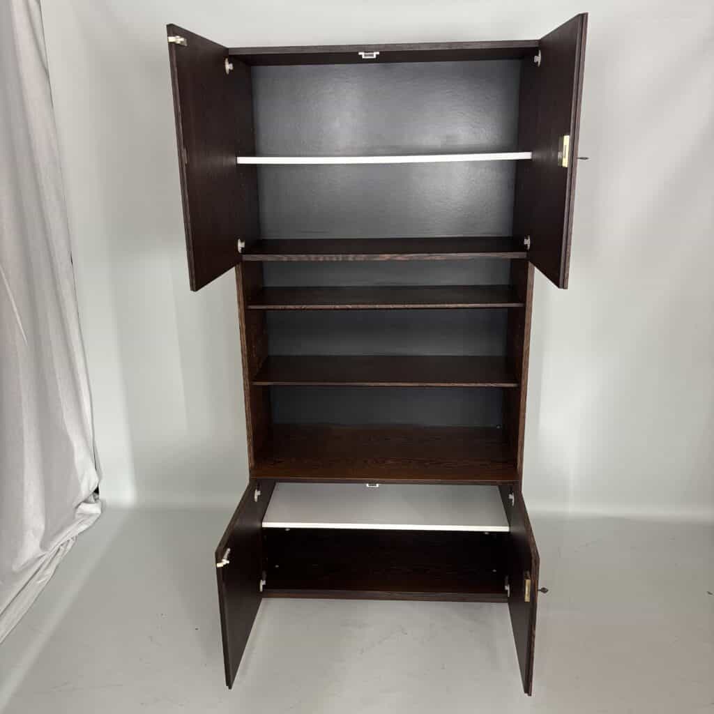 Veneered wood in quarter-sawn oak (also called tiger oak) with solid shelving and brass accents