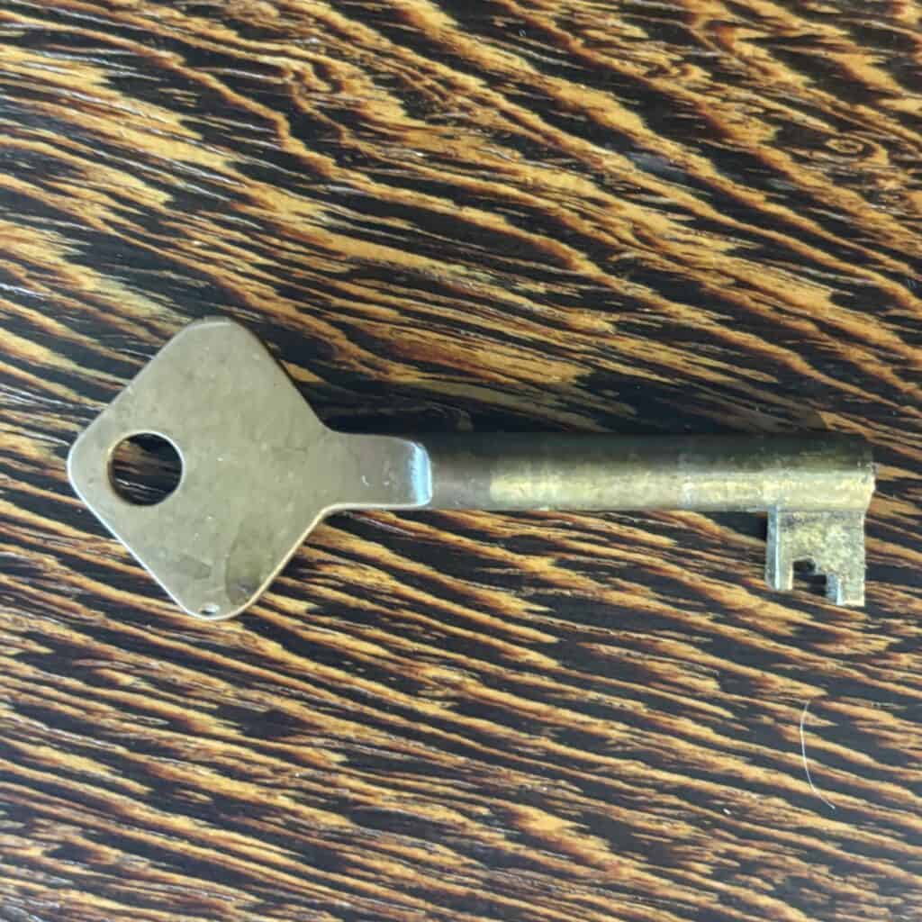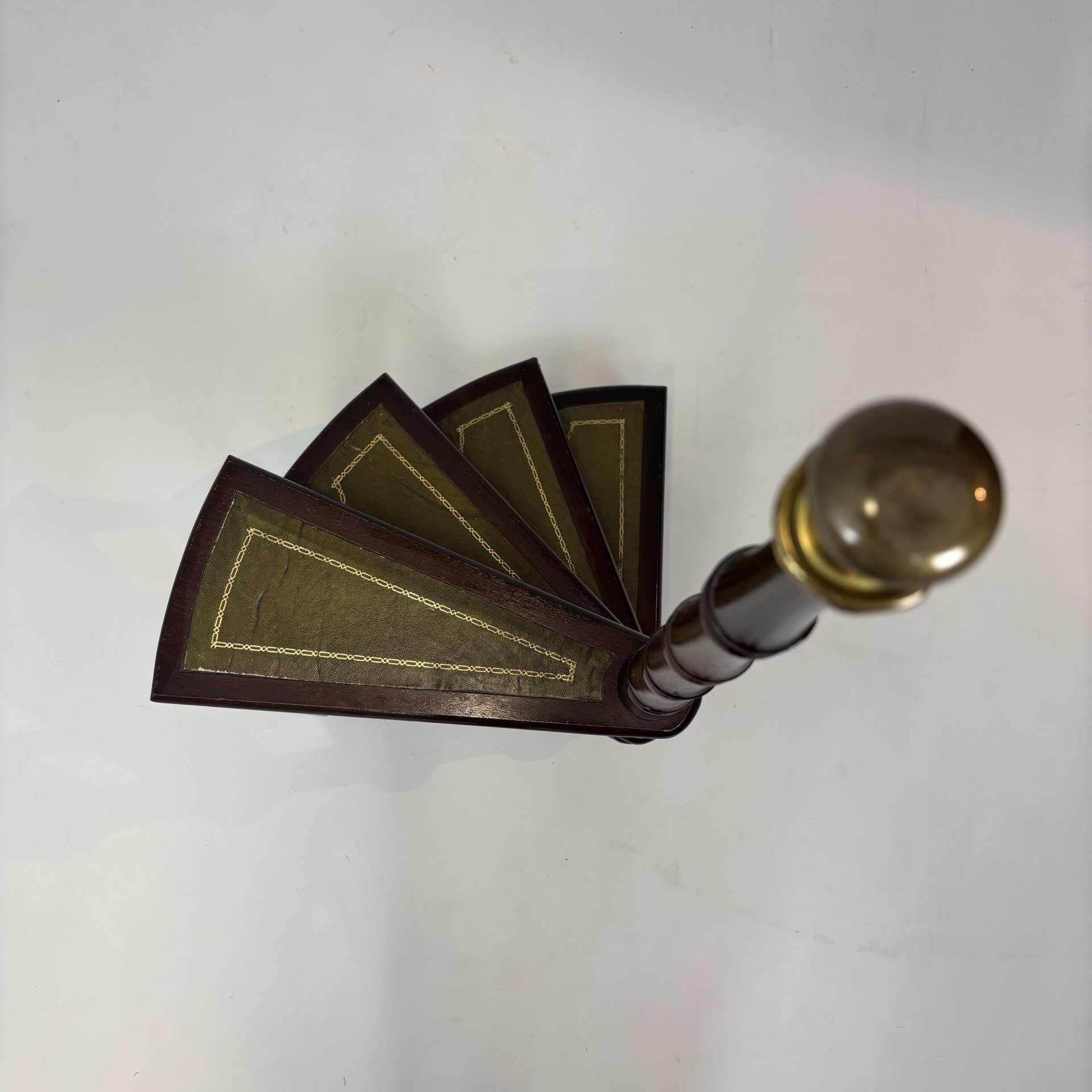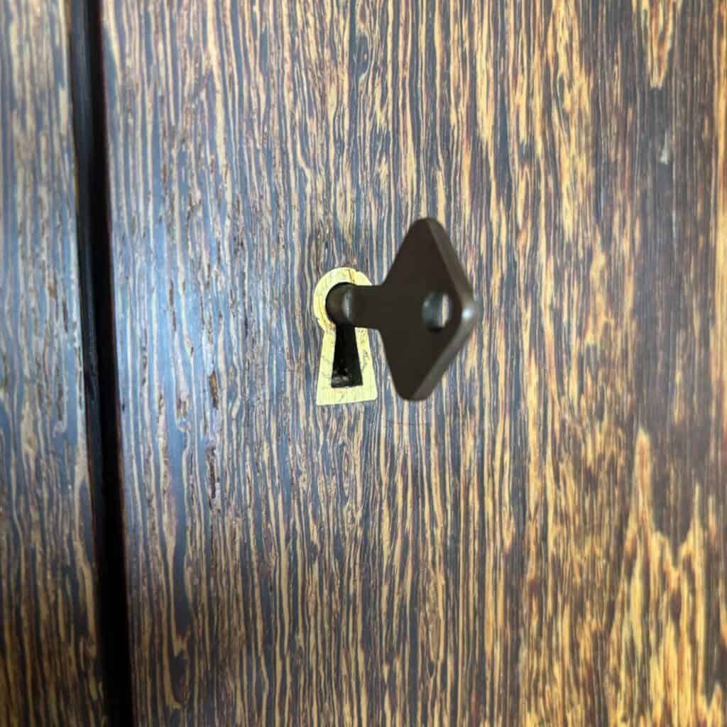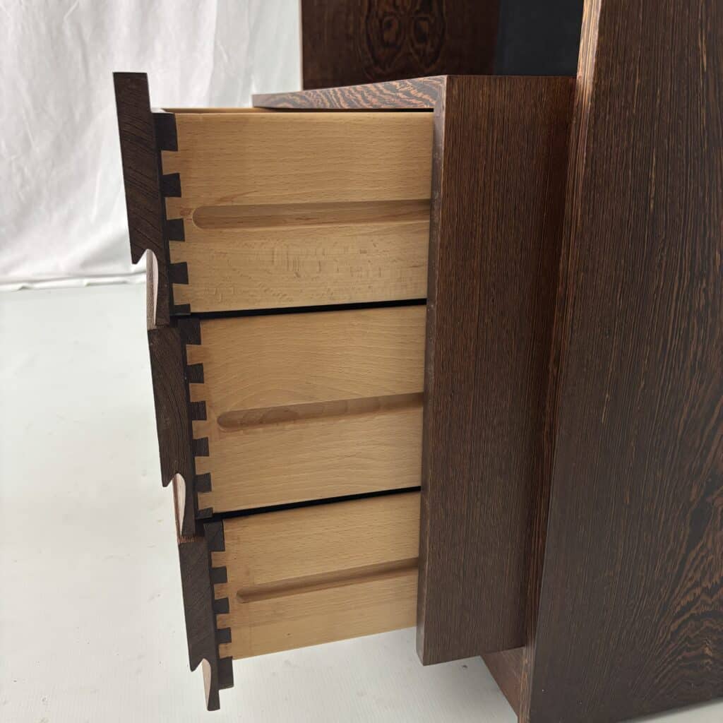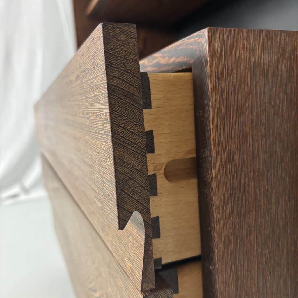 Veneered wood in quarter-sawn oak (also called tiger oak) with solid shelving and brass accents