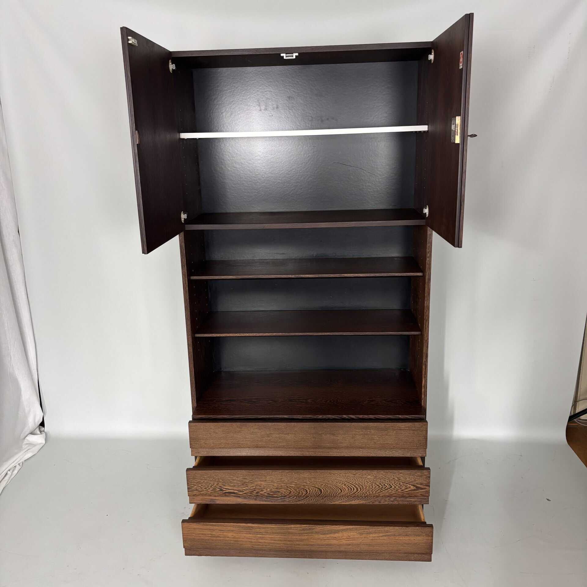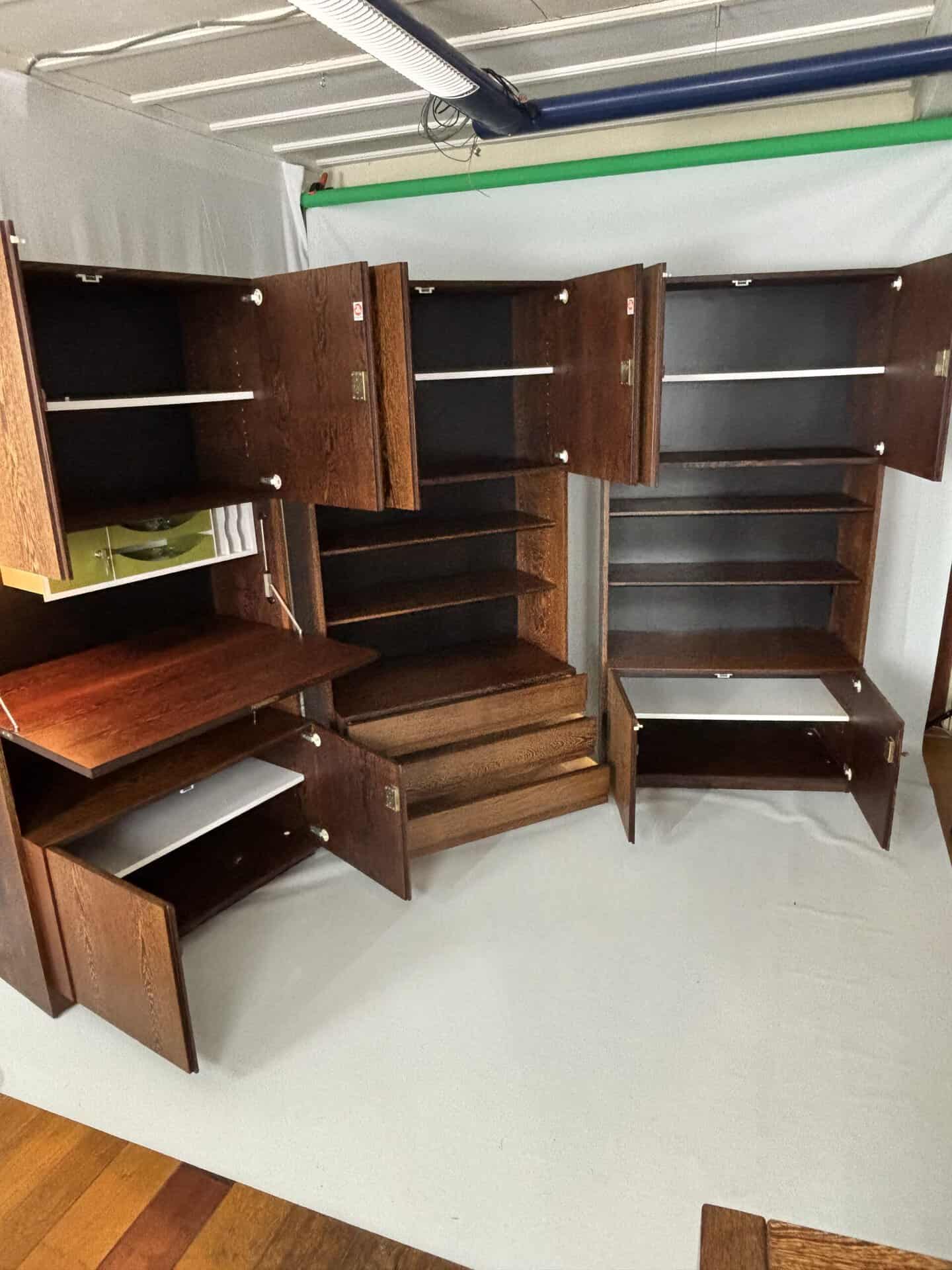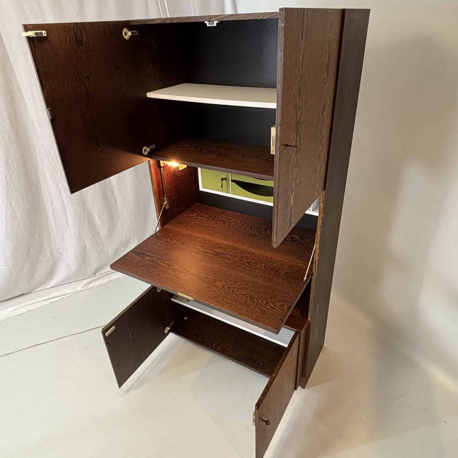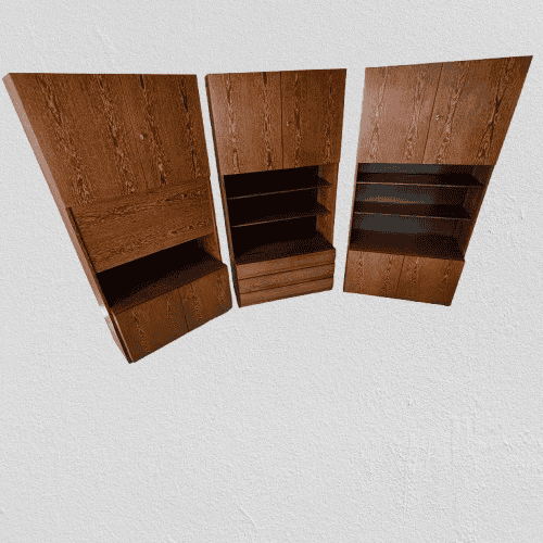One with 3 drawers. One with desk, safe and integrated light. One with shelves and cupboards above/below