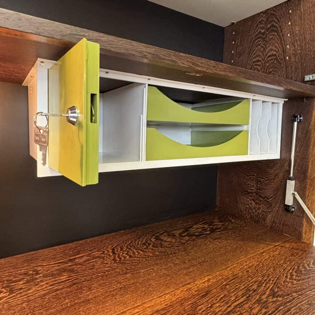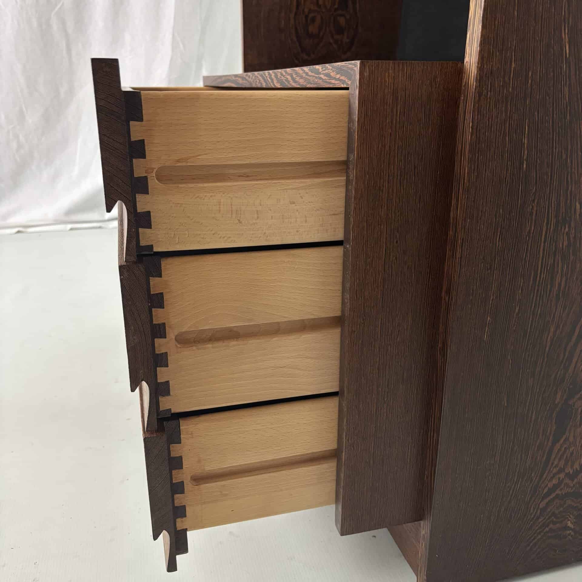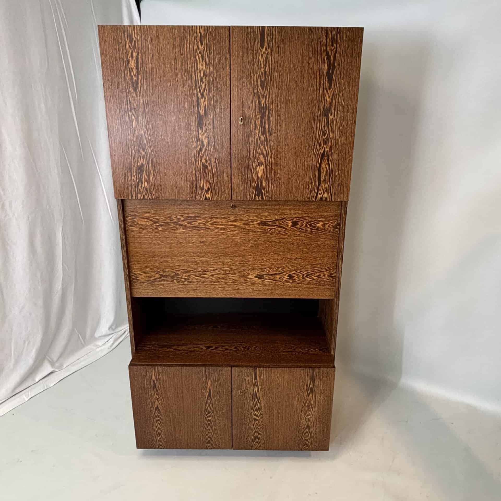 One with 3 drawers. One with desk, safe and integrated light. One with shelves and cupboards above/below